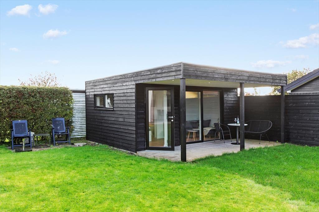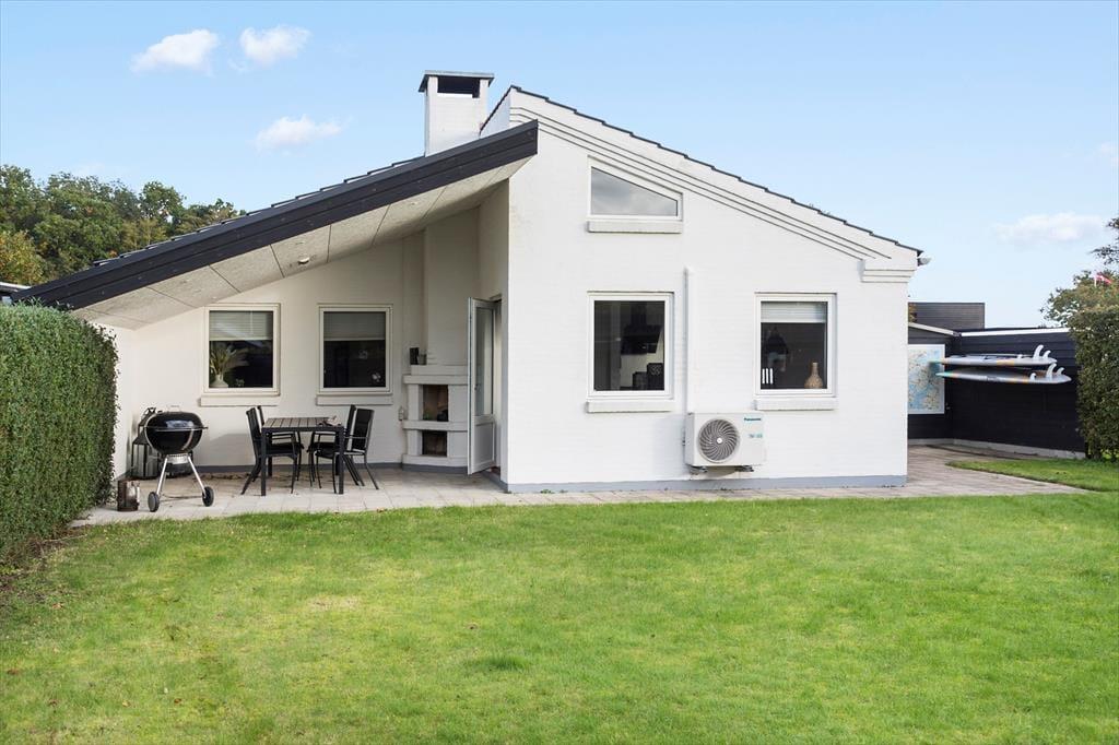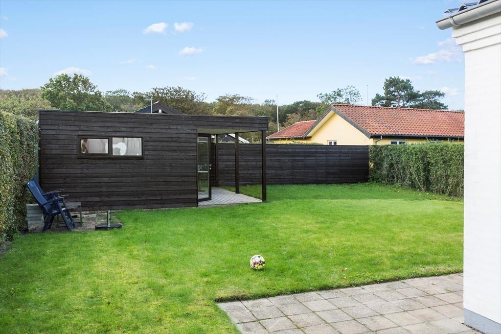 Baghaven er en dejlig privat oase med hæk og plankeværk ind mod naboerne og ud mod vejen. Der er en græsplæne, hvor I kan spille vikingespil og lege med hunden, hvis I har sådan én med på ferie. Terrassen er sydvendt og delvist overdækket, og den er udstyret med en grill, gode havemøbler og liggestole, så med andre ord er den perfekt til det udendørs driverliv både morgen, middag og aften.