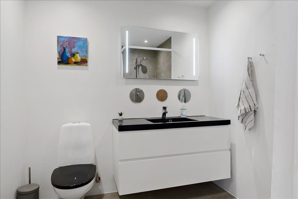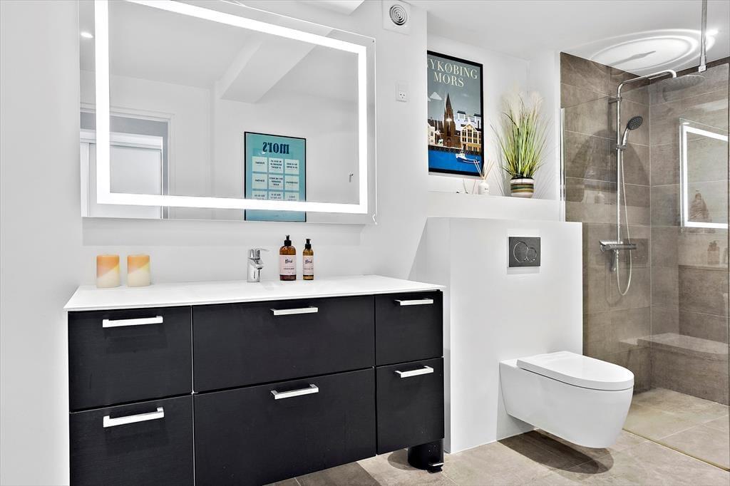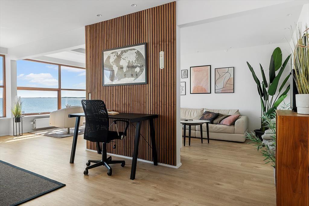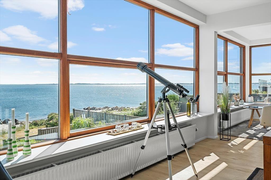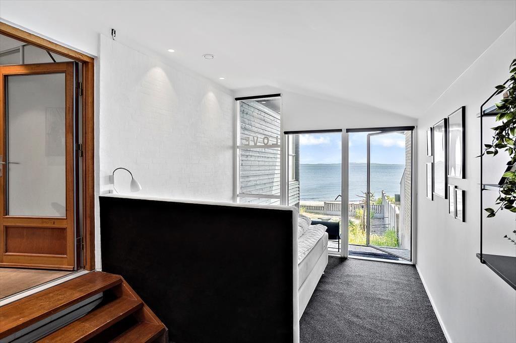 Her på adressen har I uhindret udsigt til Limfjorden, lige fra I slår øjnene op om morgenen, for flere af soveværelserne vender ud mod vandet. Og igennem dagen er det storslåede kystlandskab det smukkest tænkelige bagtæppe i husets opholdsafdeling. Selve sommerhuset er bestemt også værd at bemærke, for både stueplan og underetagen er lækkert indrettet med moderne møblement af ordentlig kvalitet. I stueplanet er det især den store opholdsafdeling, der imponerer – ikke kun på grund af fjordudsigten, men også på grund af det gennemstrømmende lysindfald og den velfungerende åbne planløsning mellem køkken, spisestue og opholdsstue. Et badeværelse ligger også på etagen, og fra entréen fører en trappe få trin ned til et soveværelse med fjordudsigt og direkte adgang til haven. I underetagen finder I endnu et badeværelse, et bryggers og et aktivitetsrum med bordfodbold. Tre soveværelser er her også, og ligesom soveværelset i stueplan er de indrettet med dobbeltseng (tre senge måler 180 cm og den fjerde 140 cm).