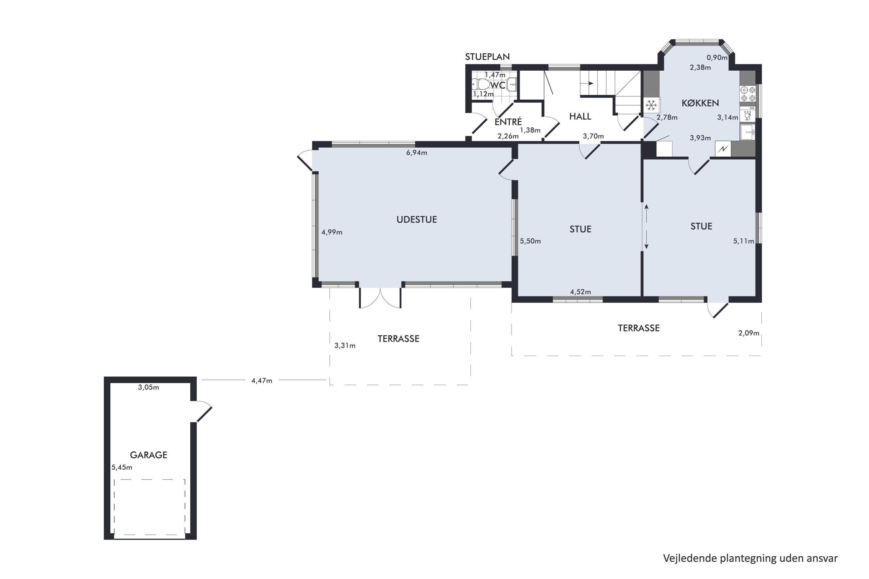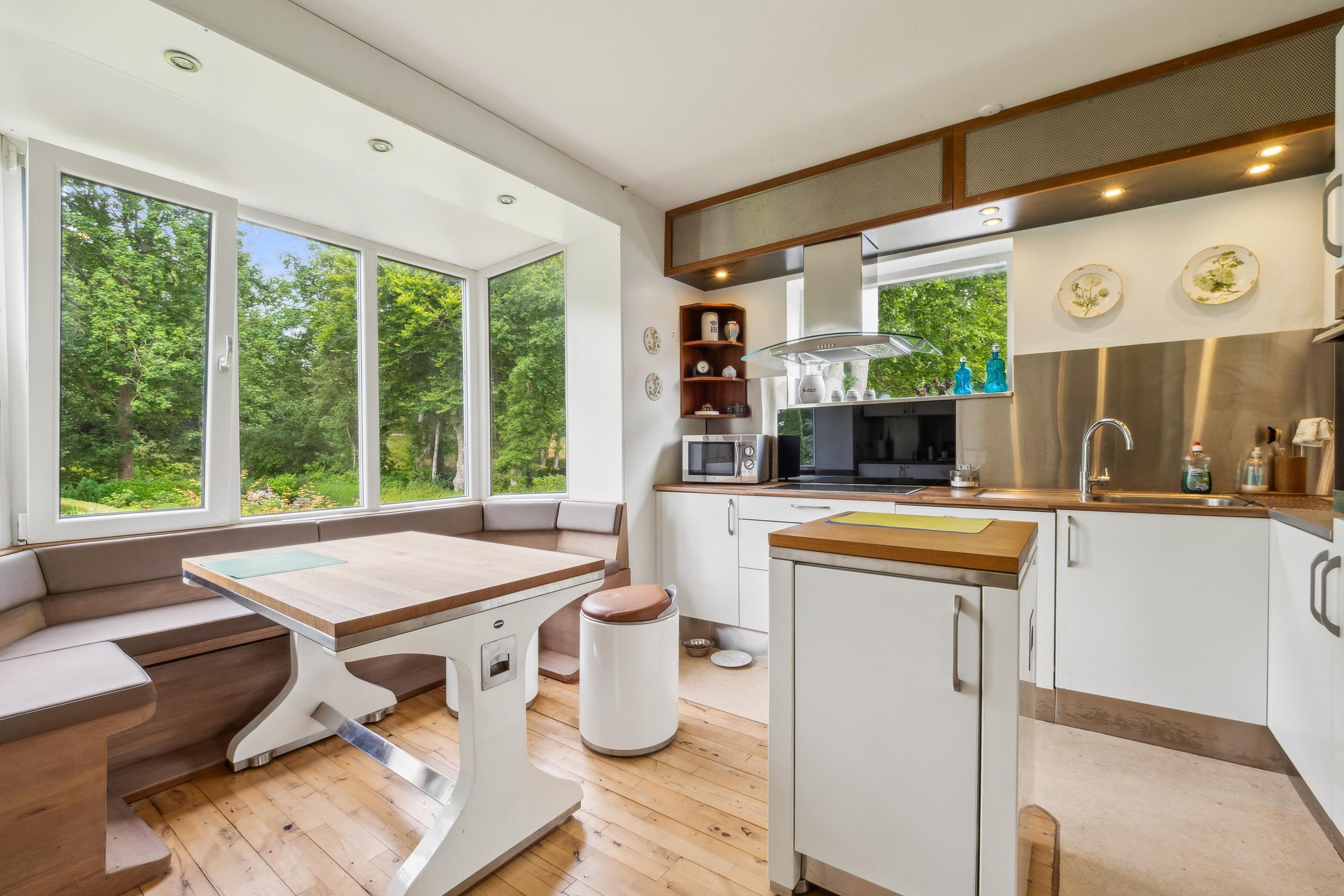 Fra udestuen er der direkte adgang til en solrig terrasse, hvor eksempelvis morgenmaden kan nydes i fredelige omgivelser. Huset er velindrettet med alt, hvad man har brug for til et afslappende ophold.
