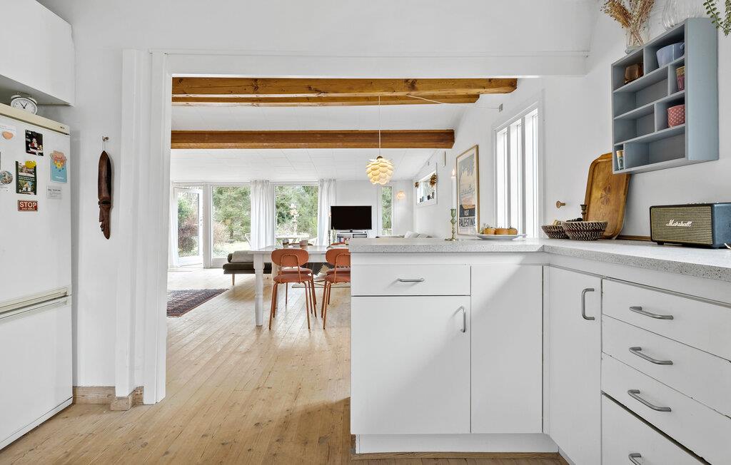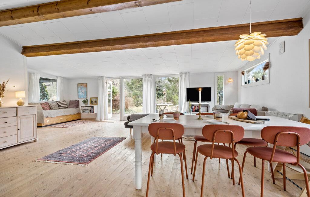 Huset ligger i fredelige omgivelser tæt på Nykøbing og Kattegat, så her får I den perfekte base for en ferie med fred, ro og masser af gode oplevelser i naturen. Huset er rummeligt, og indretningen fremtræder virkelig flot med lyse farver, gode møbler og massive træbjælker, der skaber en rar atmosfære, man virkelig kan slappe af i. På de lidt køligere dage kan I gøre det ekstra hyggeligt og tænde op i brændeovnen, der giver varme til madlavningen, fællesmåltiderne og hyggen i stuen henunder aftenen.
