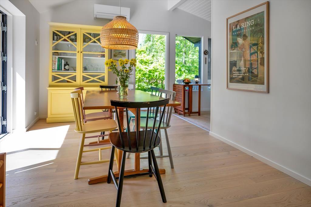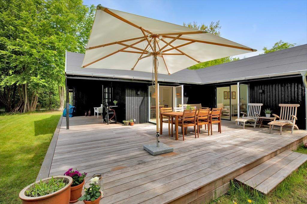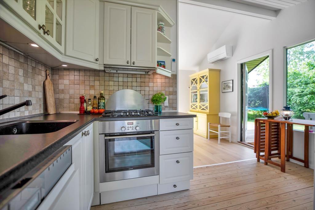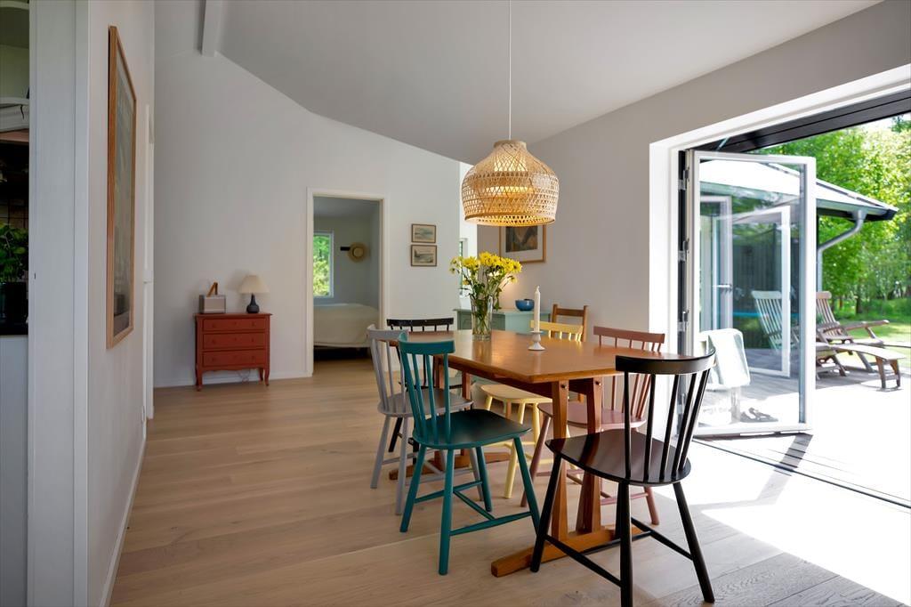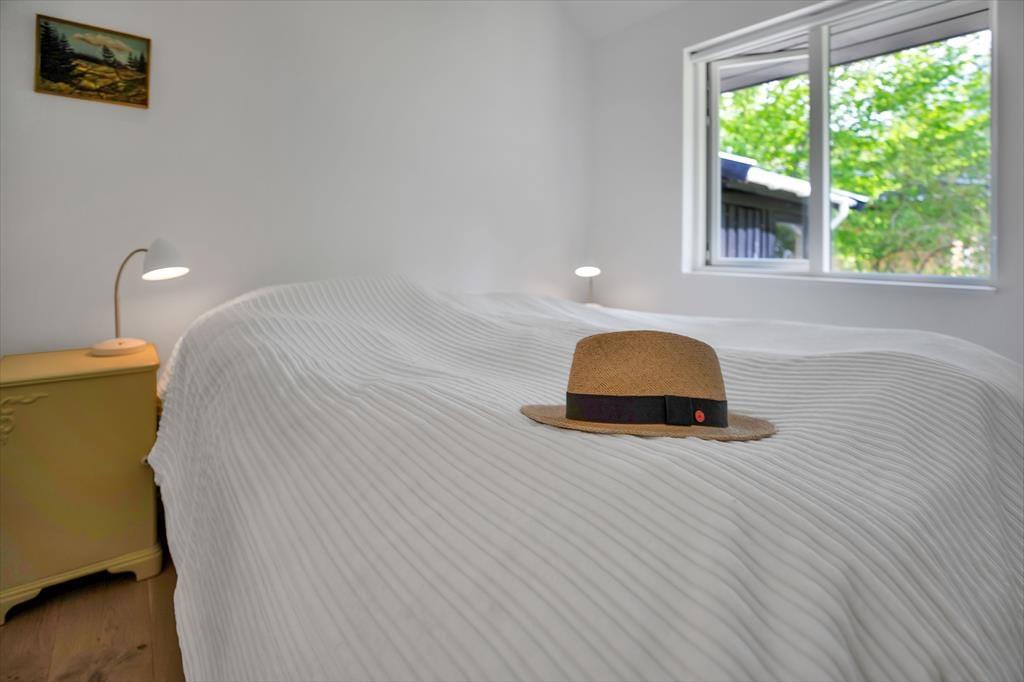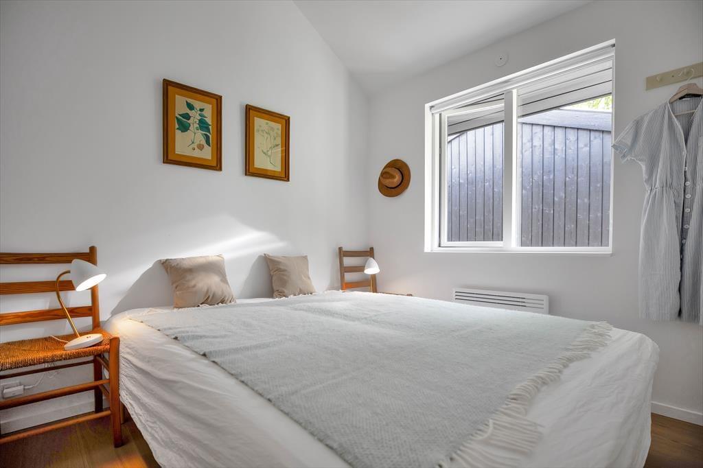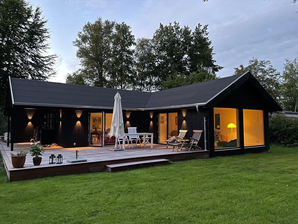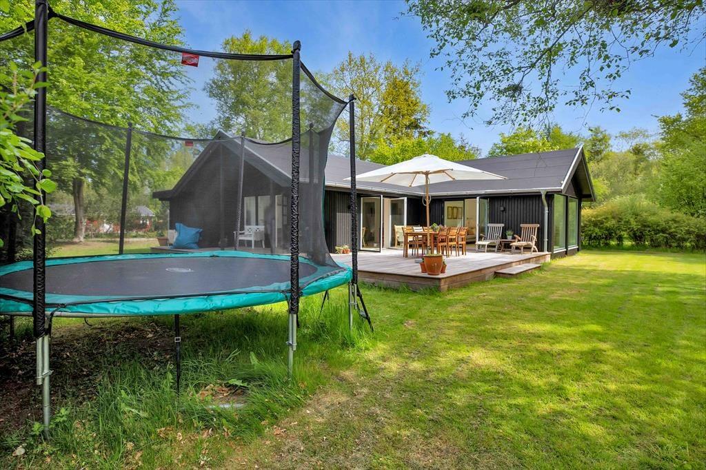 Huset er indrettet med en stor, åben stue med store vinduer der giver et fantastisk lysindfald og udgang til den skønne åbne terrasse, hvorfra I kan nyde naturen. Dertil er der et dejligt åbent køkken. Huset har tre soveværelse, de to af dem har dobbeltsenge og det tredje har en køjeseng. Derudover er der badeværelse med brus samt bryggers med vaskemaskine. På husets fantastiske terrasse opdelt i en åben og en overdækket afdeling, kan I nyde solen fra morgen til aften. I haven er der rig mulighed for udeliv og den store trampolin leverer underholdning til børnene.