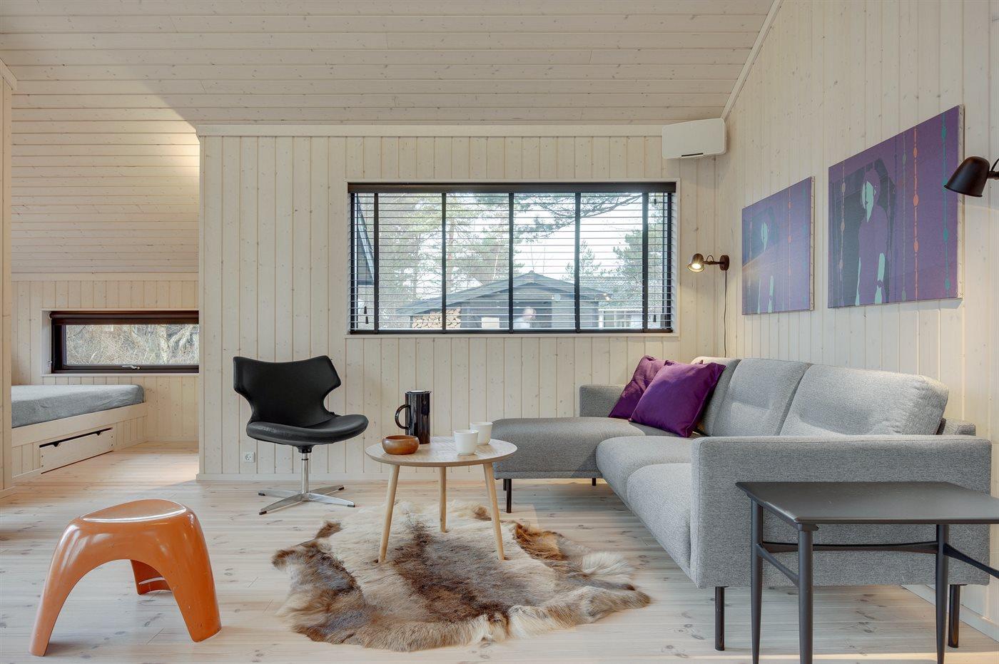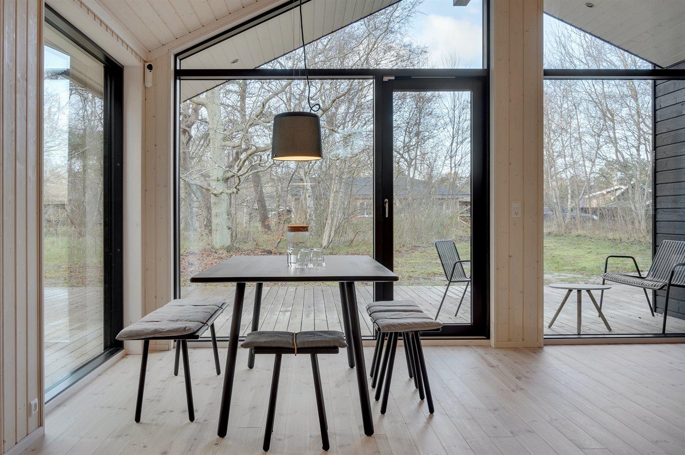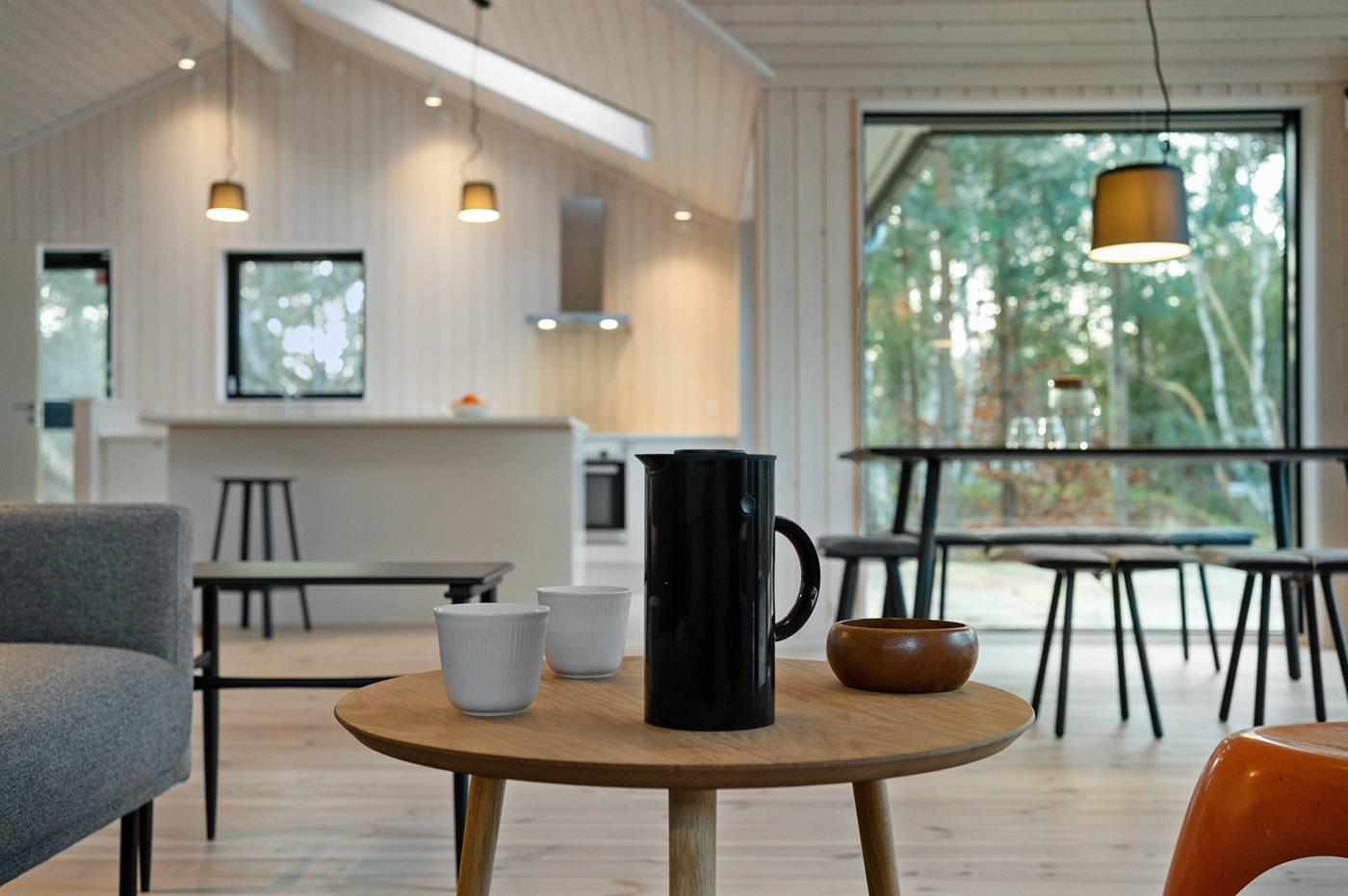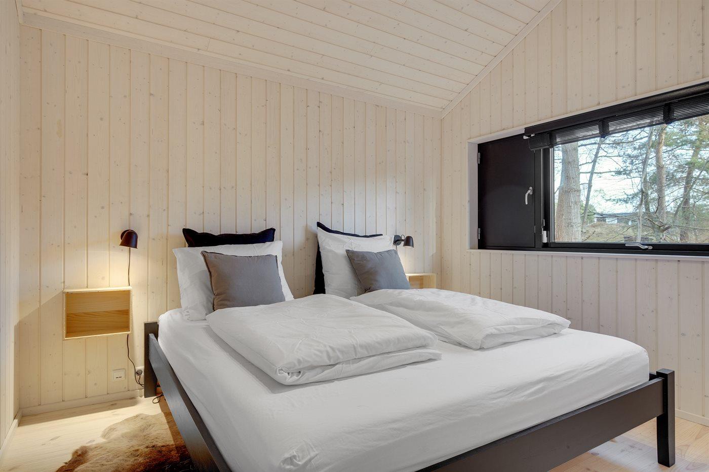 Indvendigt er huset åbent og lyst og med en moderne og let indretning. Takket være de lyse beklædninger, de store vinduespartier og loft til kip i alle rum føles huset rummeligt og rart at være i. Det moderne køkken er i åben forbindelse med spisepladsen og stuen. Der er 2 soveværelser med hver 2 sovepladser samt en stor alkove med 2 sovepladser, som også er velegnet til hygge og afslapning. Badeværelset er med gulvvarme og bruseniche med regnbruserhoved og med direkte udgang til terrasse og udebruser. Huset er funktionelt, og overalt er der anvendt gode materialer af høj kvalitet.