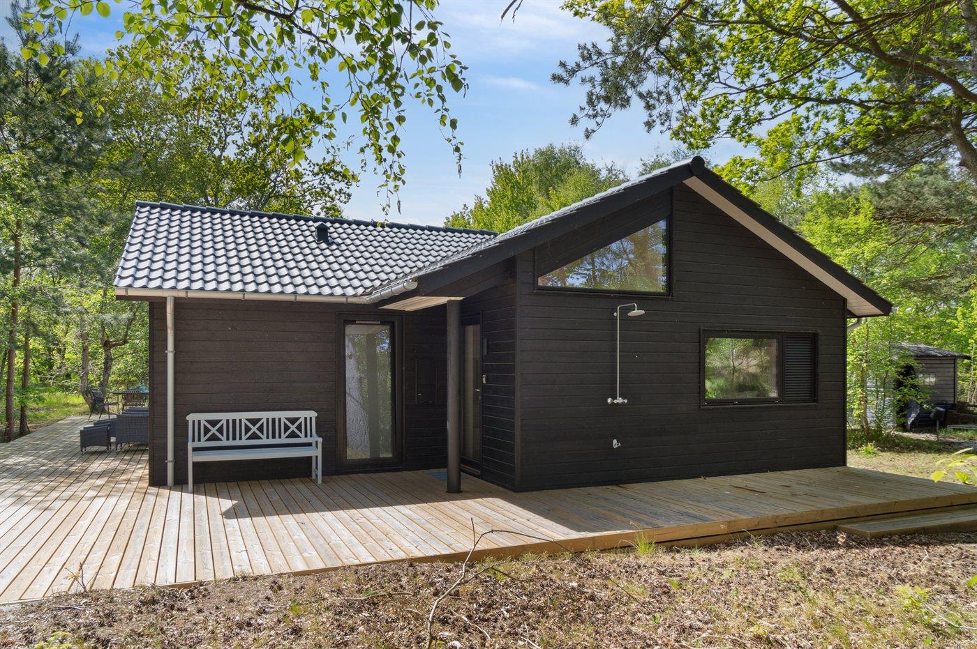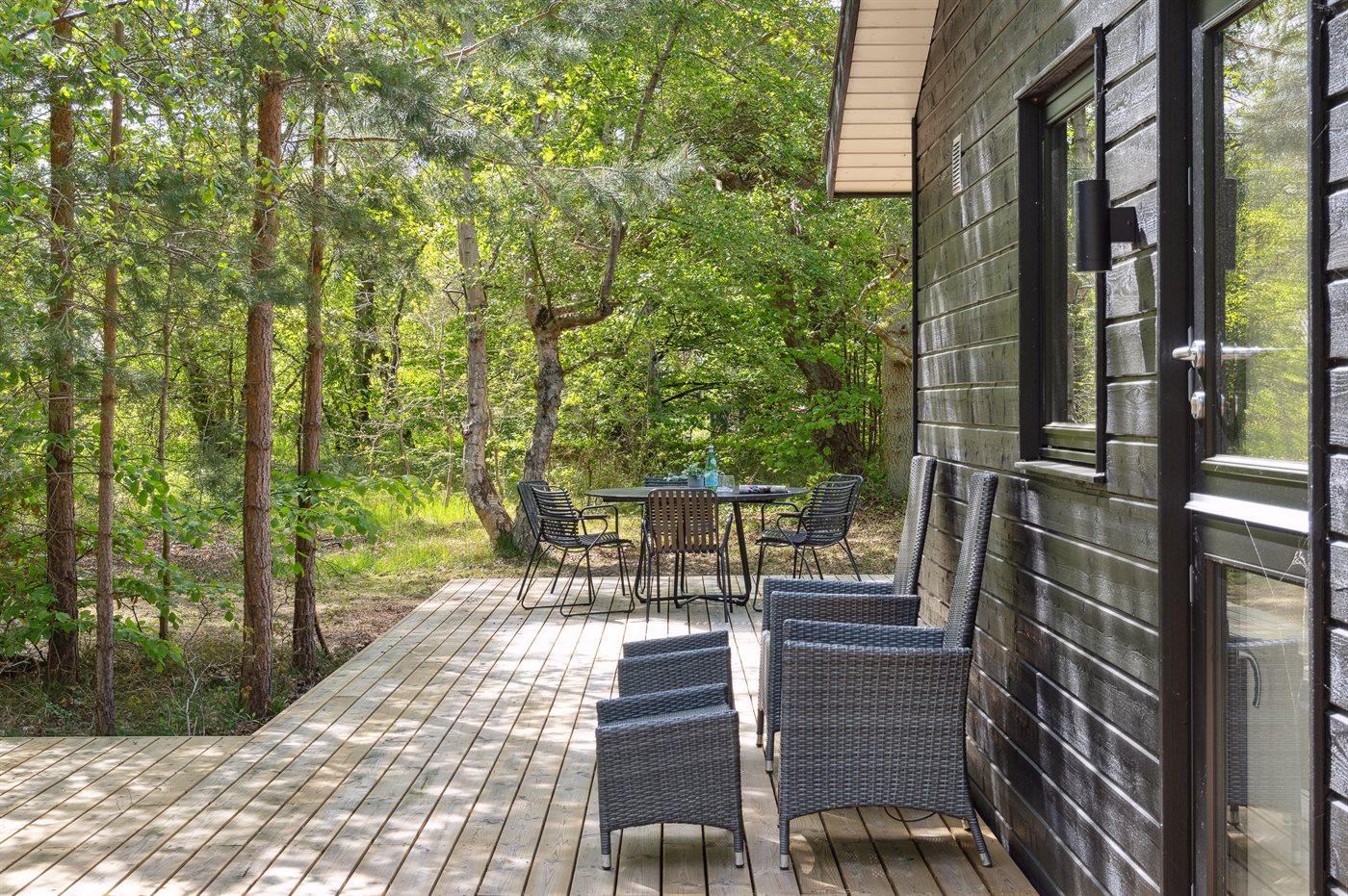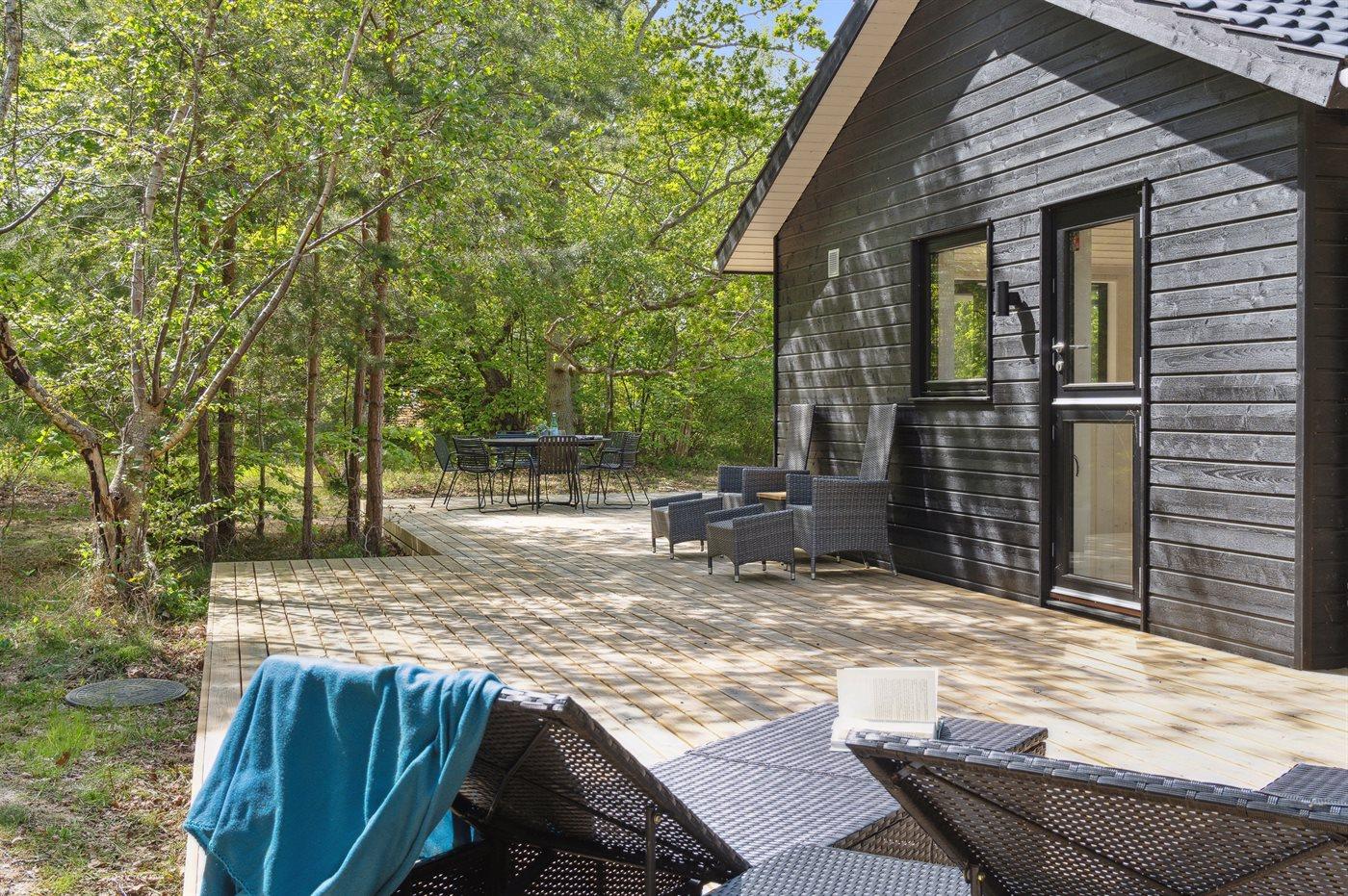 Dette nyopførte og moderne sommerhus er beliggende på en stor naturgrund med høje træer og kun 175 meter fra en af Danmarks allerbedste og mest børnevenlige sandstrande. Rundt om huset løber en kæmpestor træterrasse med udebruser, og hvor en del er overdækket. Her er altid mulighed for at finde sol, læ og skygge.