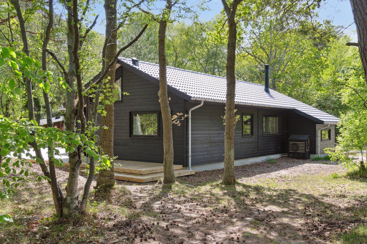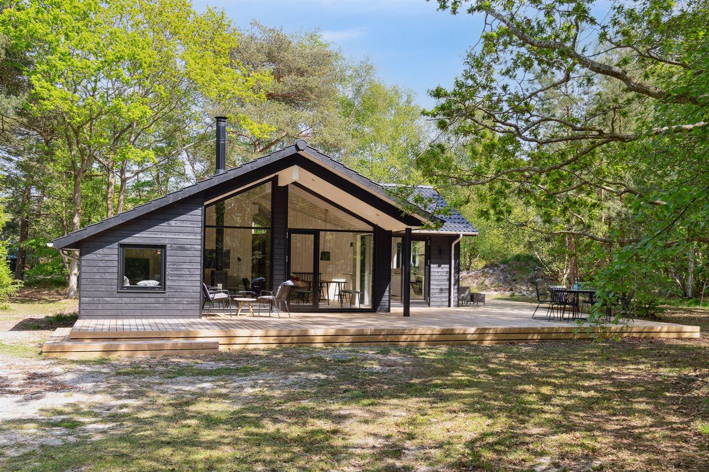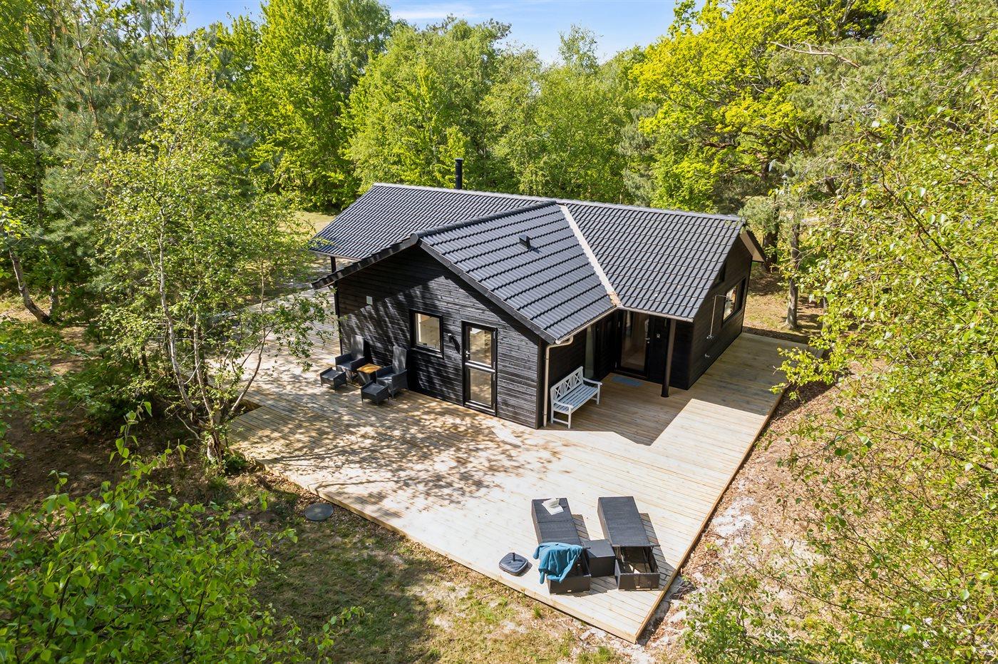 Dette nyopførte og moderne sommerhus er beliggende på en stor naturgrund med høje træer og kun 175 meter fra en af Danmarks allerbedste og mest børnevenlige sandstrande. Rundt om huset løber en kæmpestor træterrasse med udebruser, og hvor en del er overdækket. Her er altid mulighed for at finde sol, læ og skygge.