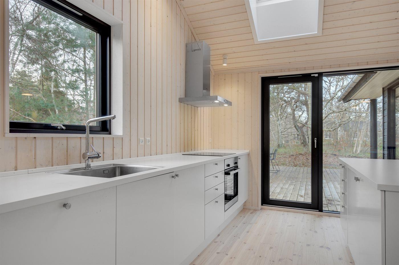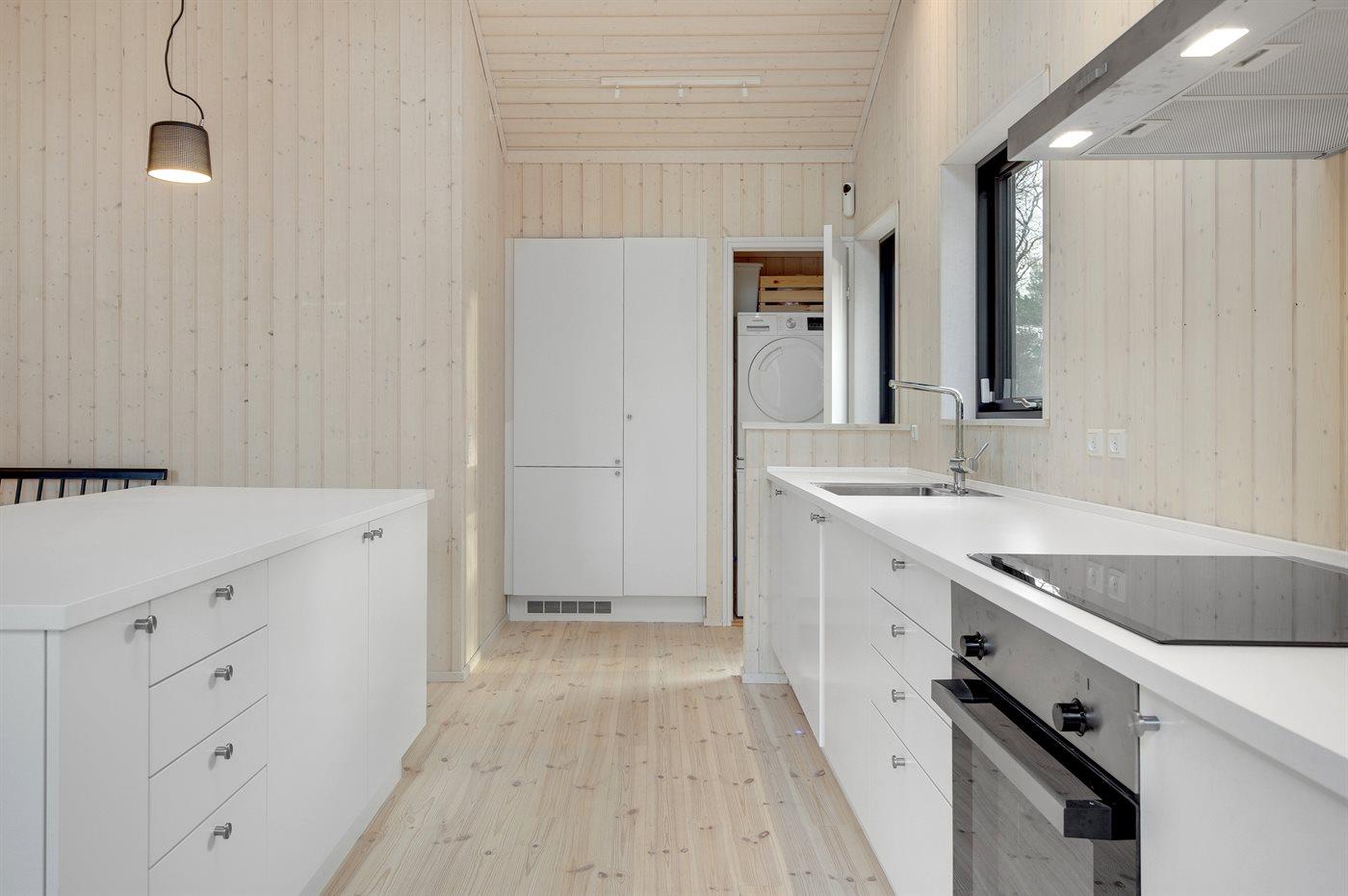 Køkkenet er udstyret med 1 køleskab. Der er 4 induktionskogeplader, varmluftovn samt opvaskemaskine.