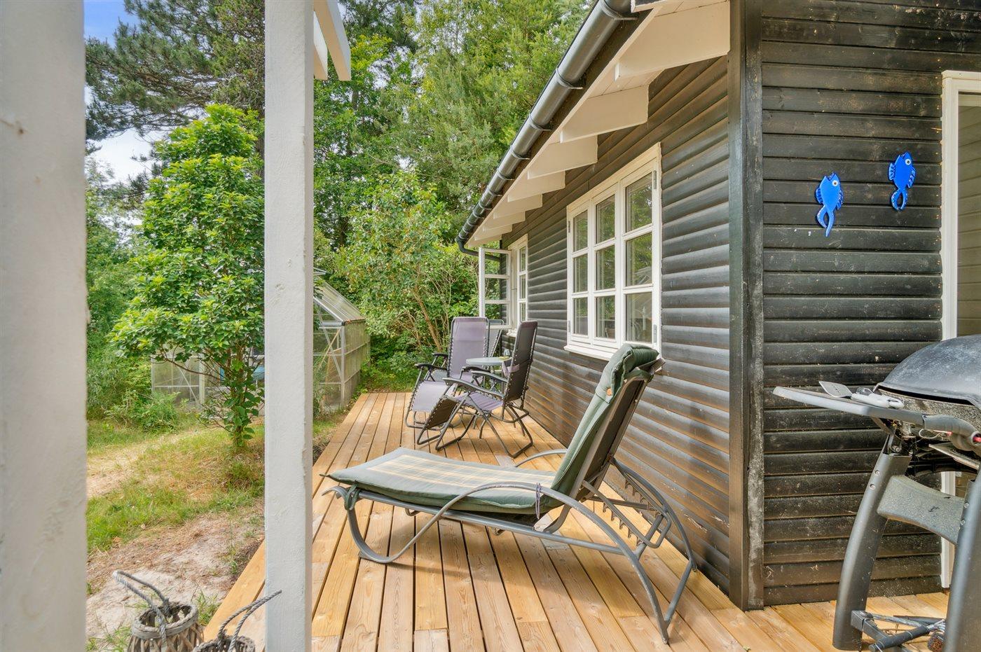 Ferieboligen er beliggende på en 1576 m² stor havegrund. Der er 425 m til havet. Nærmeste forretning er beliggende i en afstand af 1800 m. Der er en golfbane i en afstand af 3150 m. Desuden er der 32 m² overdækket terrasse. Grill til rådighed. Der er installeret stik til opladning af elbil. CEE stik. Med 11 kW ladeeffekt. Parkering ved ferieboligen.