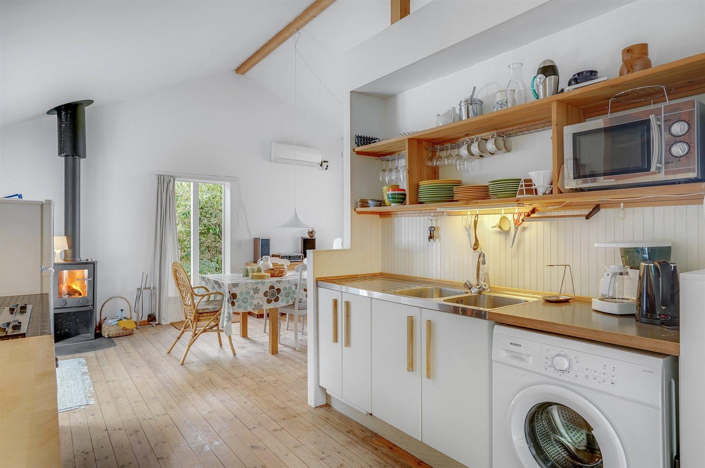 Køkkenet er udstyret med 1 køleskab. Der er 4 keramiske kogeplader, varmluftovn, mikrobølgeovn samt opvaskemaskine.