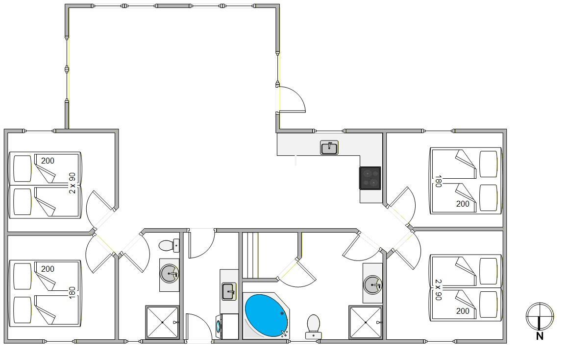 Køkkenalrummet samt feriehusets badeværelser er udstyret med gulvvarme. På det ene af feriehusets 2 badeværelser, finder I tømmespaen. Kom helt ned i gear og mærk varmen strømme gennem kroppen – helt perfekt selvforkælelse efter en lang gåtur på stranden. Herunder finder I 3 fine soveværelser, der alle er udstyret med dobbeltsenge (180x200), for at sikre en god nattesøvn.