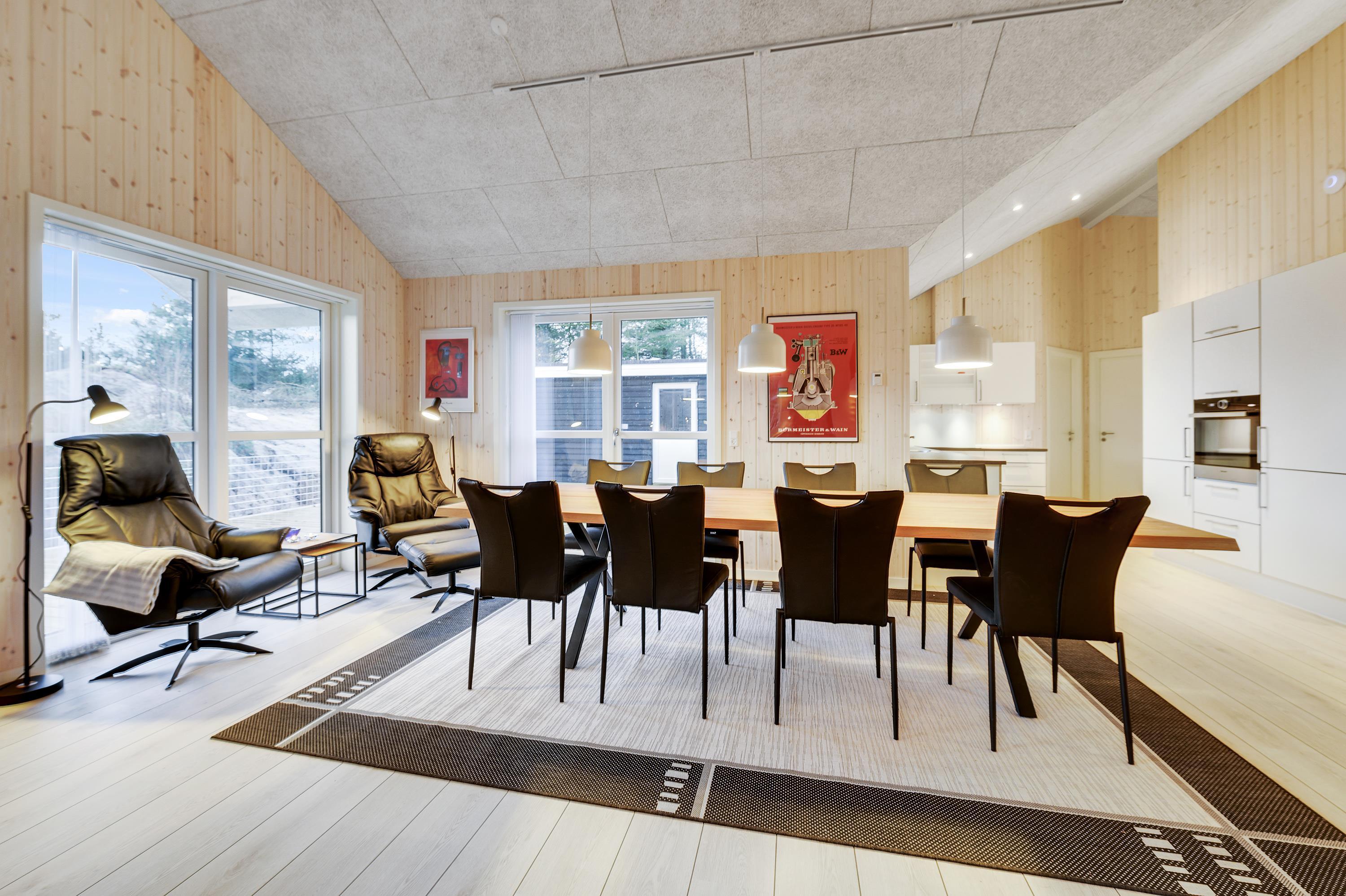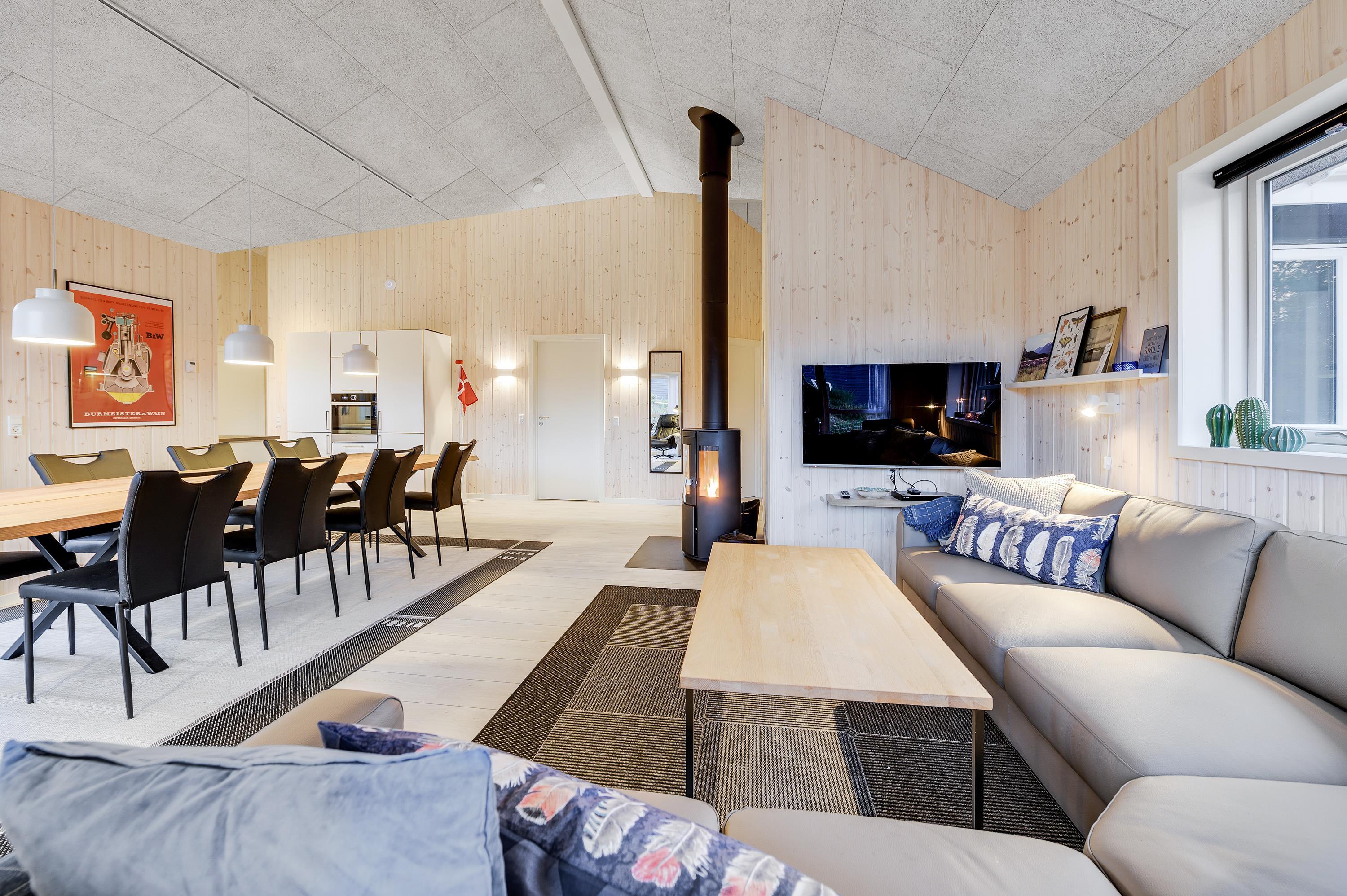Når man går videre fra entréen, træder man direkte ind i sommerhusets hjerte; det åbne køkkenalrum, der forener stue, spisepladsen og køkken. Her er rart at være. Med afstemte farver, højt til loftet og masser af naturligt lys, skabes en behagelig atmosfære. Centralt i rummet, er brændeovnen placeret, så I kan nyde den i alle kroge. Her kan I samles i sofaen til hygge; med et Chromecast har I mulighed for at streame jeres yndlingsfilm på fjernsynet. Slap af med en god bog, saml familien om et brætspil eller måske der skulle bages til aftenkaffen? Det funktionelle køkken har alt, hvad I skal bruge samt en 30L fryser, opvaskemaskine og induktionskomfur.
