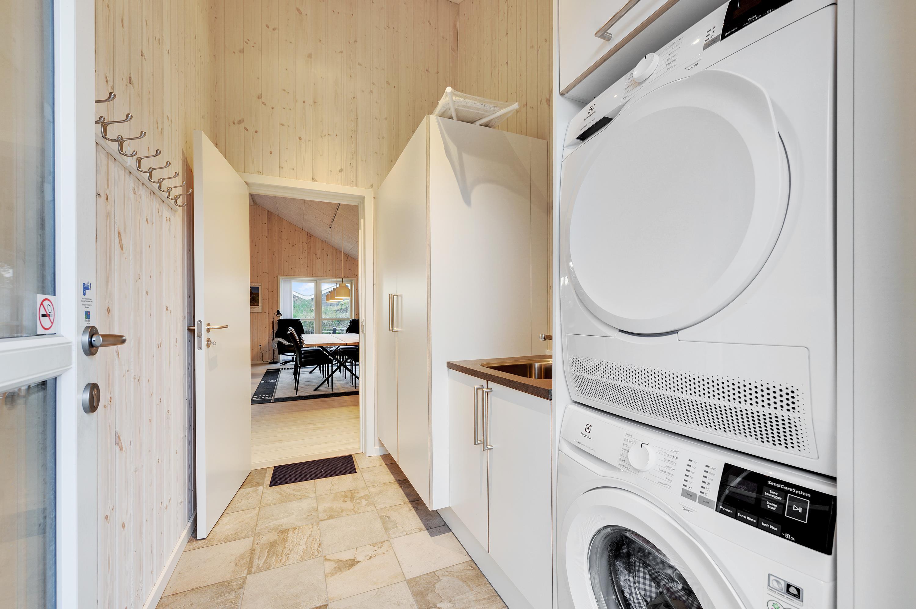 Sommerhuset har et areal på 120m2 og byder velkommen til op til 6 gæster. Når man træder indenfor, kommer man først til den funktionelle entré med god plads til overtøjet og ikke mindst en vaskesøjle. Med både vaskemaskine og tørretumbler er I sikret friskt tøj og håndklæder under hele opholdet.