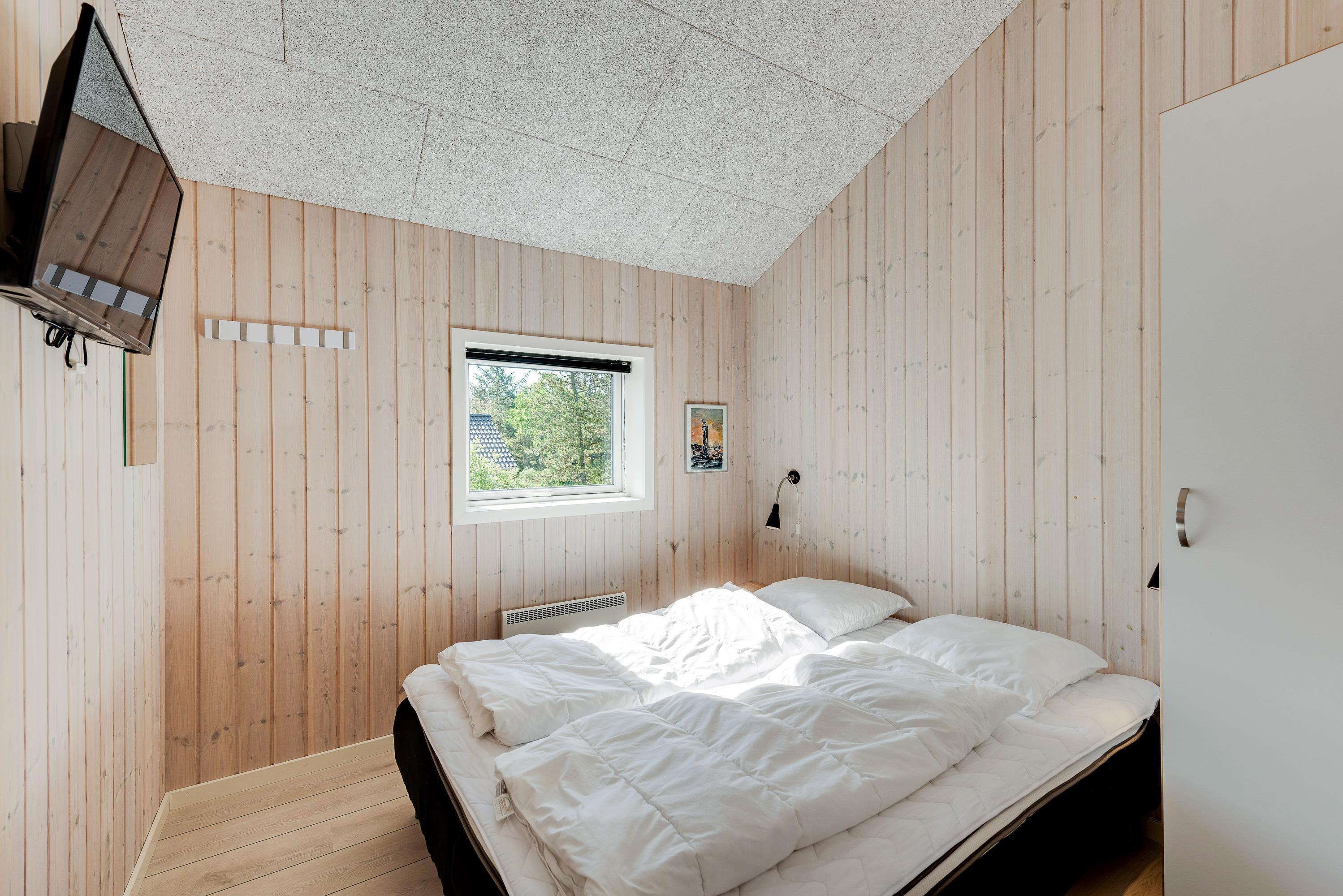Det moderne sommerhus er stort og rummeligt med plads til i alt 6 personer. Her er 3 gode soveværelser, 2 med dobbeltsenge og et med 2 enkeltsenge. Derudover er der 2 sovepladser i stuen, hvor der er en hyggelig alkove, samt et ekstra soverum med udtræksseng til 2 personer og direkte adgang til badeværelse. Sommerhuset er indrettet med 2 badeværelser - et stort badeværelse med spabad, gulvvarme og bruseniche, og et lidt mindre med bruseniche og gulvvarme.