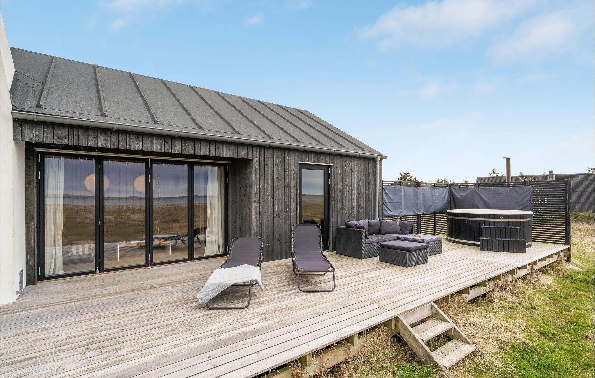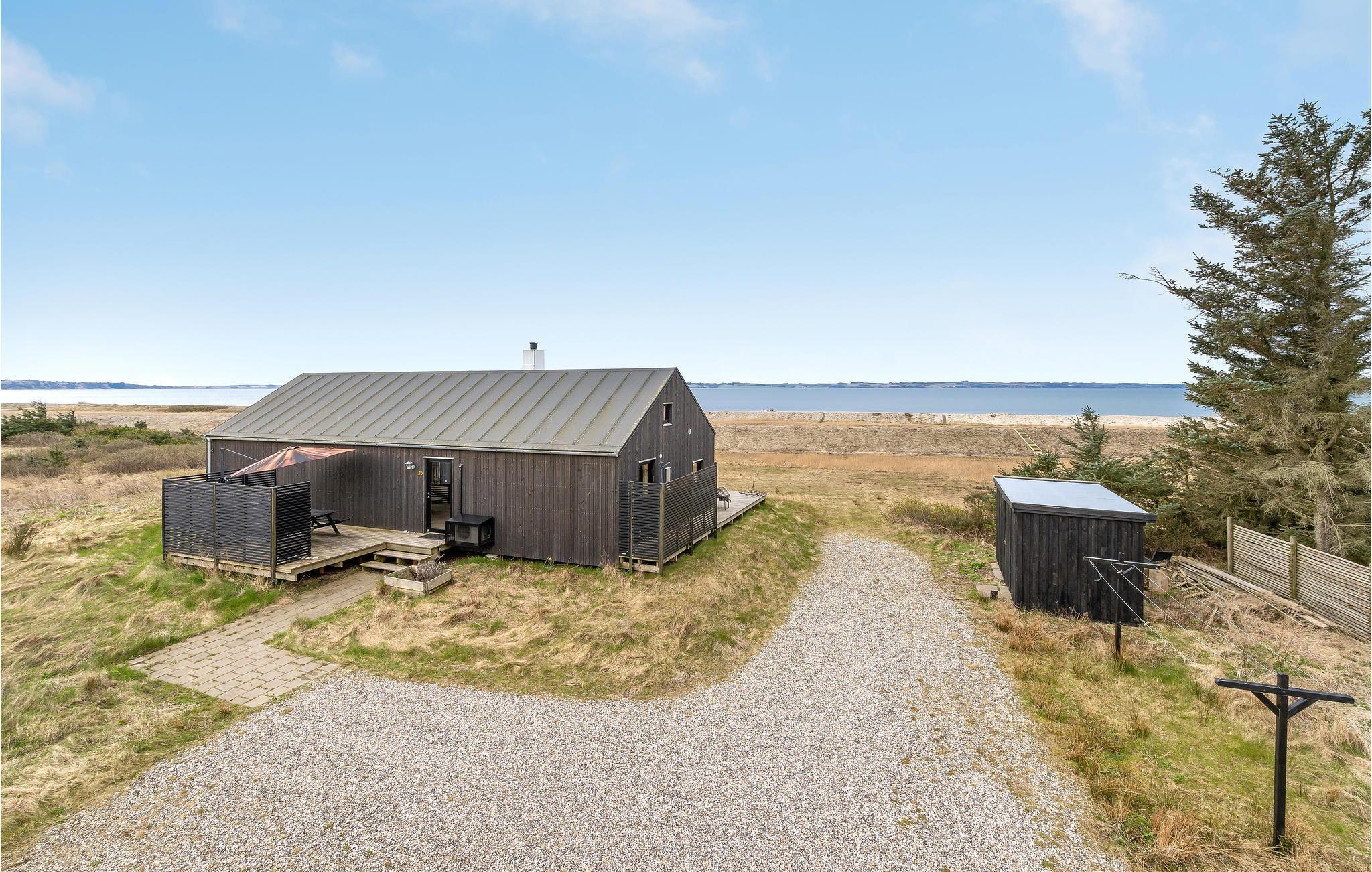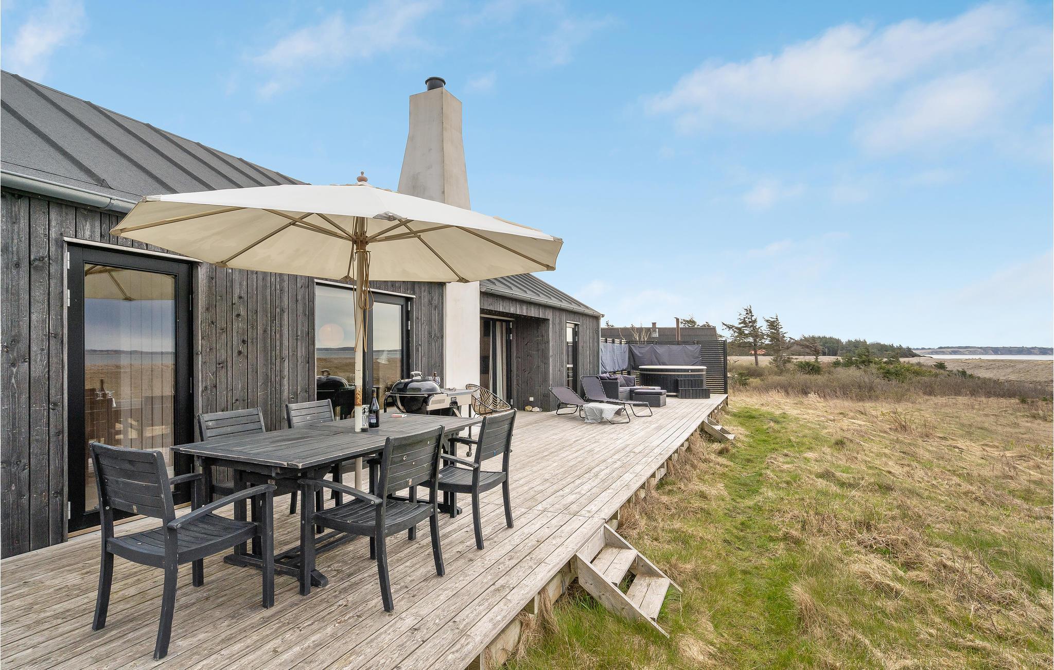 Stilfuldt sommerhus i Thyholm med udendørs wellness og panoramaudsigt over fjorden.