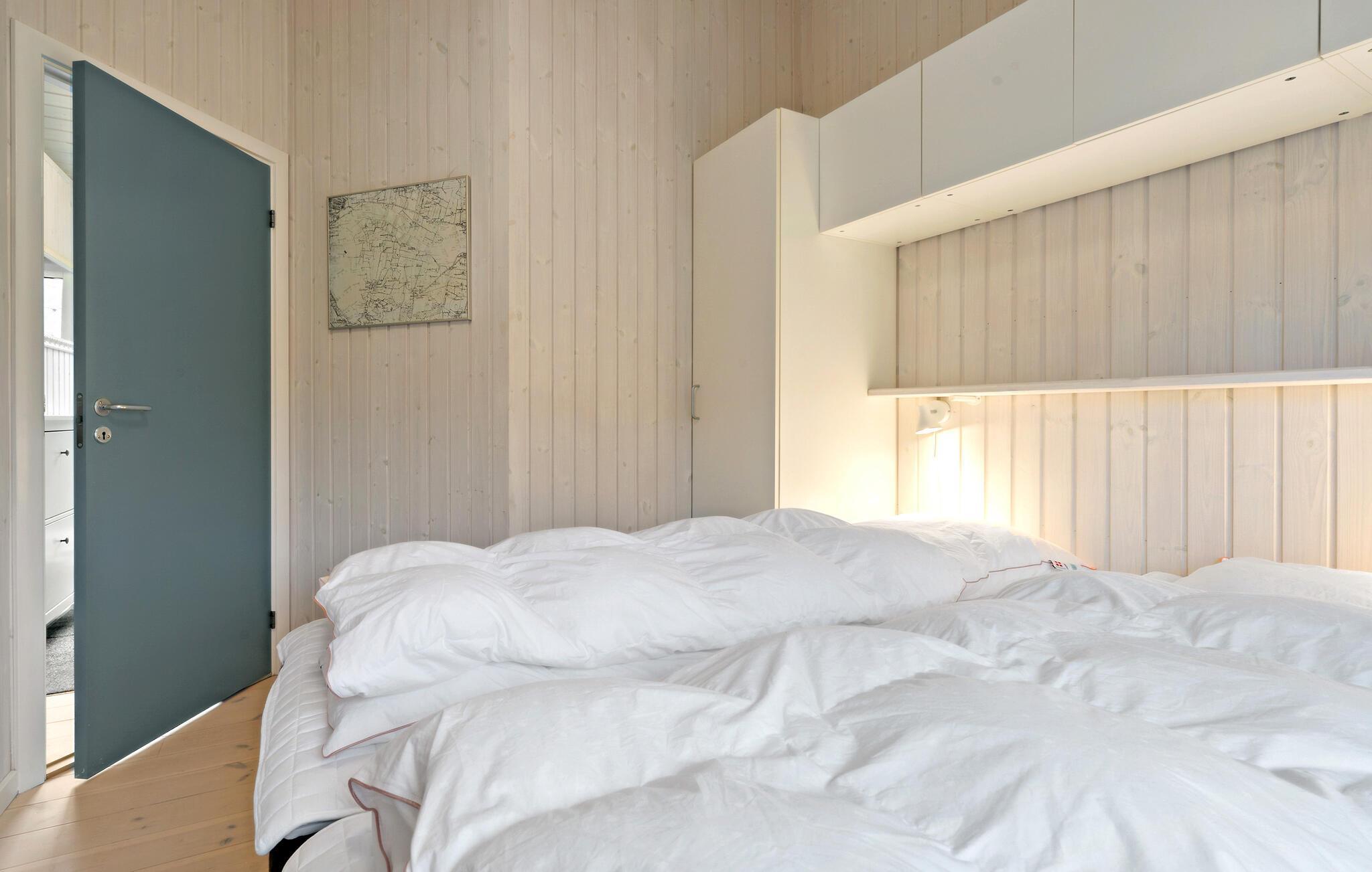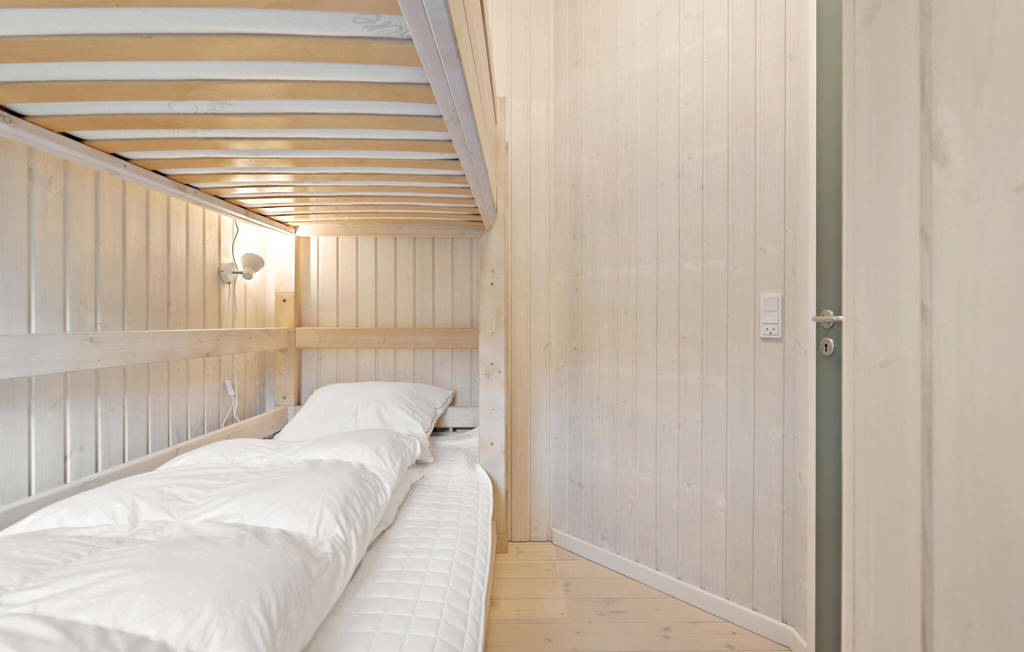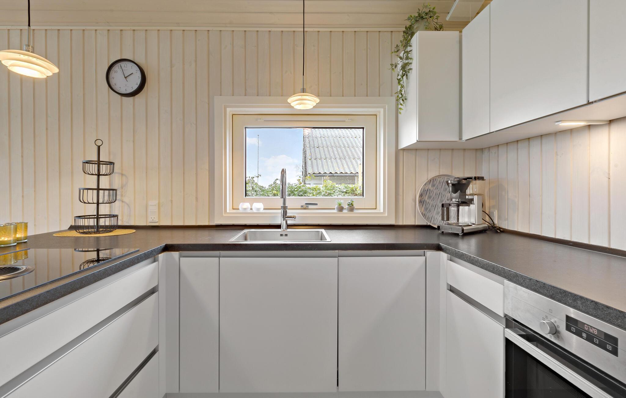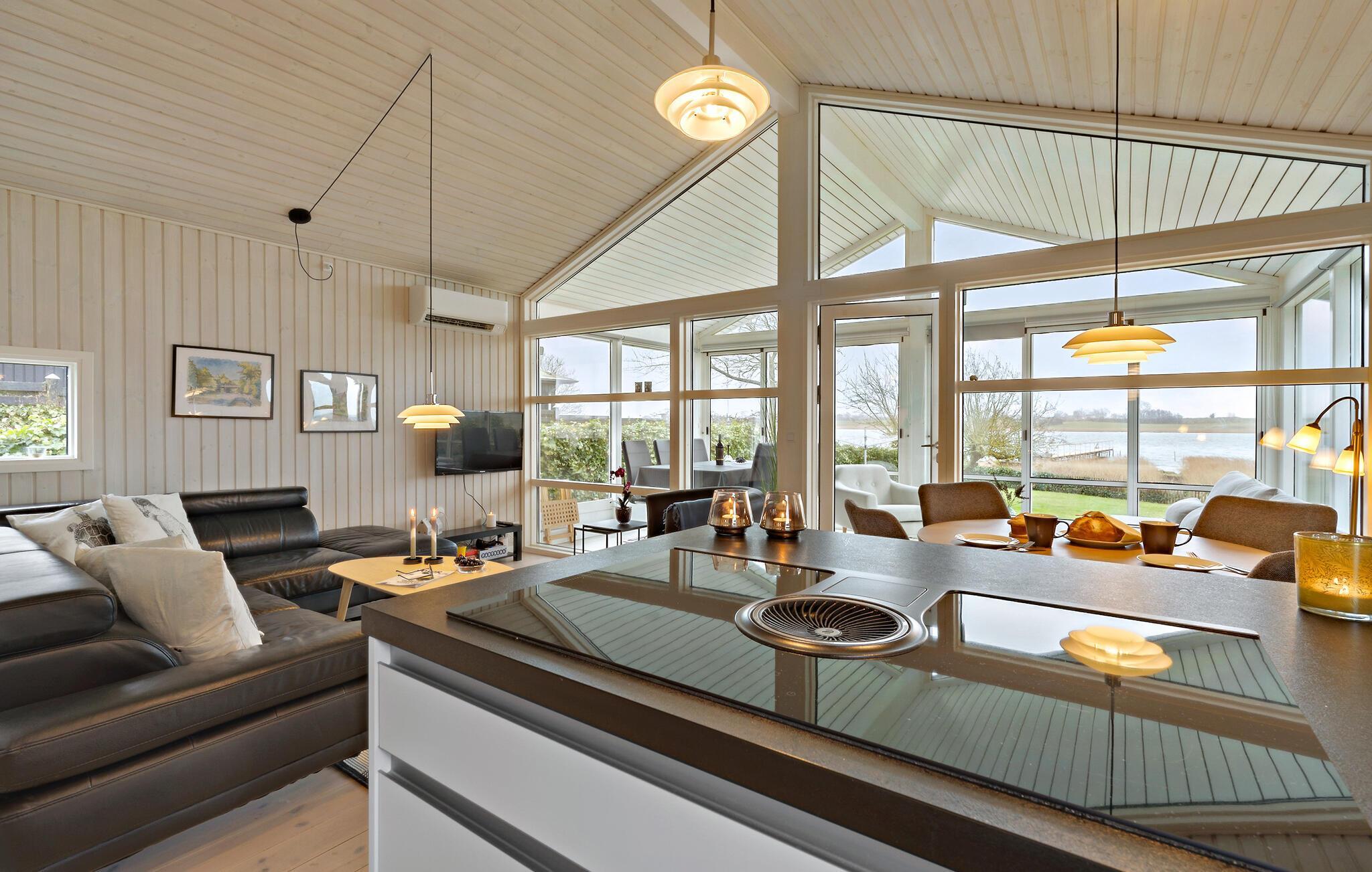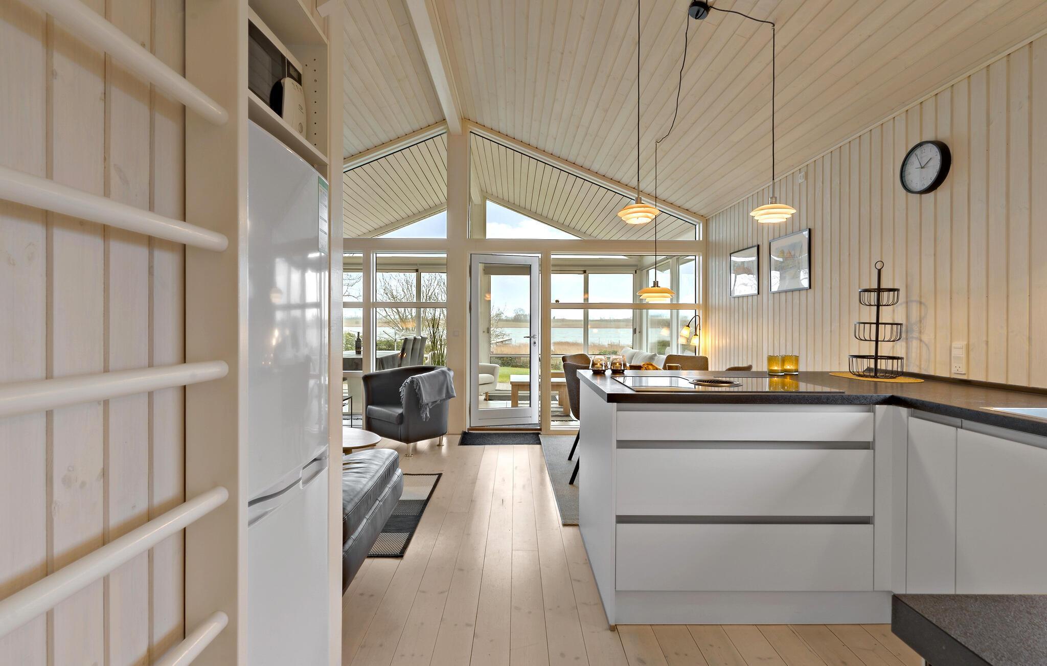 Lad hverdagen blive derhjemme og se frem til en afslappende ferie i dette indbydende og hyggelige træhus lige ved Kerteminde Fjord. Indretningen fremstår åben og rummelig, ikke mindst på grund af de store vinduespartier, der lader en masse naturligt lys sive ind og nærmest bringer de smukke omgivelser ind i den åbne stue, som ligger i forbindelse med køkkenet, og hvor der venter jer mange hyggelige stunder i familiens skød. Her kan I lave mad i det veludstyrede køkken, spille brætspil eller købe snacks ind til en underholdende filmaften. I udestuen får I en særligt god udsigt og et skønt sted at starte dagen ud med en friskbrygget morgenkaffe.