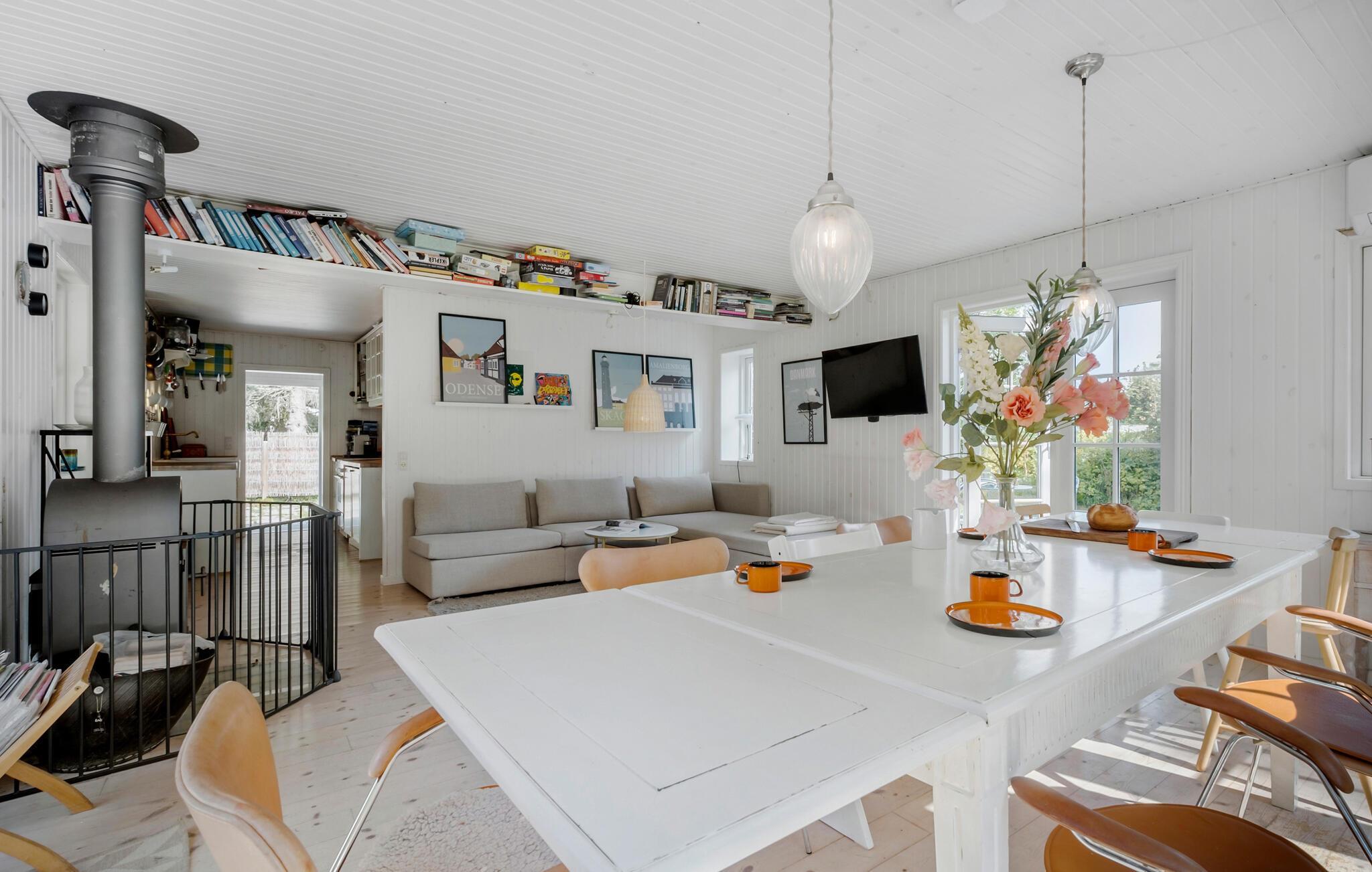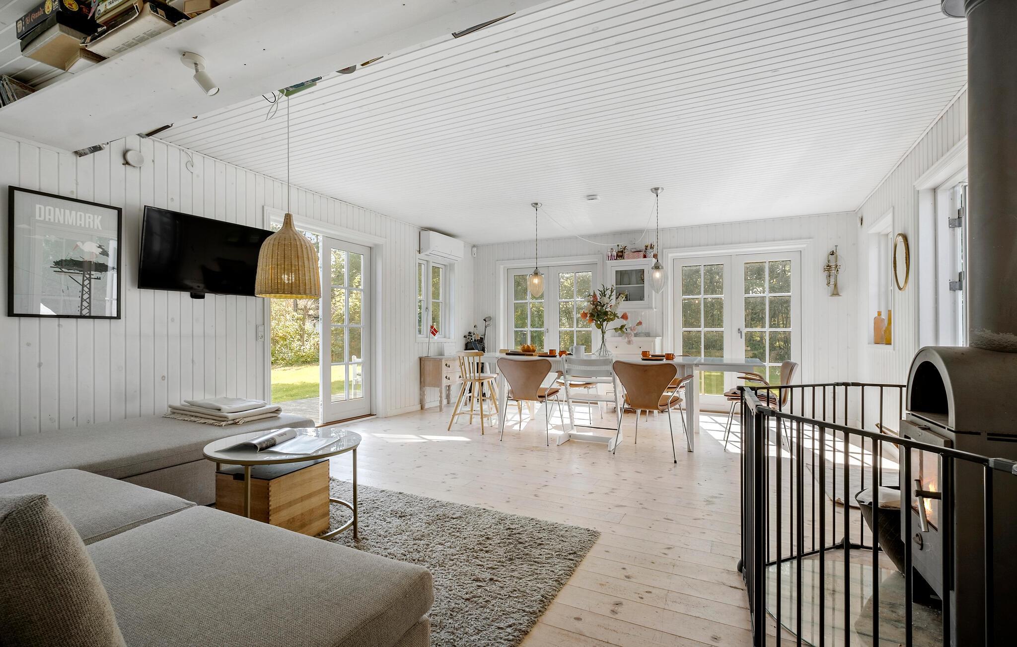 Jeres sommerhus ved Overby Lyng Strand tilbyder plads og komfort til hele familien og imponerer med en stilfuld, lys indretning. Start dagen med morgenmad i den rummelige stue, hvor de store vinduer lukker masser af dagslys ind og skaber en indbydende atmosfære. Gør jer det behageligt i den hyggelige sofakrog, og nyd afslappende timer ved brændeovnen.