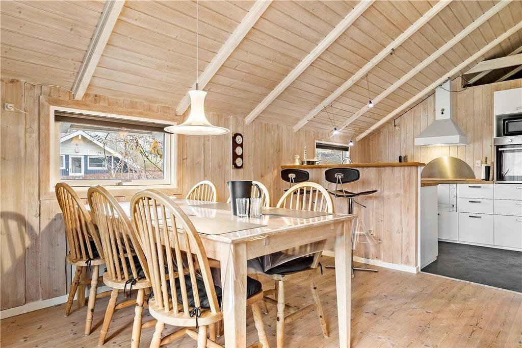 Husets flotte køkken har mini opvaskemaskine og alt, hvad I ellers skal bruge under jeres ophold. Spisepladsen ligger i åben og direkte forbindelse med køkken og stue. Her kan I samles til dagens måltider og nyde udsigten til en naturskøn have.