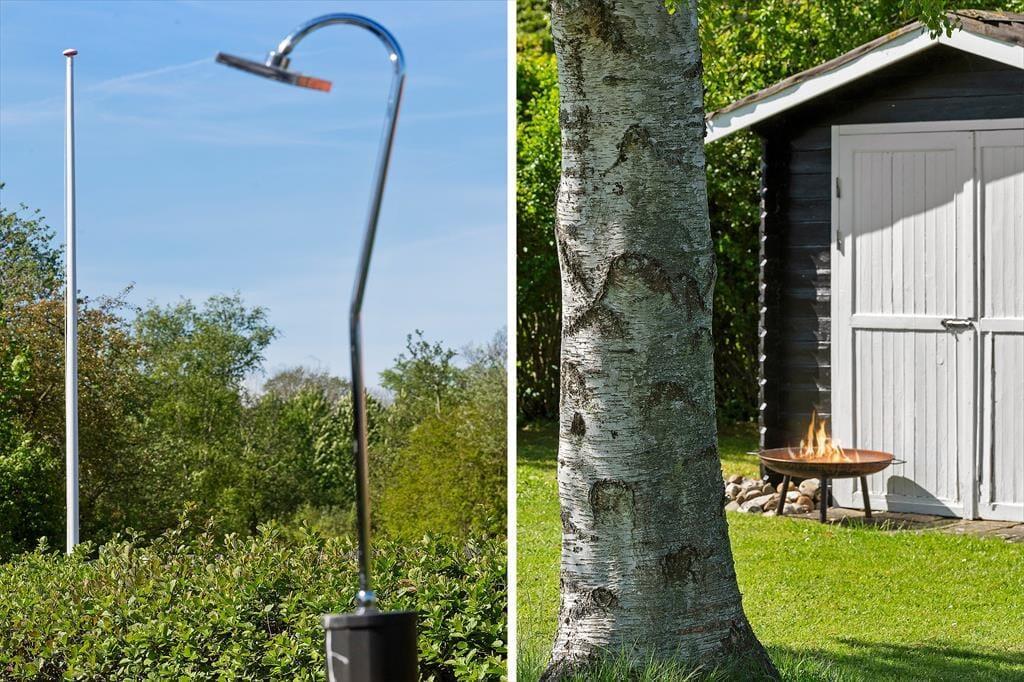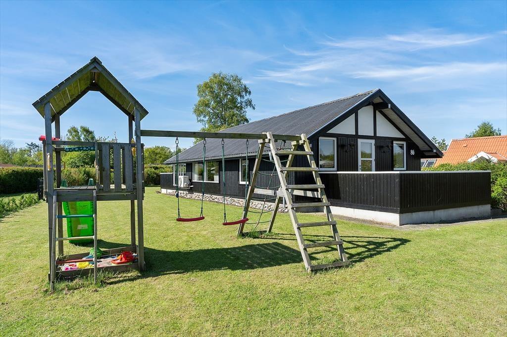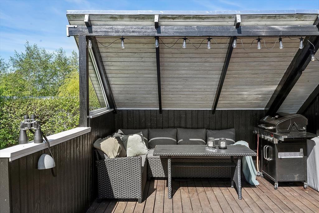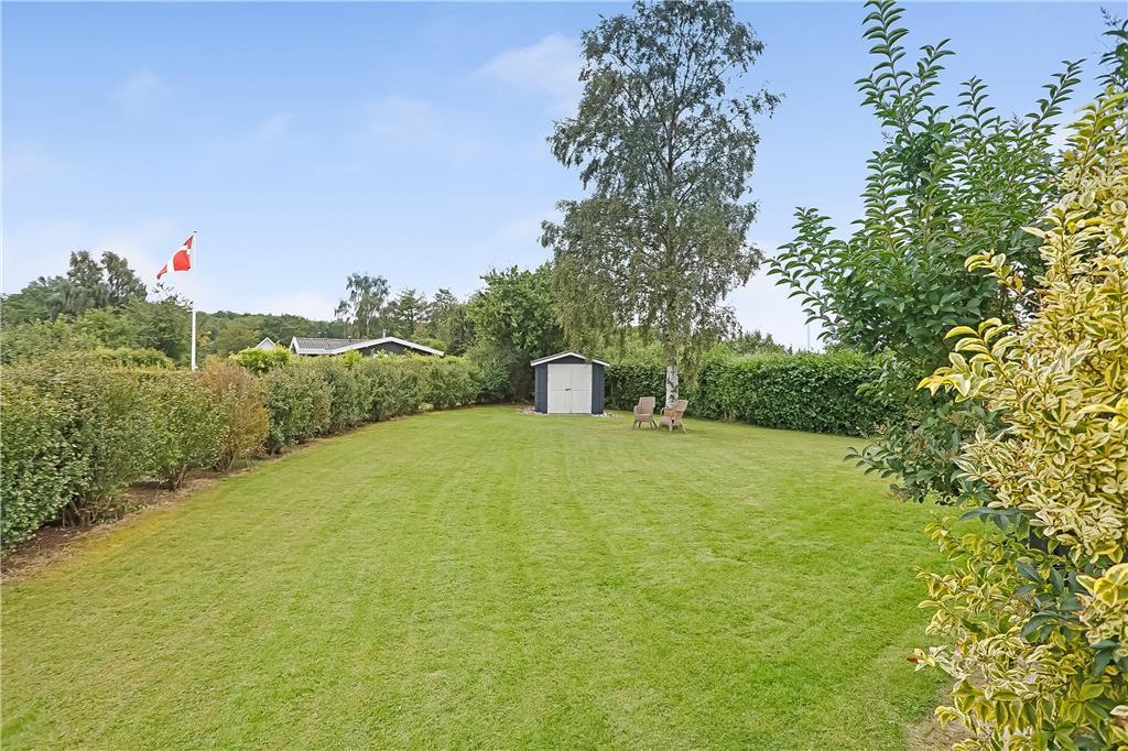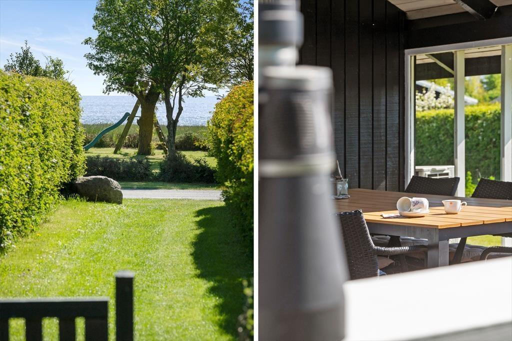 Huset ligger i dejligt roligt sommerhusområde – knap hundrede meter fra vandet og badebro. Er omkranset af pæn stor plæne med plads til leg og boldspil og en lille hæk. Dejlig stor delvis overdækket træterrasse med læ i den ene ende af huset samt ligeledes træterrasse ved indgang til huset i den anden ende. Der er grill og havemøbler til fri afbenyttelse.