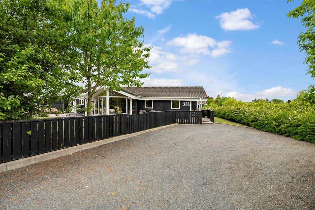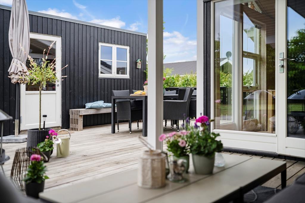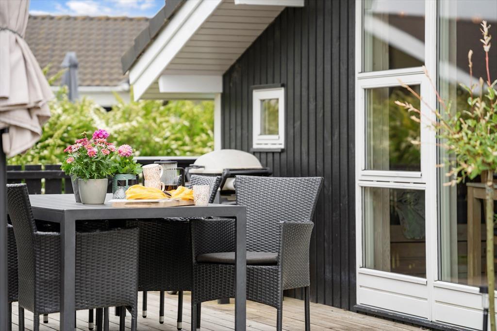 Grus indkørslen med plads til flere biler byder jer velkommen til sommerhuset. Rundt om sommerhuset er en dejlig stor træterrasse, som er delvist overdækket. Terrassen indbyder til hygge og afslapning i husets havemøbler, liggestole eller loungemøbler. Aftensmåltidet kan tilberedes på huset grill.