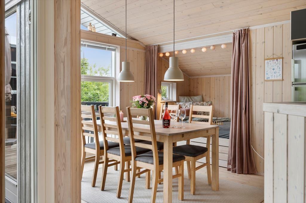 Sommerhusets hjerte er køkken/alrummet, som ligger i åben forbindelse med stuen som har god plads og som har et rigtigt flot lysindfald gennem de store vinduer som går fra gulv til loft.