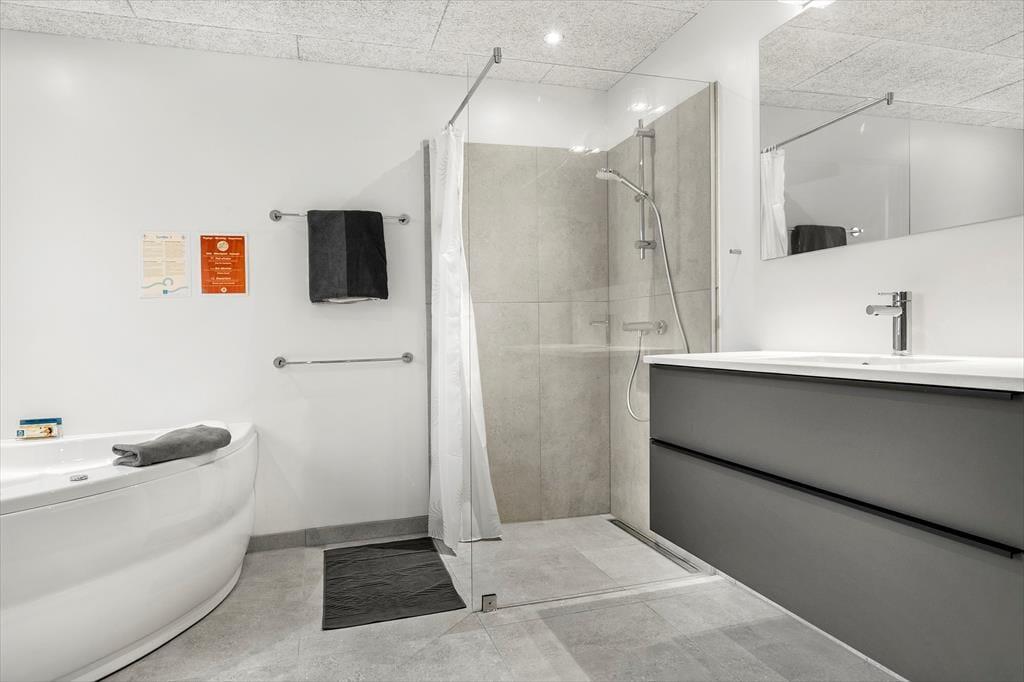 I husets badeværelse er der en lækker spa samt en stor bruseniche. Der er både vaskemaskine og tørretumbler i huset.