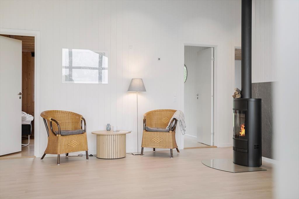 I sofahjørnet mod det store østvendte vinduesparti skaber brændeovnen en varm og hyggelig sommerhusstemning. Det er helt perfekt at sidde her med en bog eller tænde for en god film. Her kan I virkelig slappe af, og nyde at være på ferie. Om aftenen kan i koble fra og benytte jer af sommerhuset mange TV kanaler.
