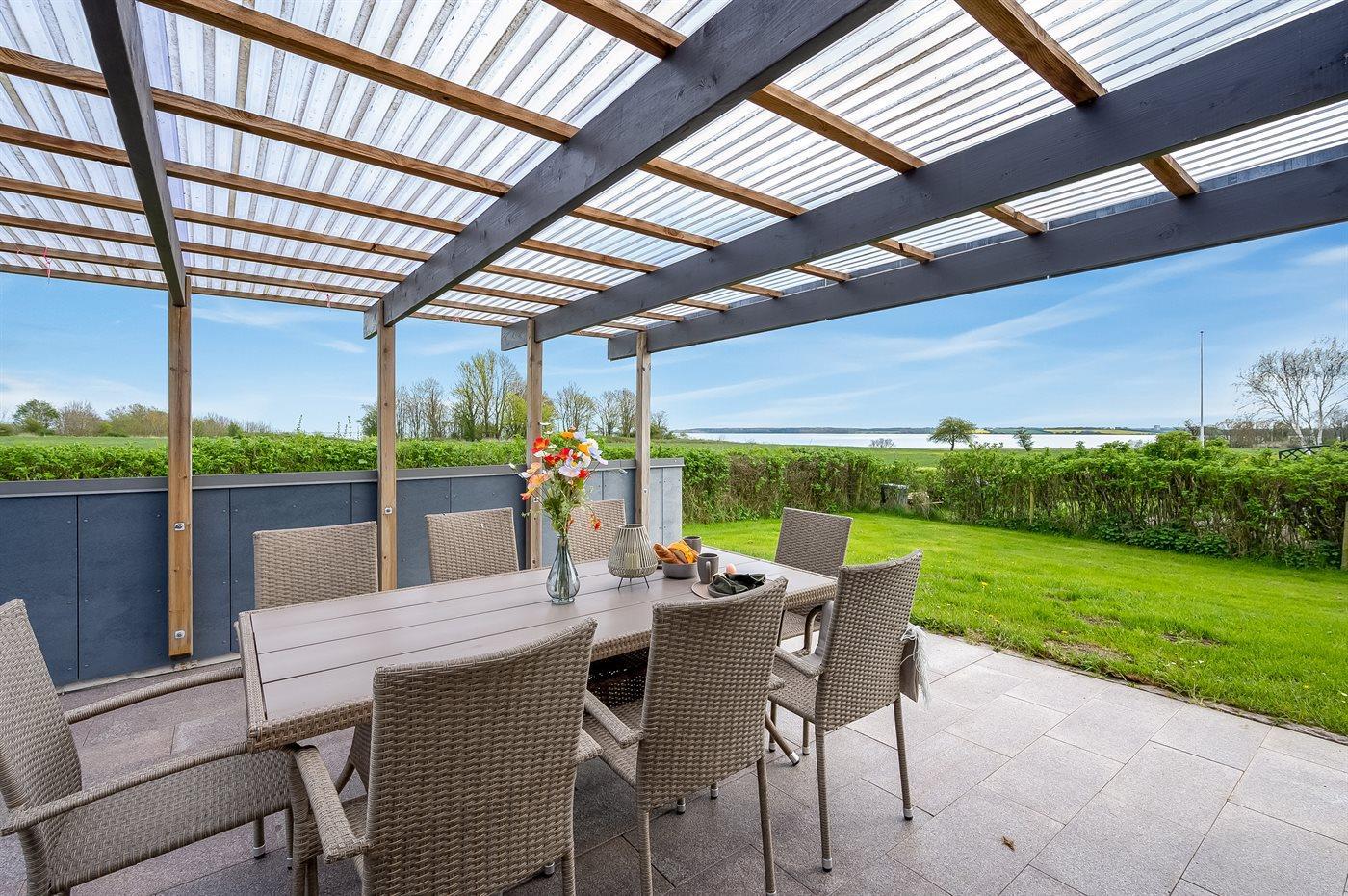 Sommerhuset er beliggende på en dejlig grund og med en overskuelig have. Der findes et dejligt, delvist overdækket terrasseareal - hvor det ofte er muligt at finde et hjørne i læ for vinden, og hvor du kan nyde solen og sidde med et glas vin eller en kop kaffe og slappe af i de fredelige og naturskønne omgivelser.
