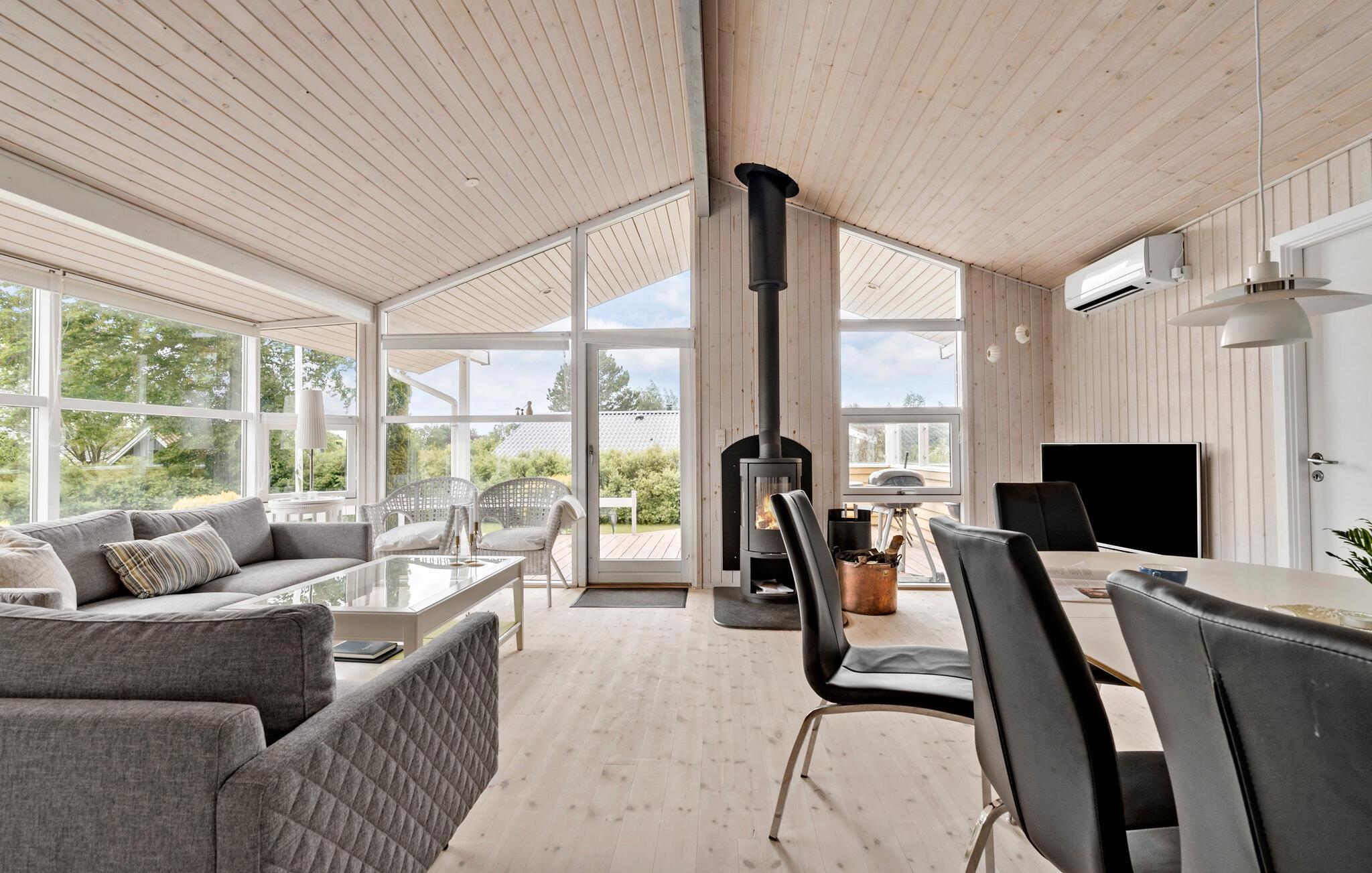 Velkommen til dette venlige og indbydende hus. Træd ind i de smukke rum, der med det bejdsede træ giver en lys og komfortabel atmosfære. Husets hjerte er den lyse stue, som sammen med spiseområdet og køkkenet indbyder til fælles aktiviteter. Tænd op i brændeovnen om aftenen, eller slap af i spabadet.
