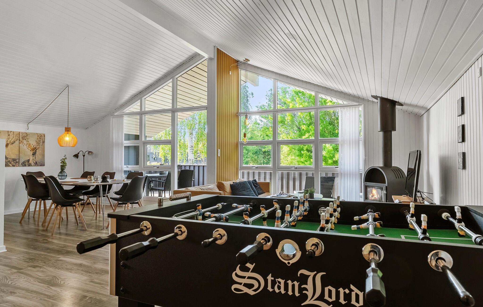 Dette indbydende feriehus tilbyder optimale betingelser for en afslappende ferie i en behagelig atmosfære. Nyd den åbne opholdsstue med dens lyse atmosfære, højt til loftet og store vinduer, der lukker masser af lys ind. Slap af på sofaen og tilbring hyggelige aftener ved brændeovnen. Spil kort sammen, se en film eller bare kig ud i haven. I det moderne køkken kan lækre retter tilberedes på ingen tid, og spisebordet ved vinduet lægger op til at dele måltider og samtaler. Slap af i hotellets sauna eller lad jer rive med af i spabadet og tilbring hyggelige timer ved bordfodbold.
