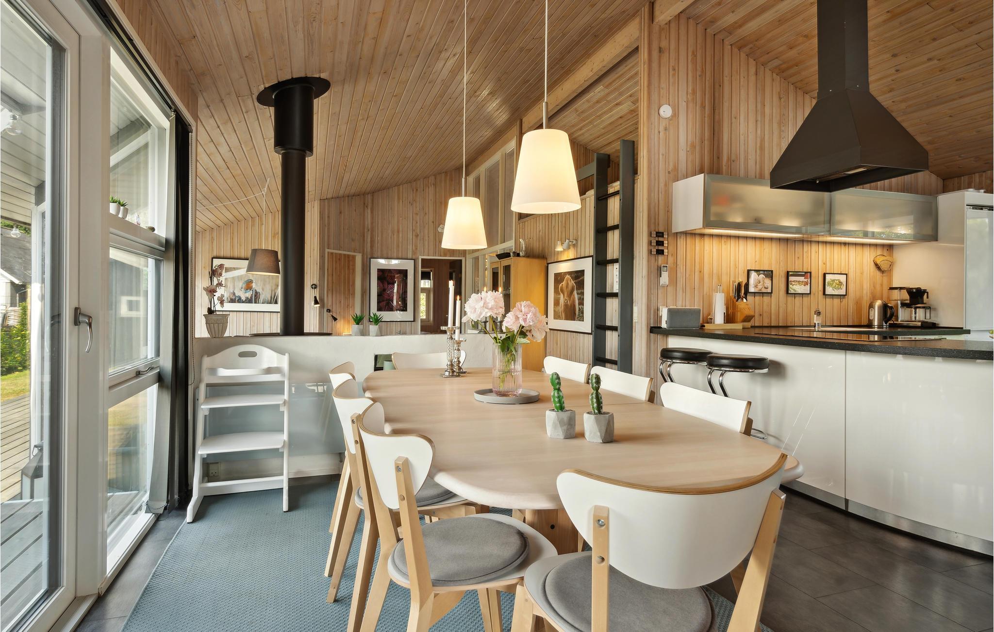 Huset er velindrettet og indeholder et åbent køkken i forbindelse med den lyse spisestue samt opholdsstuen med udgang til terrassen. Der er terrasser på tre sider af huset, hvoraf en er overdækket, så I altid kan finde læ.