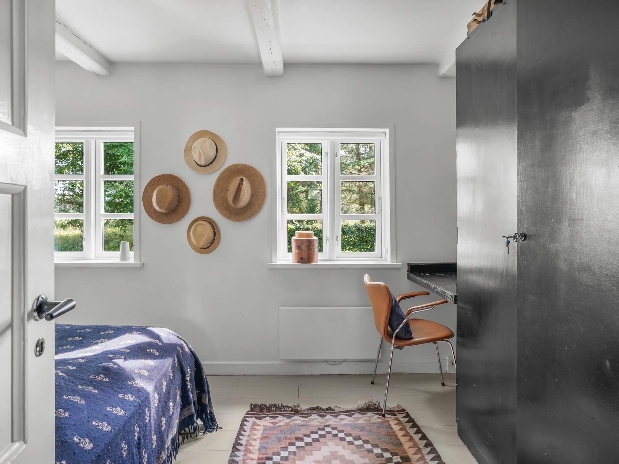 Indenfor finder du en lys og indbydende entré med trappe til 1. sal, hyggeligt køkken-alrum med direkte udgang til terrassen, et badeværelse og et soveværelse. På første sal er der repos med skrivebord og to store værelser med udsigt over det smukke landskab. Et værelse har en hems, der kan sove to personer.