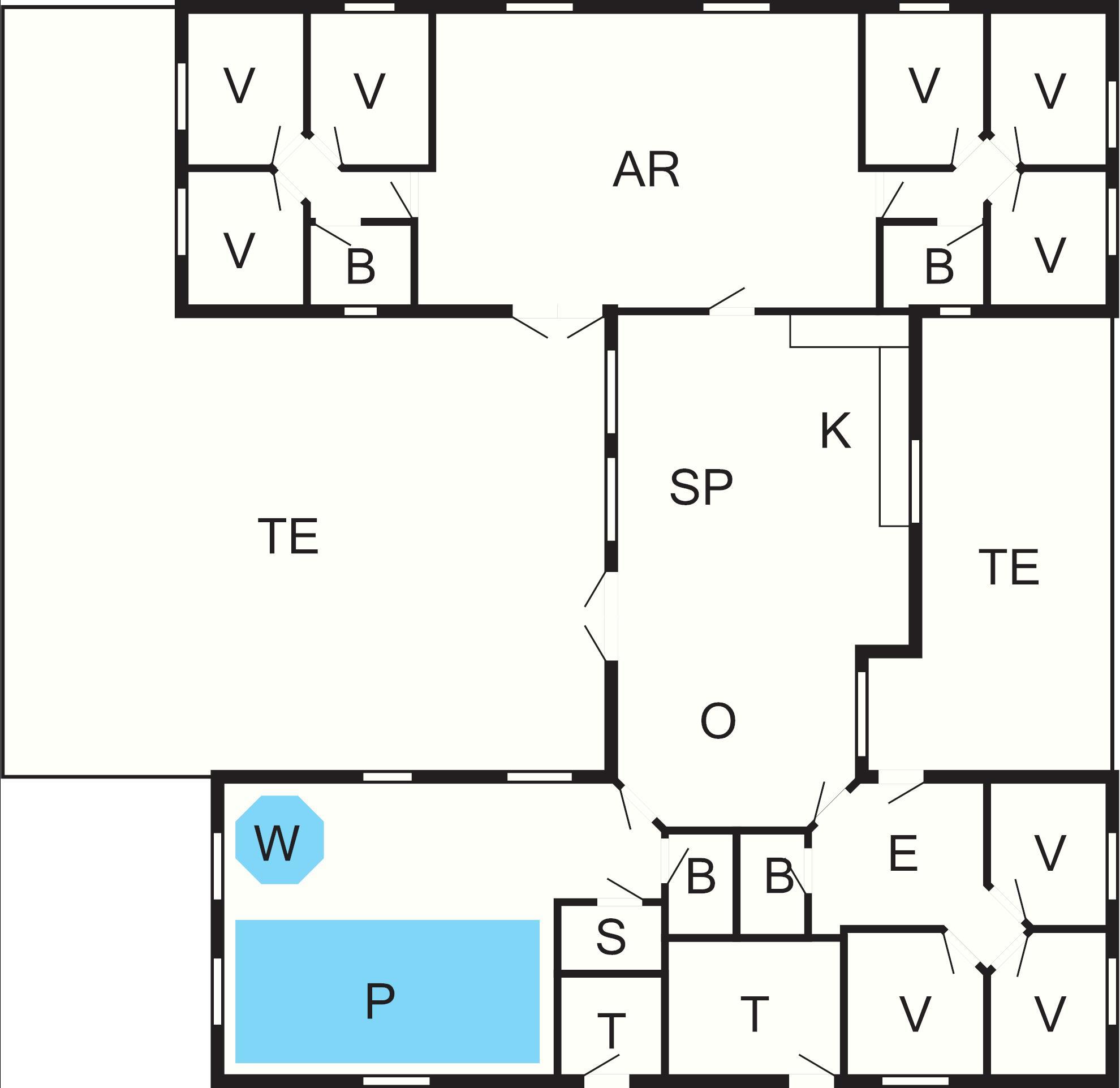 9 Soveværelser: (1DS)+(1DS)+(1DS)+(2S)+(2S)+(2S)+(2S)+(2S)+(2S), barneseng