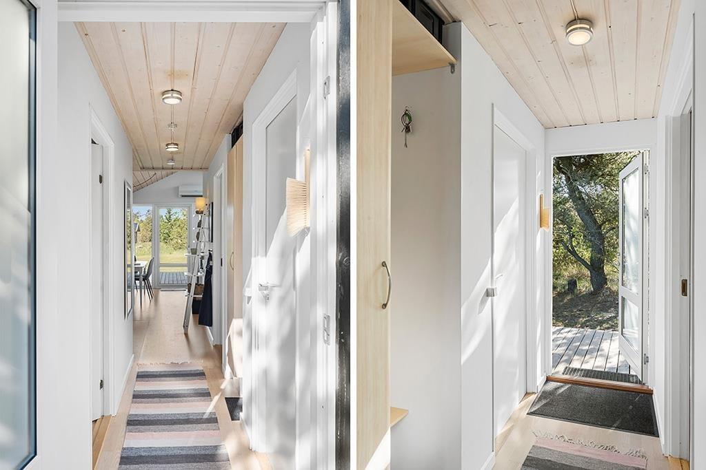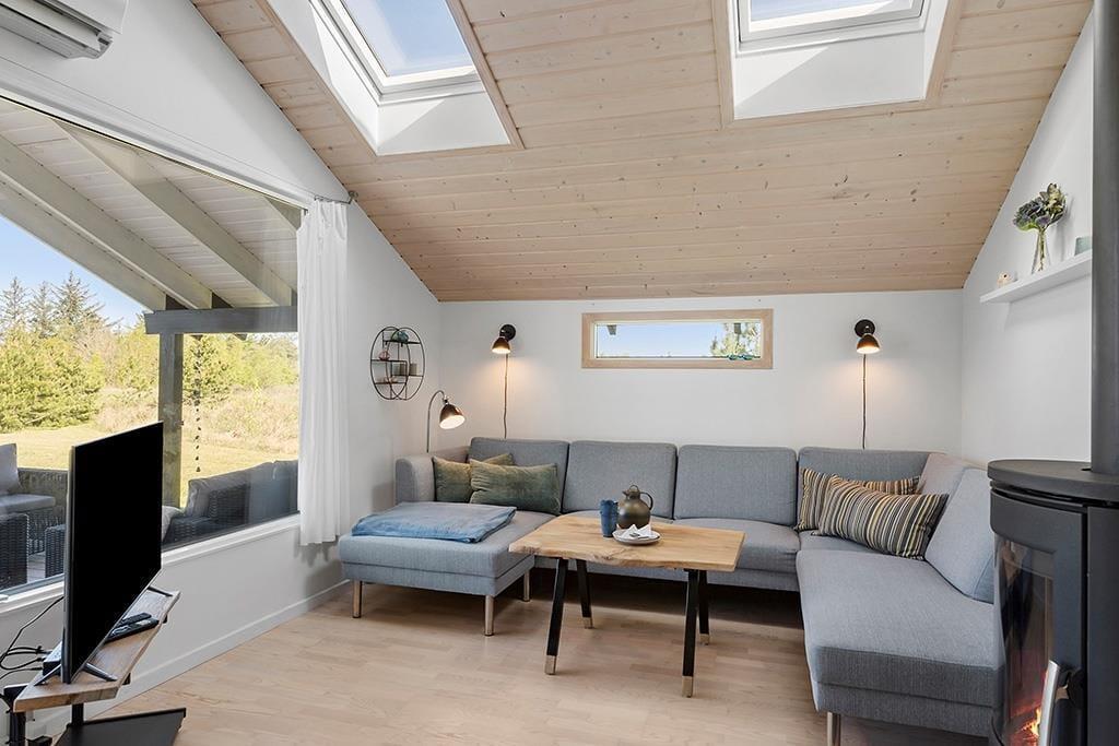 Inden døre venter jer en hyggelig og indbydende atmosfære, hvor de lyse vægge og store vinduespartier lader naturens lys skinne ind. Opholdsrummet er hjertet i huset, hvor I kan nyde en god middag ved spisebordet, læse en bog i sofaen eller mærke varmen fra brændeovnen på en kølig aften. I det åbne køkken er der plads til at lave lækre måltider, mens I stadig kan være en del af samværet i stuen. Sommerhuset rummer desuden to gode soveværelser og et badeværelse med bruser.