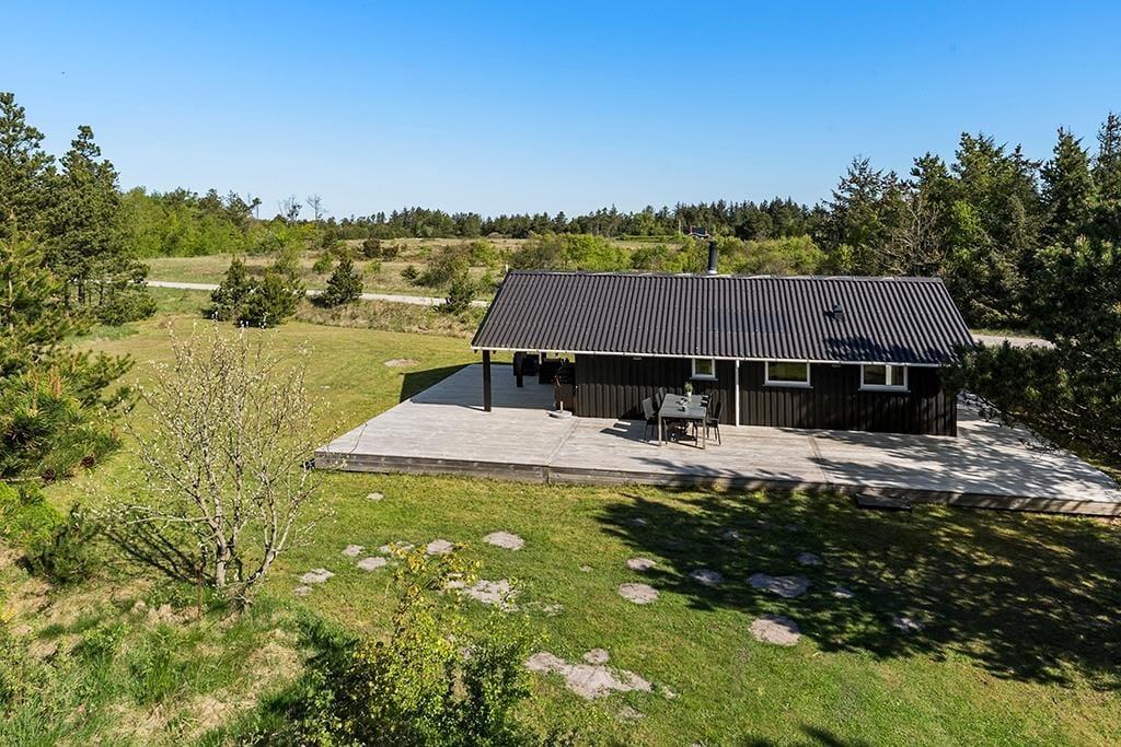Fra stuen har I direkte adgang til en skøn terrasse, hvor I kan slappe af i havemøblerne og nyde udsigten til den smukke natur. Terrassen er delvist overdækket, så I kan finde både sol og skygge i løbet af dagen. Der er masser af plads til at nyde en kop kaffe i morgensolen eller til at samles om aftenen til en grillaften under åben himmel. Den store naturgrund gør, at I kan føle jer helt ugenerede, mens I mærker den friske havluft og hører vinden suse i marehalmen.