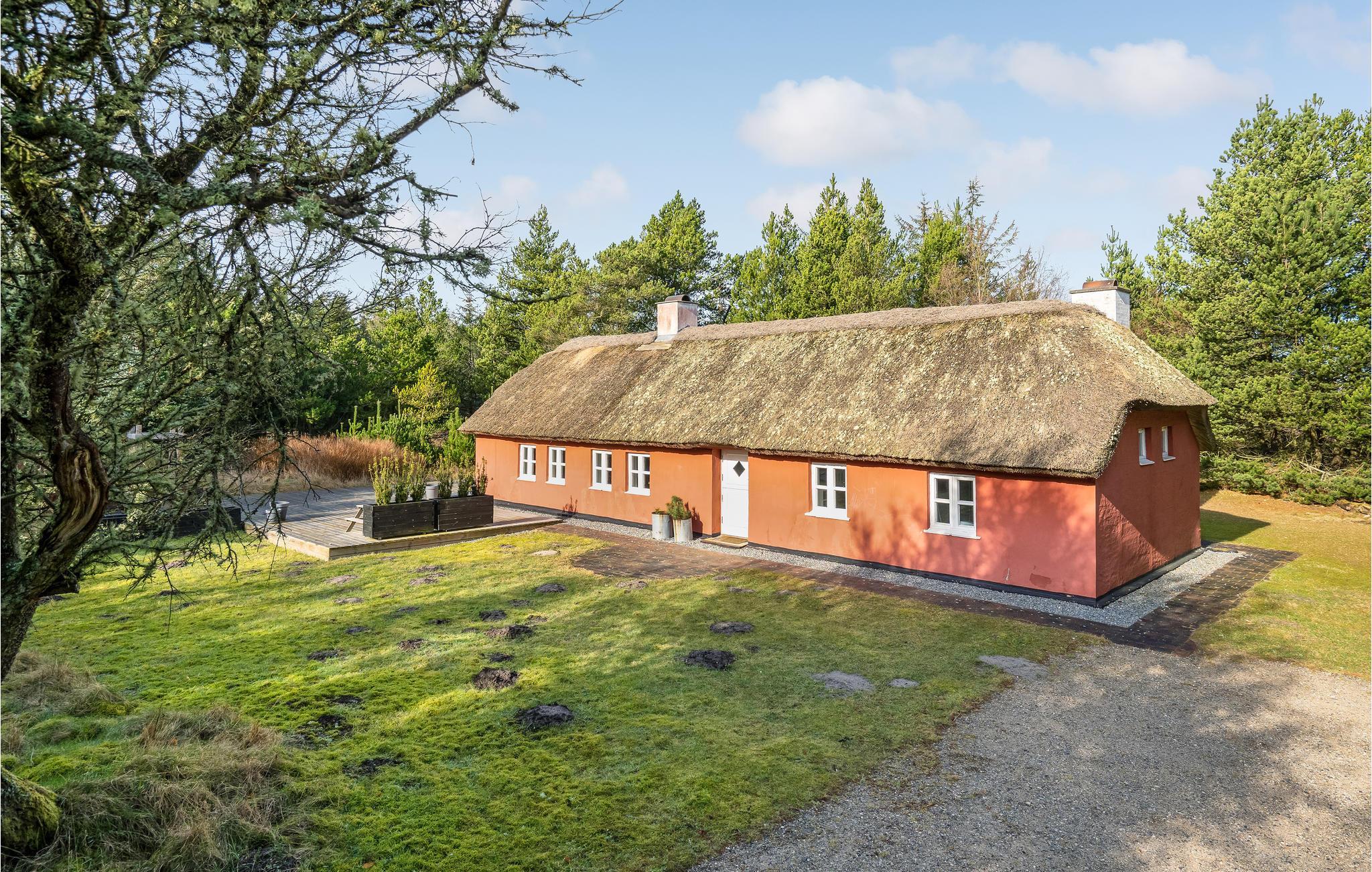 Smukt stråtækt feriehus nær skov og strand med moderne indretning og stor træterrasse til afslapning.