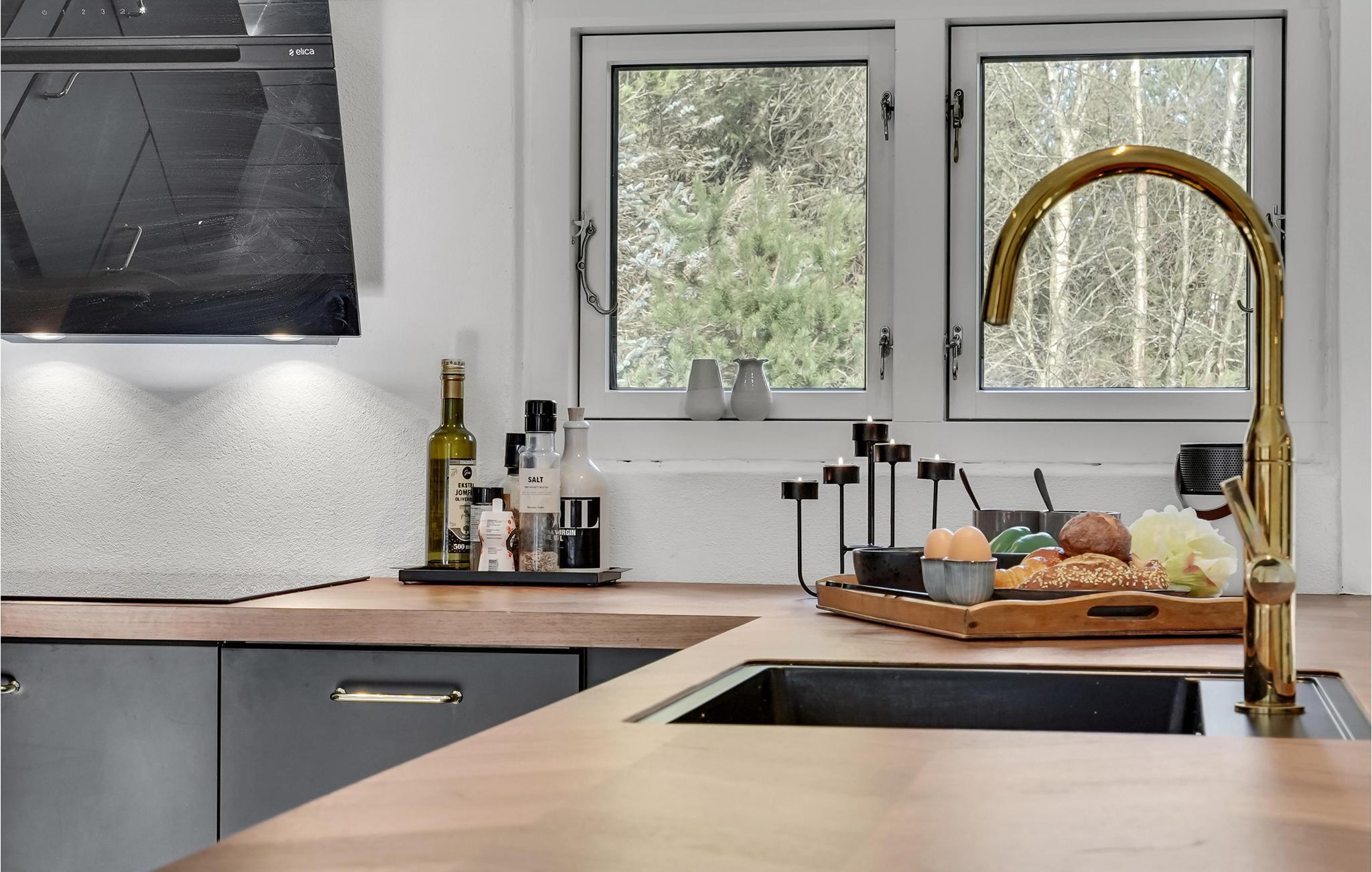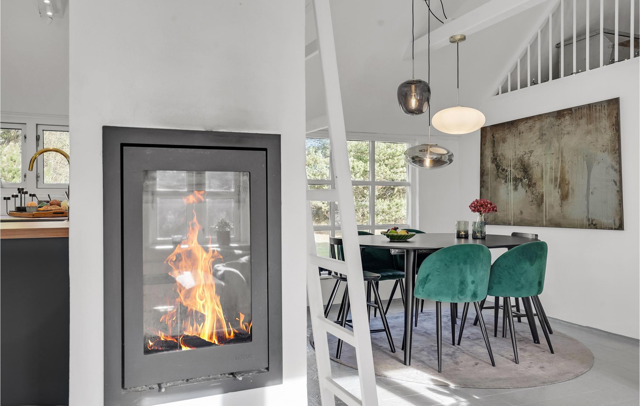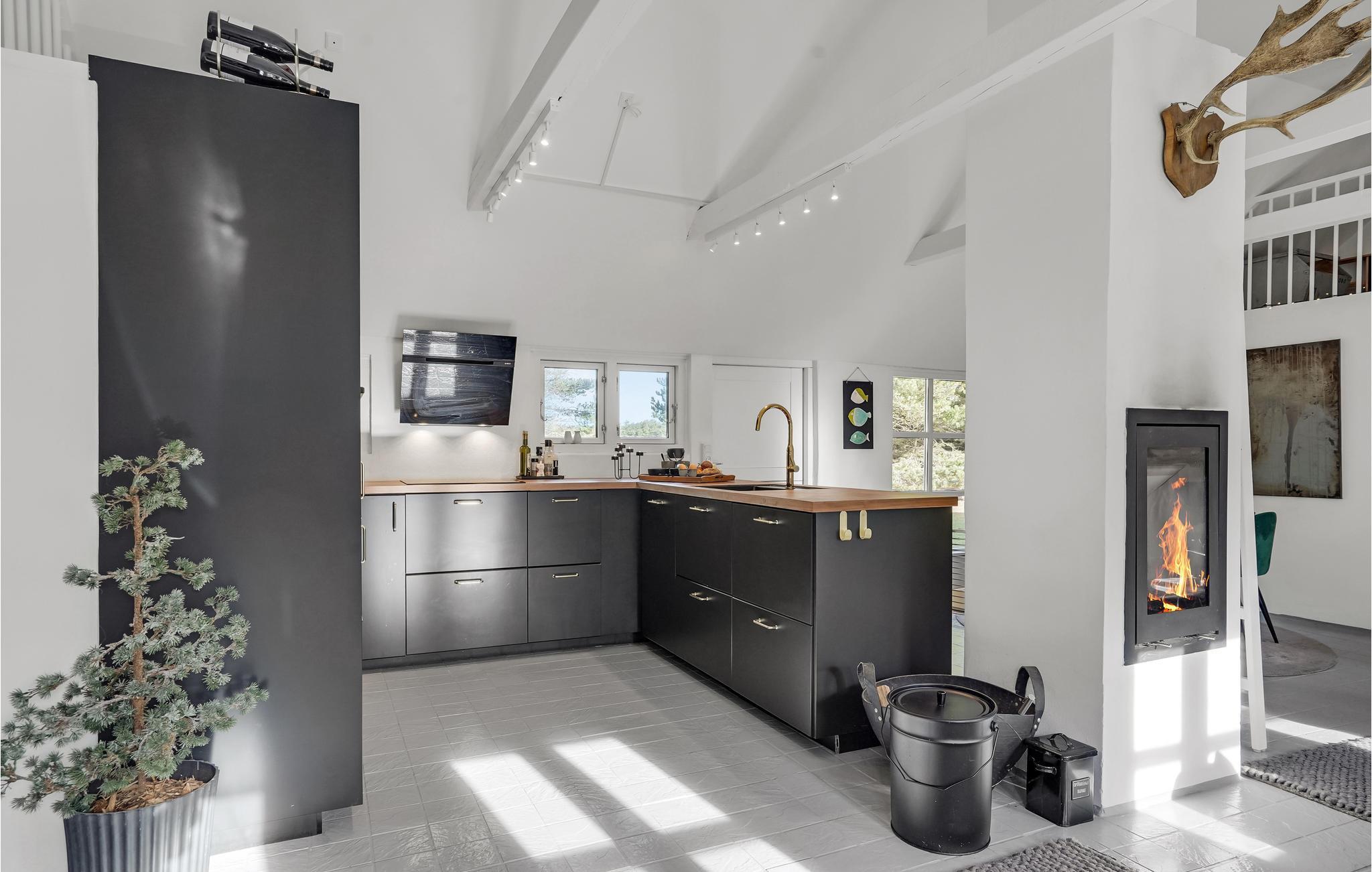 På en rolig beliggenhed, omgivet af træer og tæt på skov og strand, byder dette dejlige feriehus jer velkommen. Sammen med hele familien kan I føle jer hjemme her og blot slappe af. Komfortable og smagfulde møbler af høj kvalitet skaber sammen med de høje lofter en fantastisk atmosfære, der indbyder til madlavning, spisning, leg eller blot afslapning sammen. Den rummelige træterrasse er også et fantastisk sted at nyde solen udendørs og afslutte varme sommeraftener med en grill.