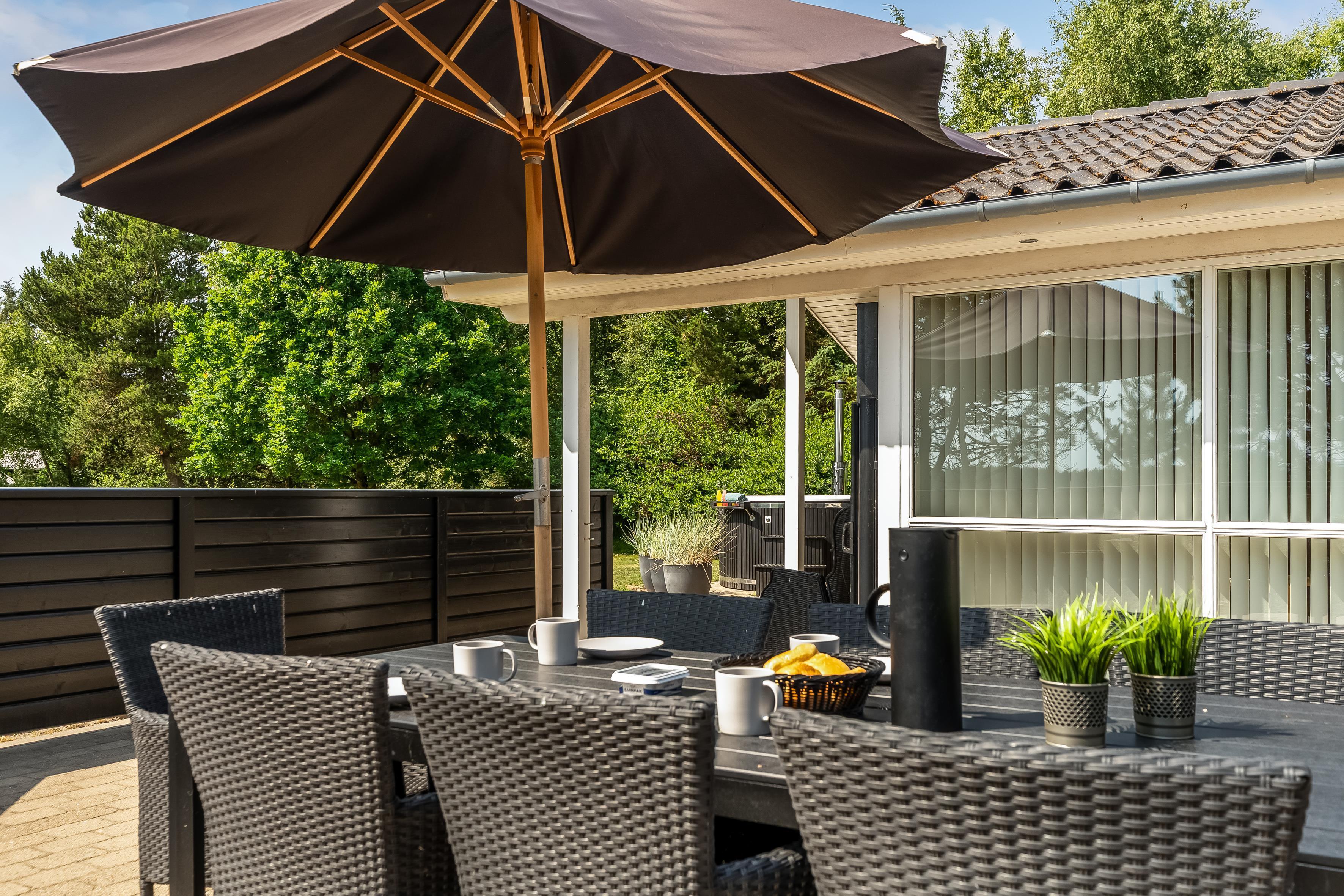Køkkenet er fuldt udstyret med moderne apparater, herunder en keramisk komfur, ovn, opvaskemaskine, køleskab og fryser med en kapacitet på 60 liter. Der er også en vaskemaskine og tørretumbler, så I kan holde jeres tøj friskt under opholdet. Udenfor kan I nyde en overdækket terrasse, hvor I kan grille og spise sammen, mens I nyder den friske luft.
