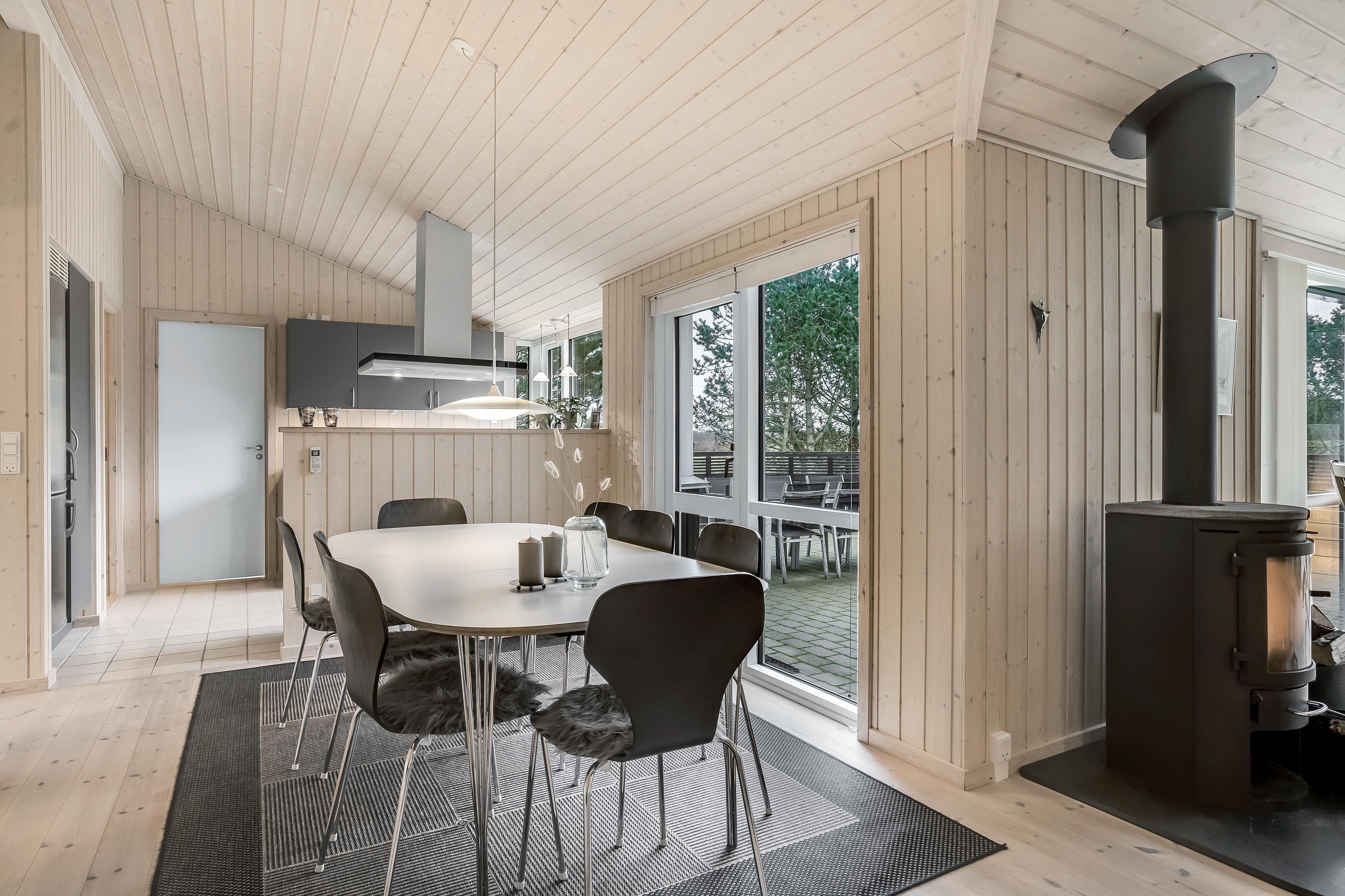 Den åbne stue er det perfekte samlingspunkt, hvor I kan nyde hinandens selskab. Her finder I en brændeovn, der skaber en hyggelig atmosfære, samt en varmepumpe og aircondition, der sikrer et behageligt indeklima året rundt. Stuen er udstyret med et fjernsyn, der tilbyder både dansk og tysk TV, samt Chromecast, så I kan streame jeres yndlingsprogrammer. Trådløst internet og radio er også tilgængeligt, så I kan holde jer opdateret og underholdt.