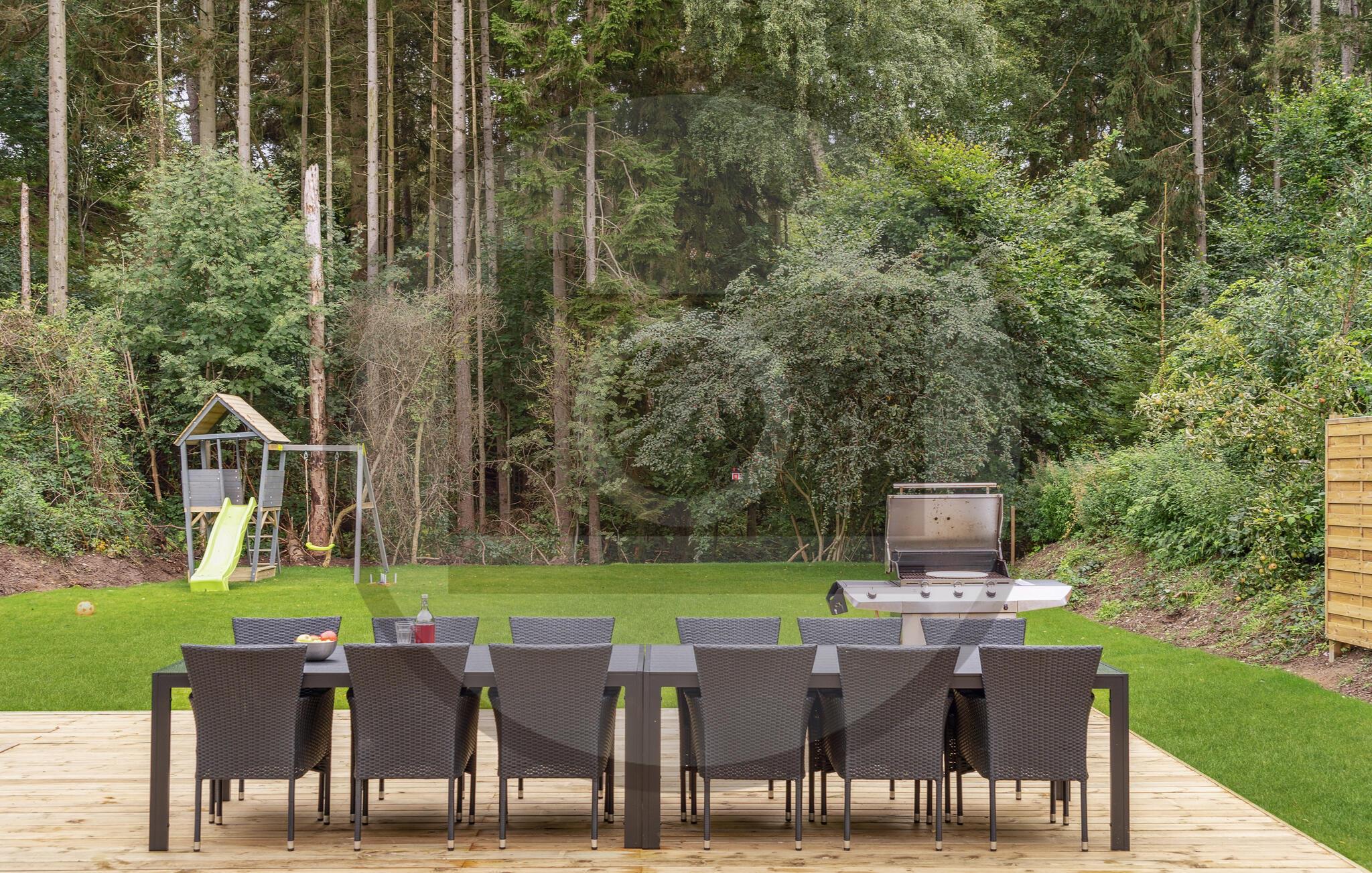 Træd udenfor og mærk, hvordan freden og roen sænker sig. Ren afslapning venter jer på den store træterrasse. Brug det rummelige spabad, slap af i saunaen eller nyd solrige timer på liggestolene. Spis udendørs, mens børnene leger i den velholdte have med gynge, legehus og rutsjebane. Det overdækkede opholdsområde giver perfekte rammer for rolige aftener med stimulerende samtaler og et godt glas vin.