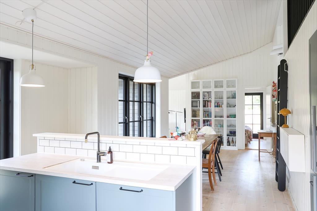 Indendørs får du kombinationen af hyggelig sommerhusstemning og en mere moderne indretning. Der er højt til loftet, og det giver en ekstra følelse af rummelighed og et godt lys. Hvis du elsker at lave mad, så er der god plads til hyggeligt samvær under madlavningen i køkkenet der er i åben forbindelse med spisepladsen. Her kan alle samles om det gode måltid eller hyggeligt samvær med spil og et godt glas vin.