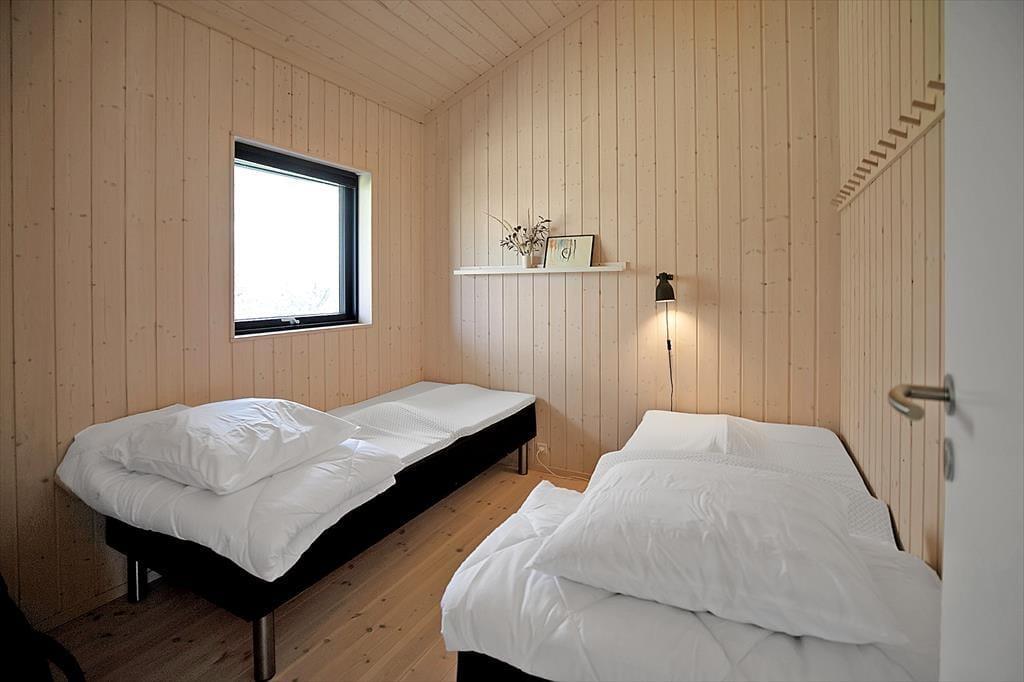 Sommerhuset er beliggende på en skøn placering kun 150 meter fra vandet. Huset er indrettet med åbent køkken med kombineret spise- og dagligstue. I huset er der 3 værelser - de to med to enkeltsenge og det tredje med dobbeltseng. Her er et stort badeværelse, samt et gæstetoilet. Huset har en stor, åben terrasse, plus en overdækket spisekrog. Huset er omgivet af en dejlig naturgrund, hvorfra I kan se fjorden.