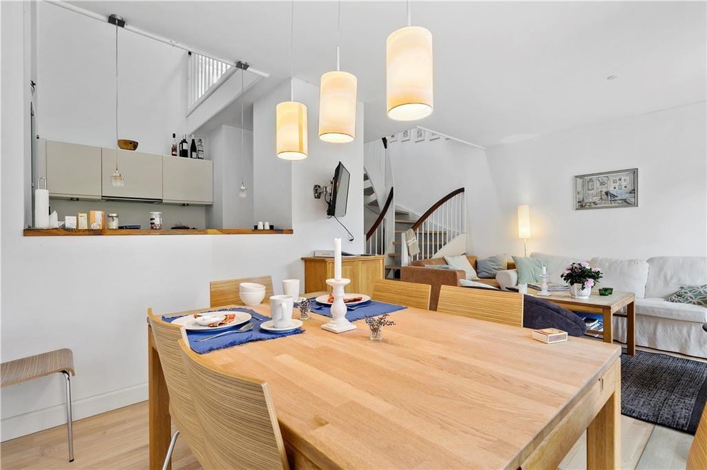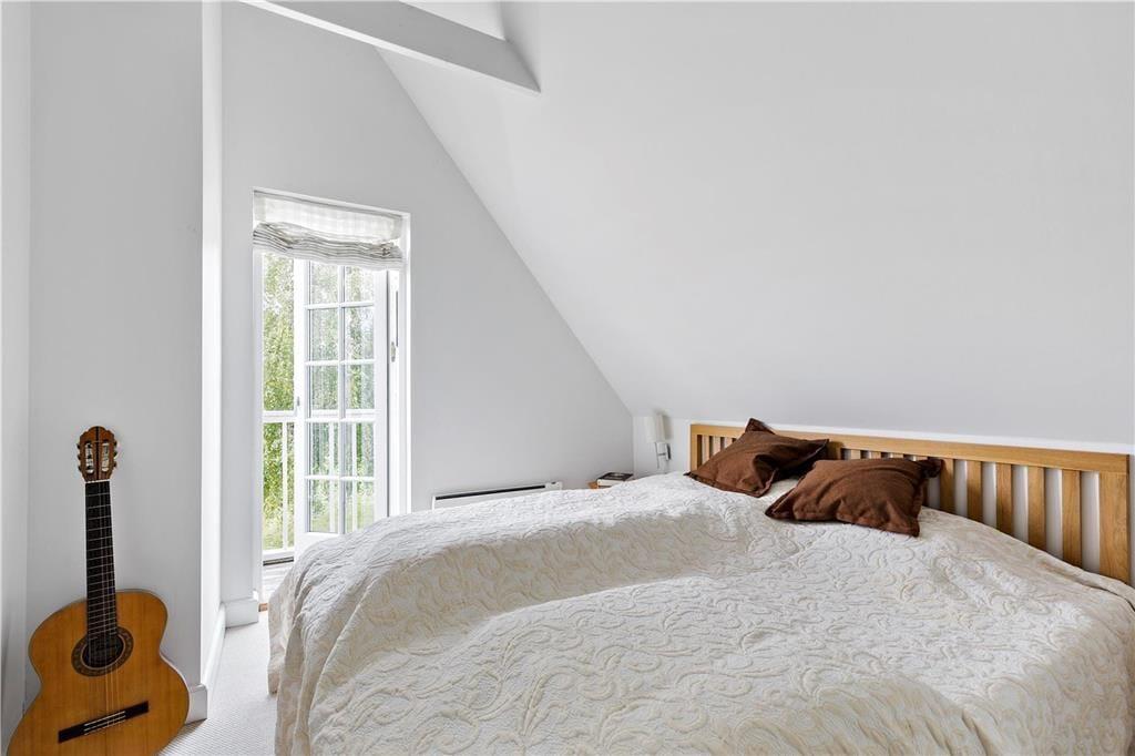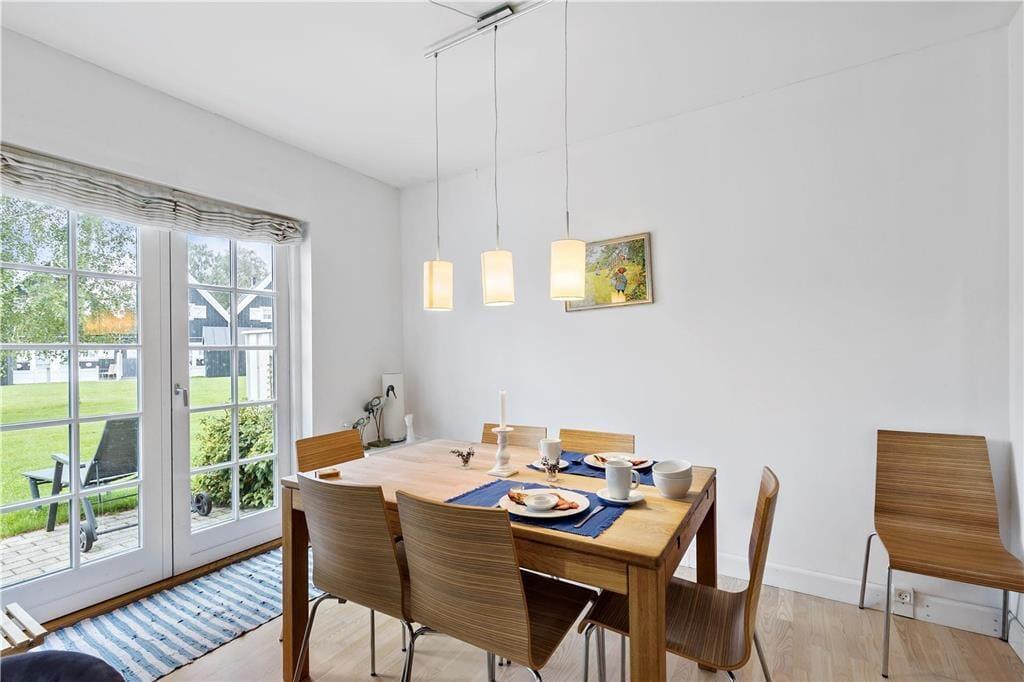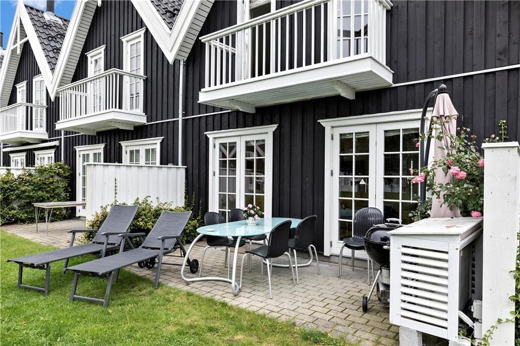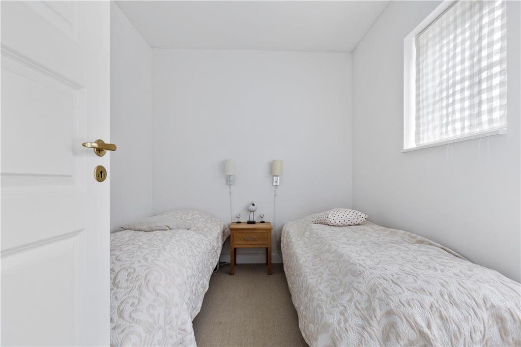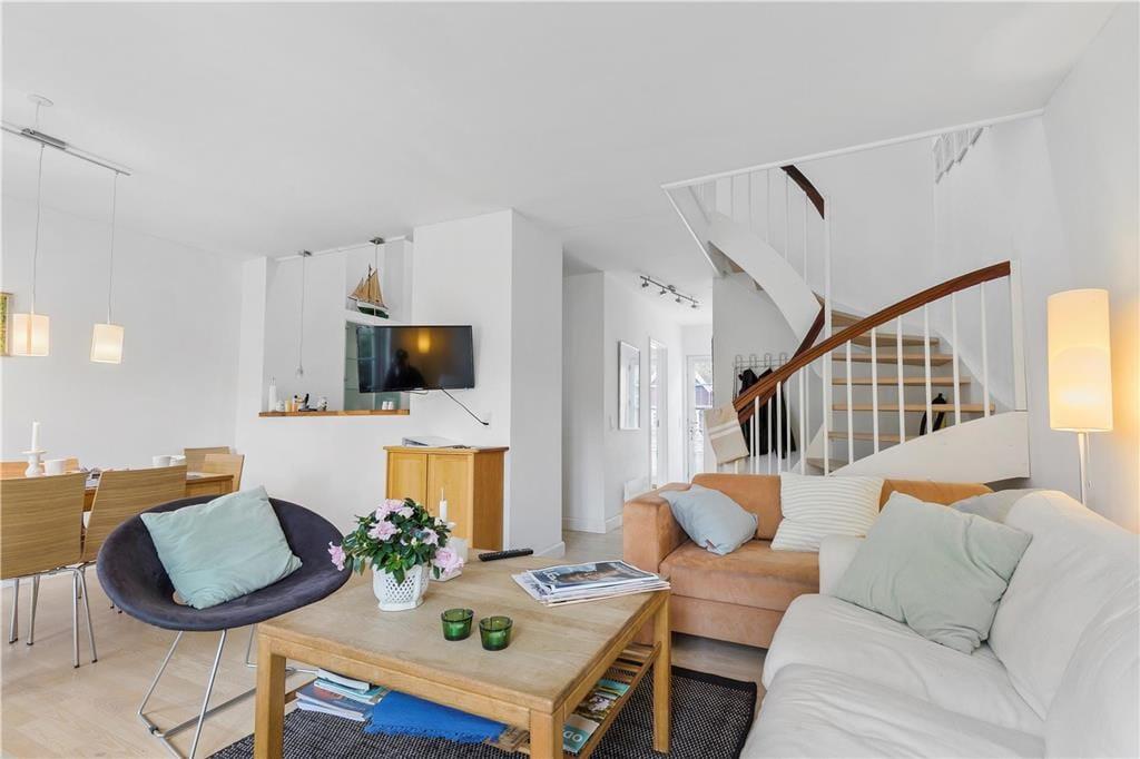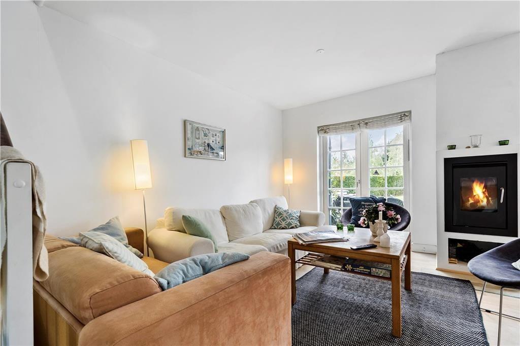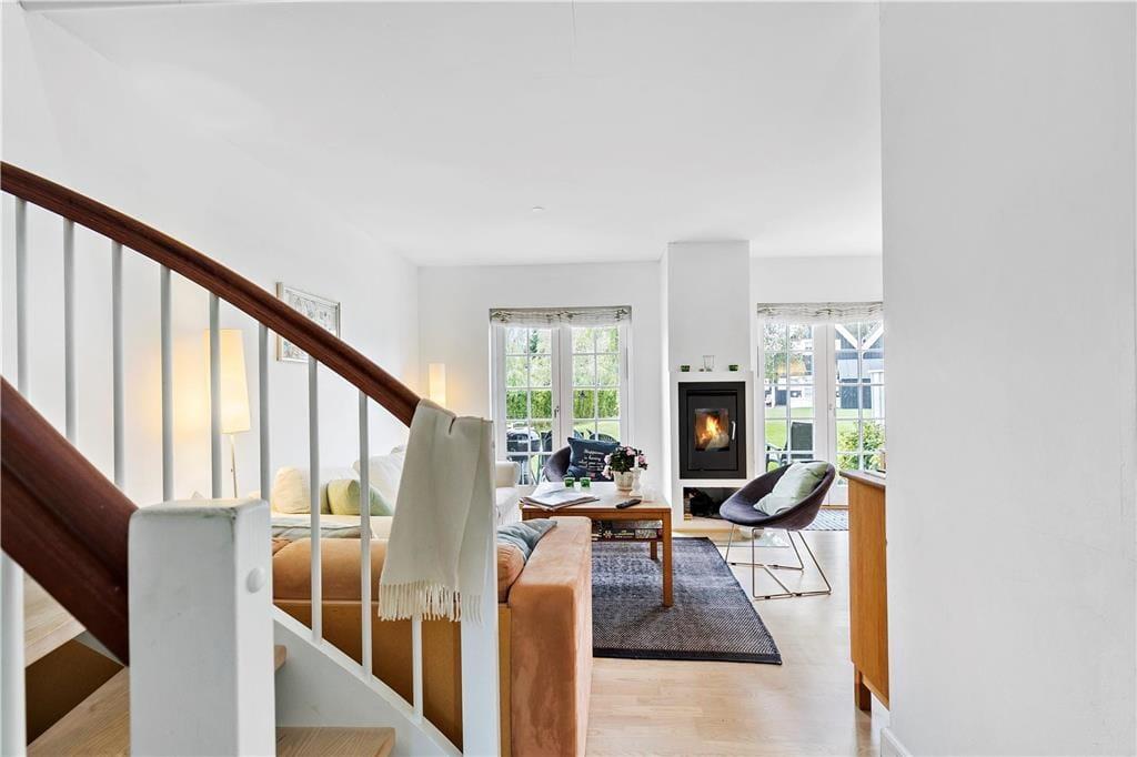 I stueetagen er der soveværelse, badeværelse, åbent køkken og skøn stue med brændeovn. Fra stuen er der udgang til dejlig åben terrasse. På første sal er der lækkert badeværelse med spabad og sauna samt 2 soveværelser med udgang til balkon. Ved indgangen foran huset er der også en terrasse. Dettehus ligger for enden af en række.