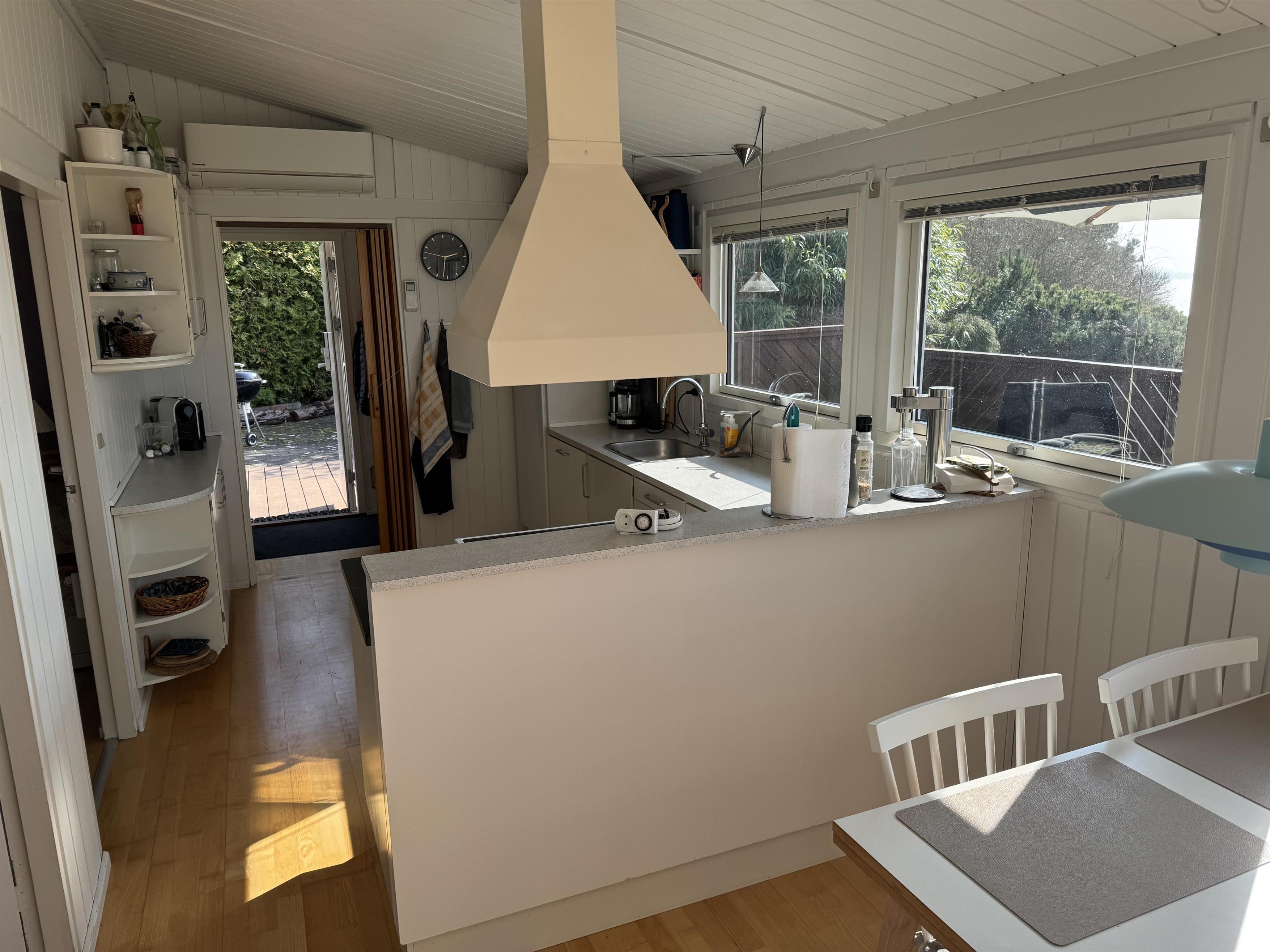 Køkkenet ligger i åben forbindelse med stuen og er udstyret med alt, hvad I har brug for – selvfølgelig også opvaskemaskine.