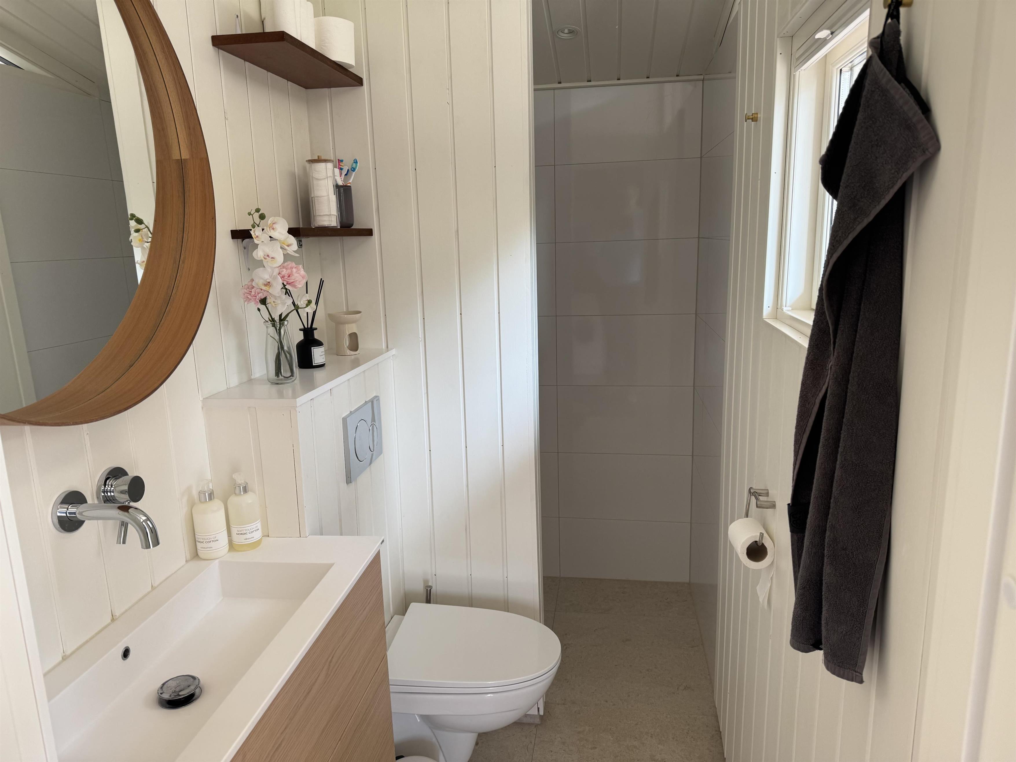Badeværelset har toilet og brusebad og varme i gulvet. Her er også en vaskemaskine.