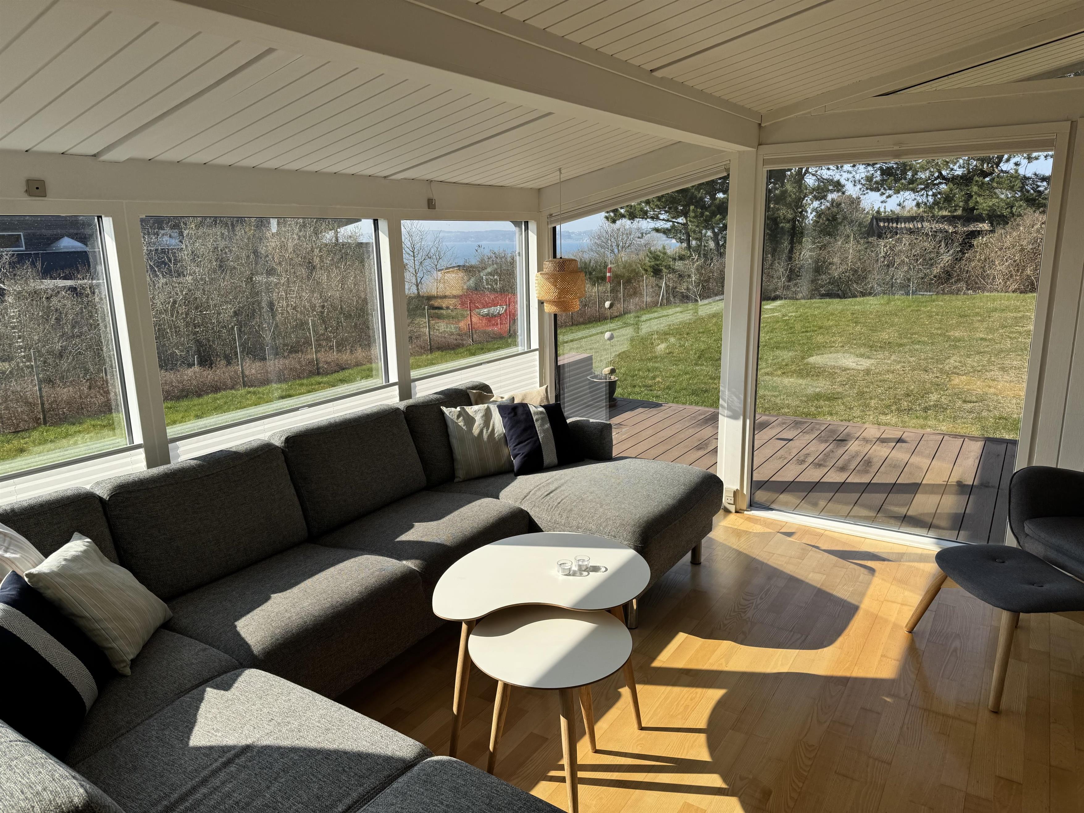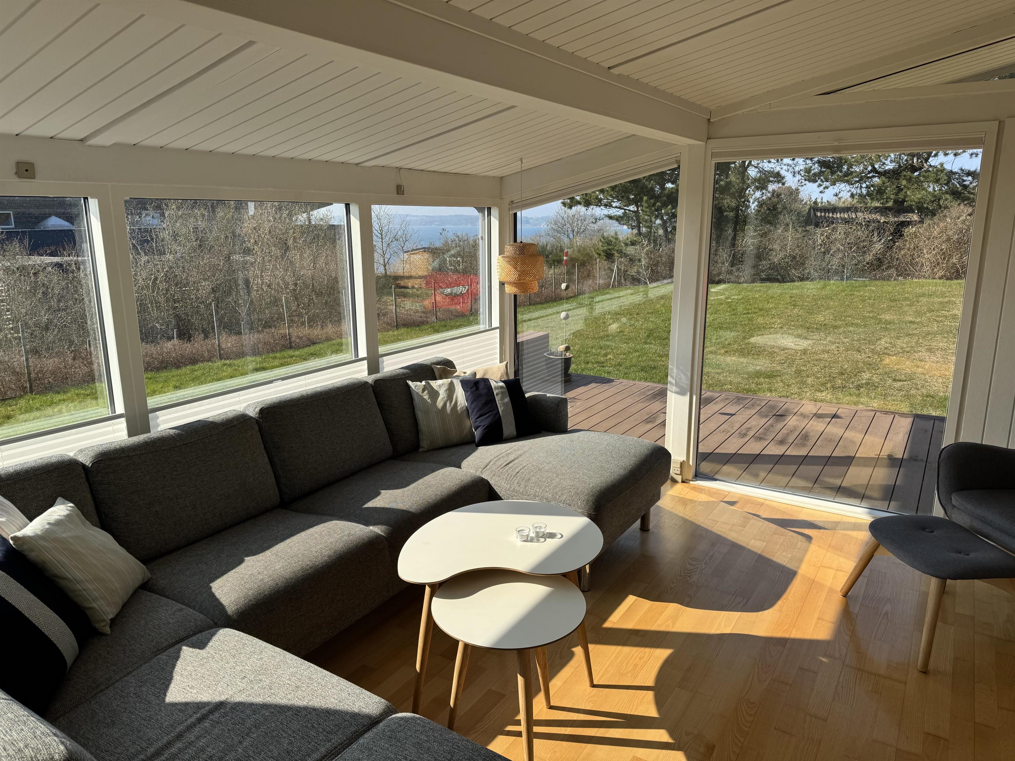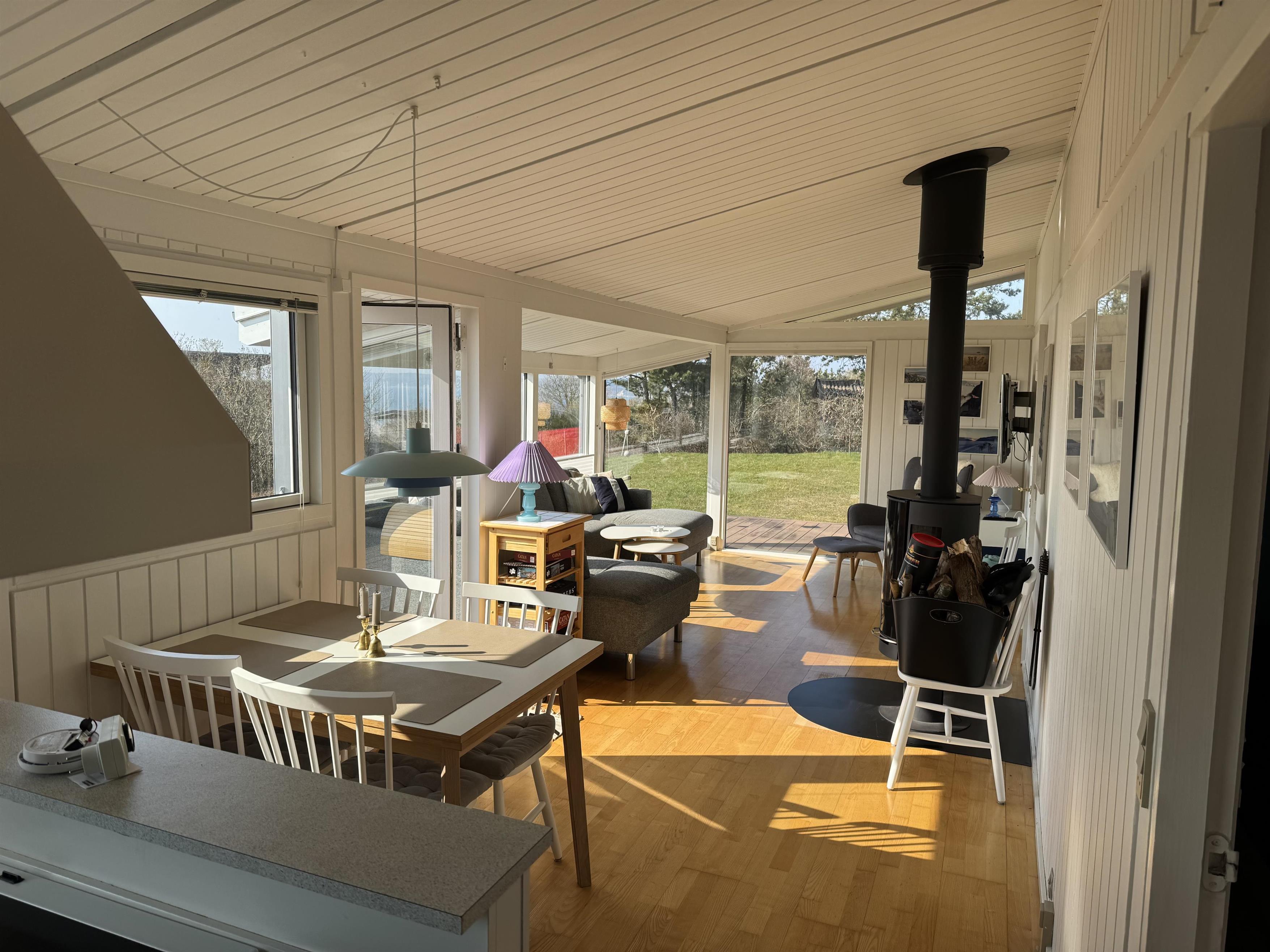 Fra stuens store vinduesparti er der udsigt over grunden og vandet. Stuen har brændeovn, og huset er også udstyret med varmepumpe og elvarme. Her er Chromecast og gratis internet. Her er også en barnestol til rådighed.