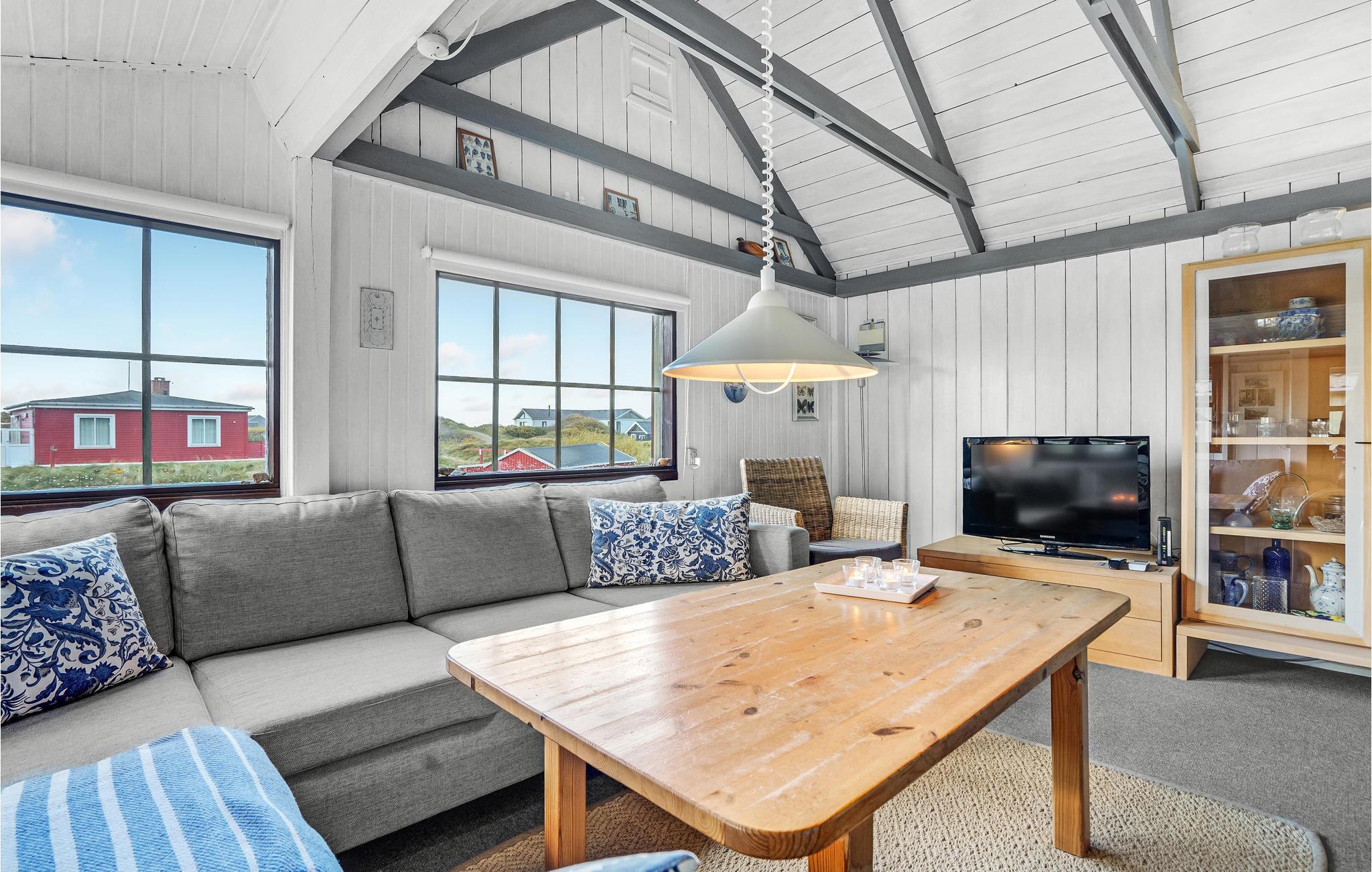 Dette hyggelige træhus er placeret på en højtliggende klitgrund i Rindby, tæt ved stranden.
