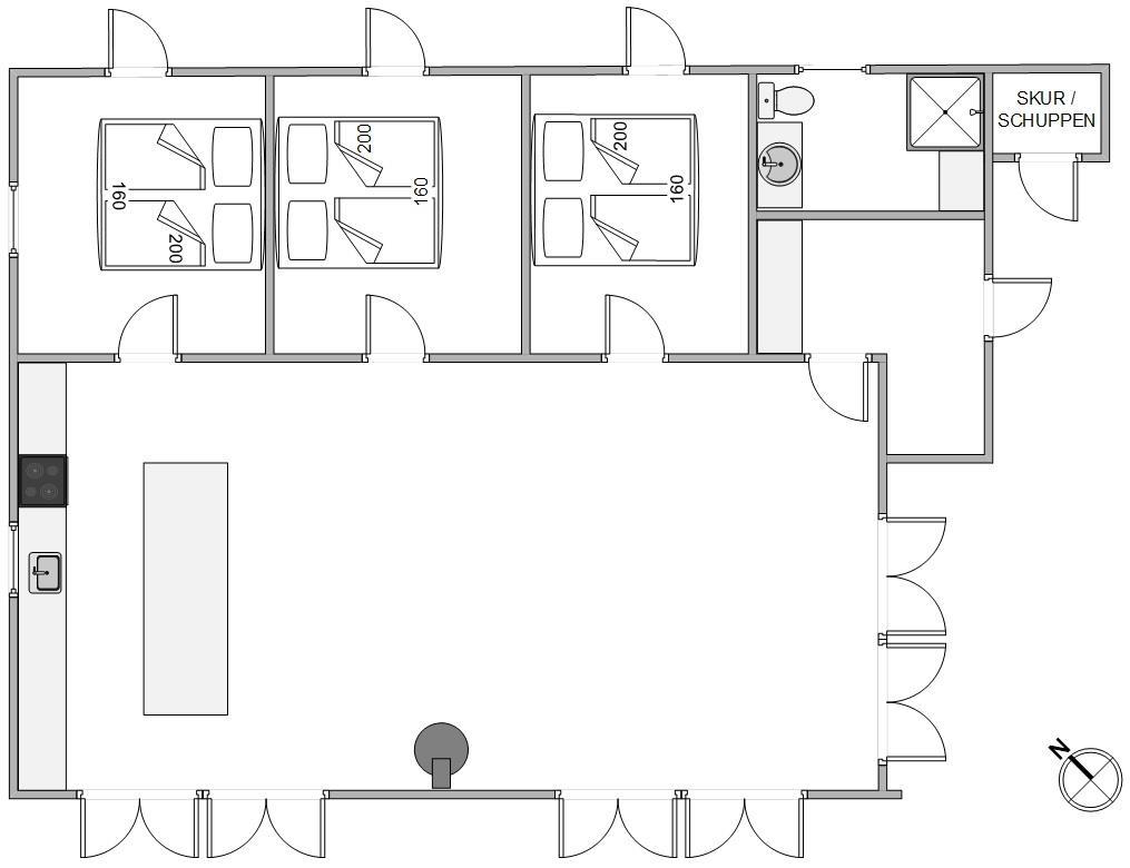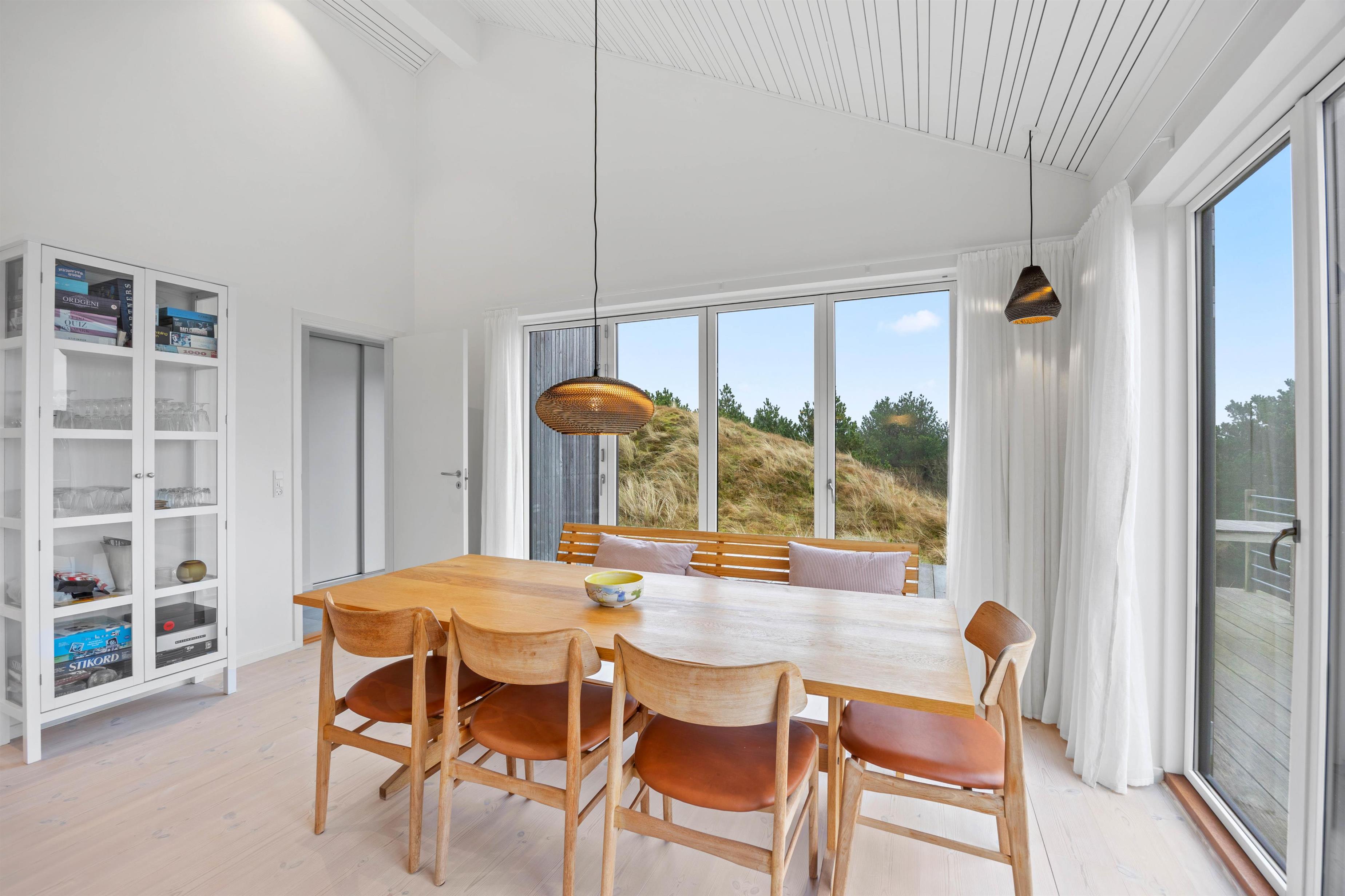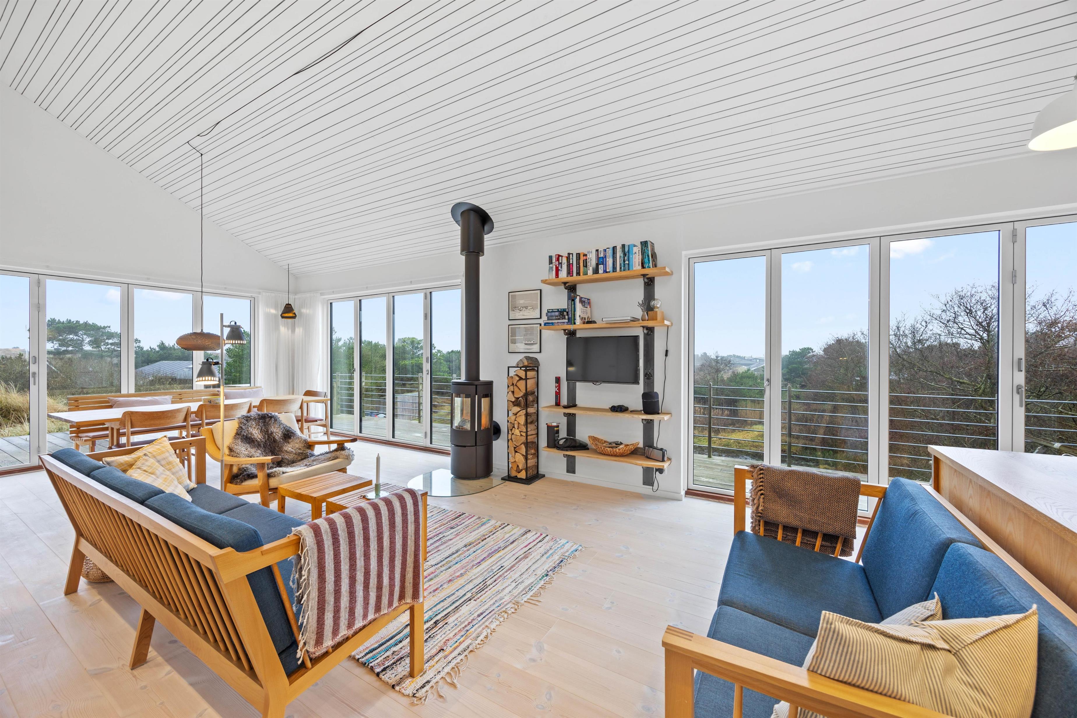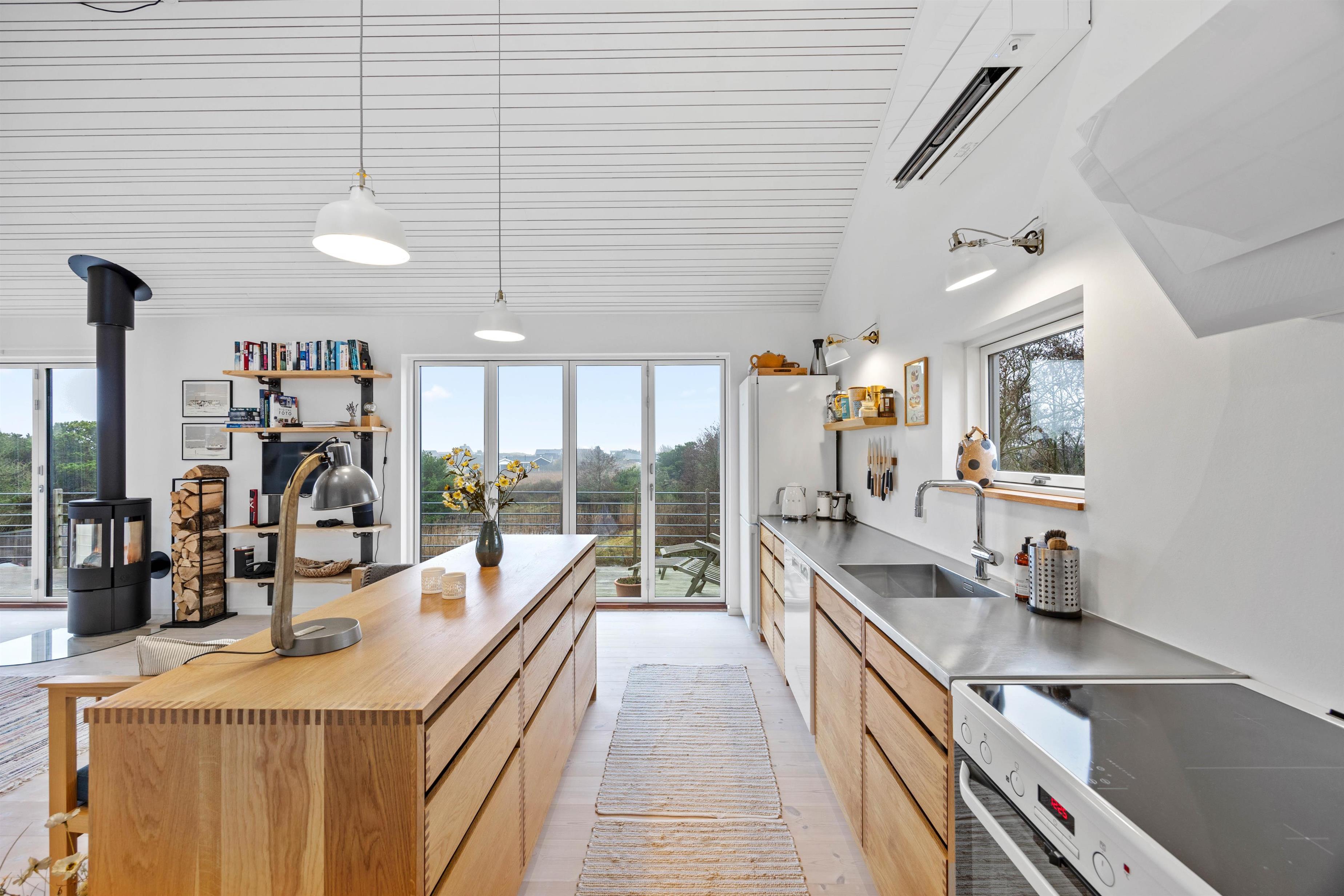Allerede ved ankomsten til sommerhuset på Store Klit 8 i Rindby mærker I hyggen og den varme atmosfære. Det åbne opholdsrum i typisk skandinavisk stil er indbydende og udstyret med komfortable siddepladser. Her kan I slappe af med et glas vin foran brændeovnen og se en god film. Der er også en energibesparende varmepumpe til rådighed.