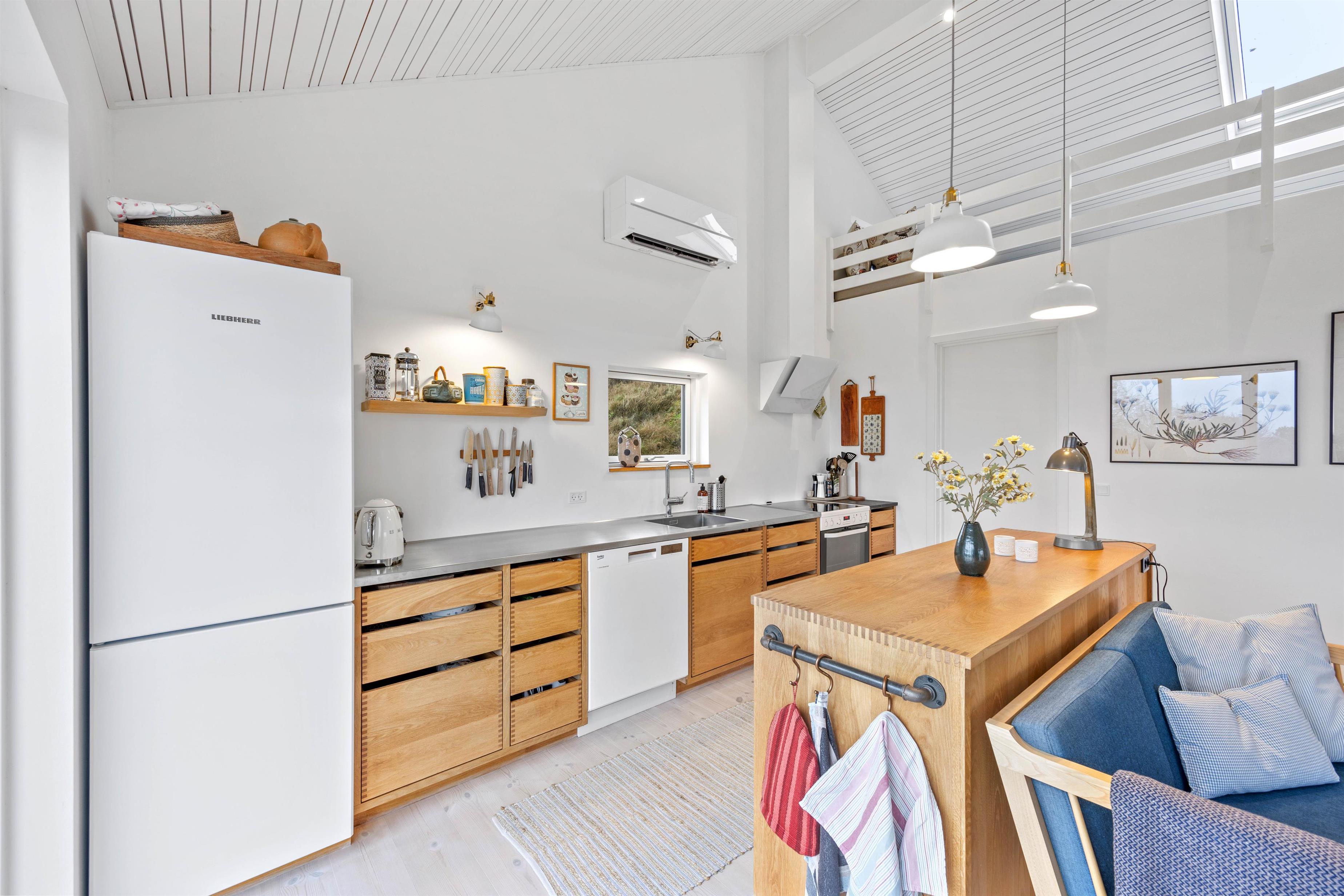 Det veludstyrede køkken indbyder til madlavning og har bl.a. en opvaskemaskine, en køle-/frysekombination og en induktionskogeplade. Badeværelset er moderne og har bruser samt gulvvarme. Derudover råder sommerhuset over en tørretumbler og vaskemaskine, hvilket gør det praktisk og bekvemt.