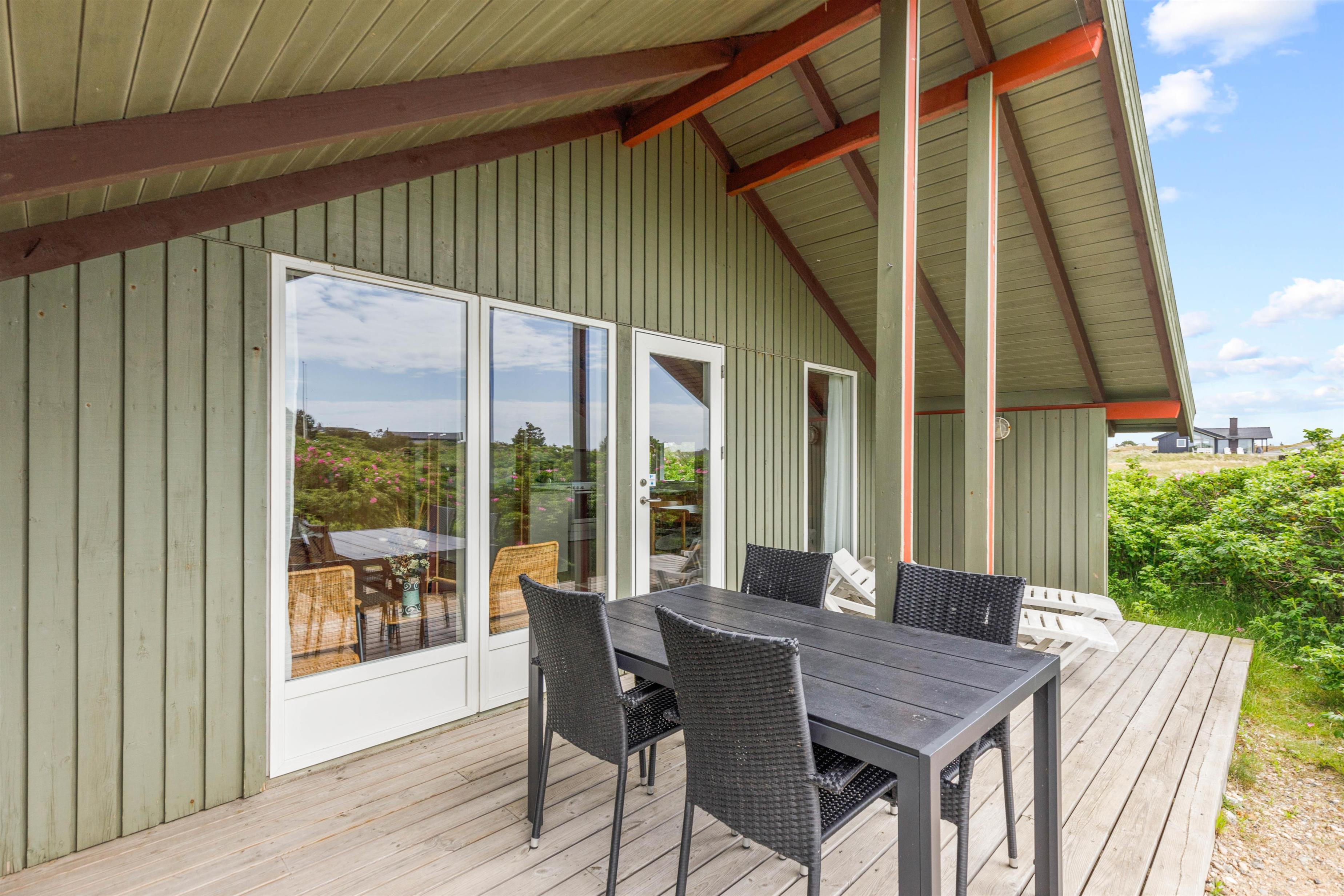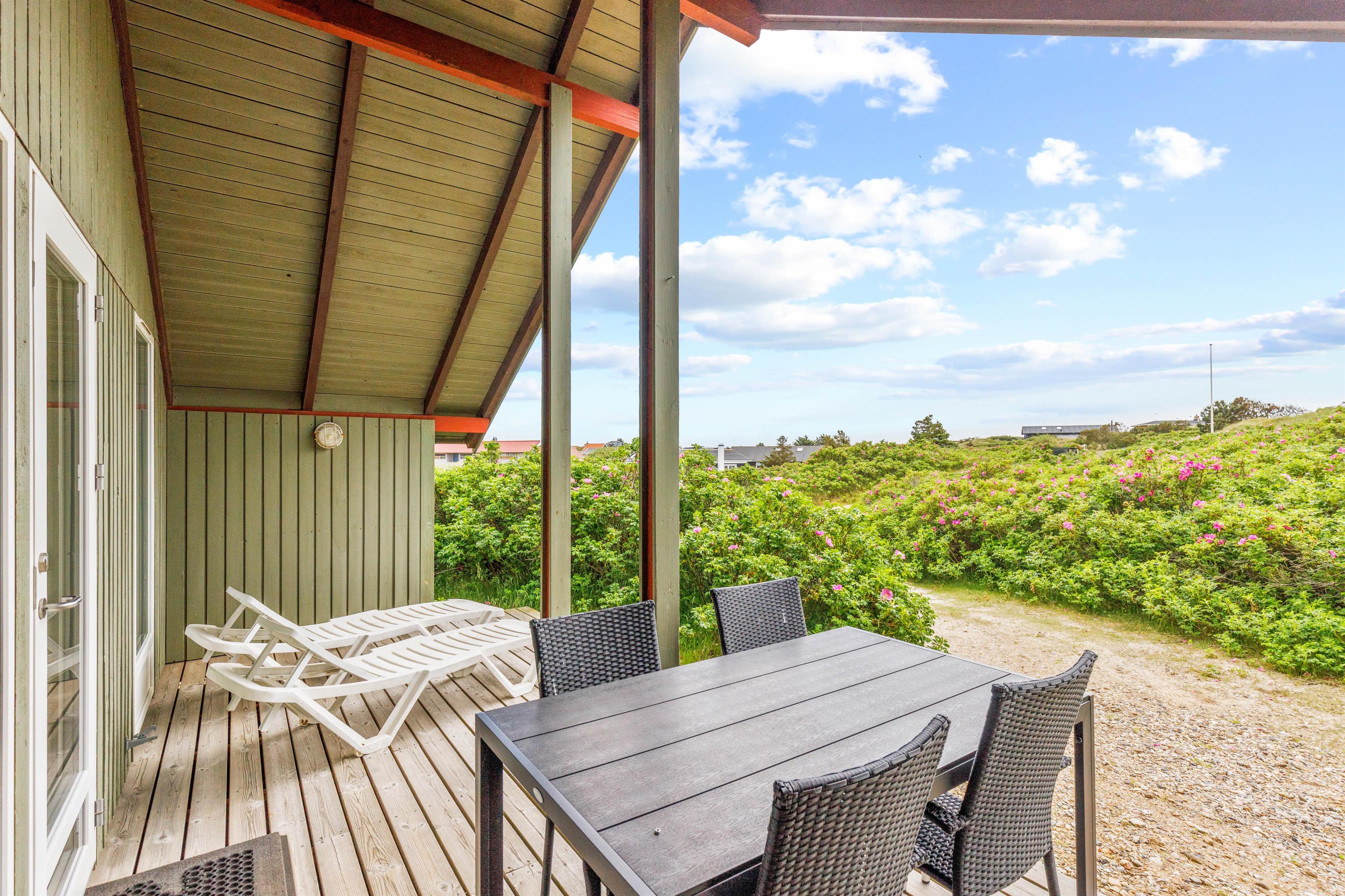 Feriehusets sydvendte terrasse er indrettet med havemøbler, solvogne og en grill. Her kan I læne jer tilbage og nyde ferien i fulde drag. Læg jer til rette på solvognen, og nyd den friske, salte havluft og duften af klitroserne der omkranser feriehuset. Når dagen går på hæld, kan I tænde op i grillen og nyde en god middag under overdækningen mens I planlægger næste dags aktiviteter og udflugter.