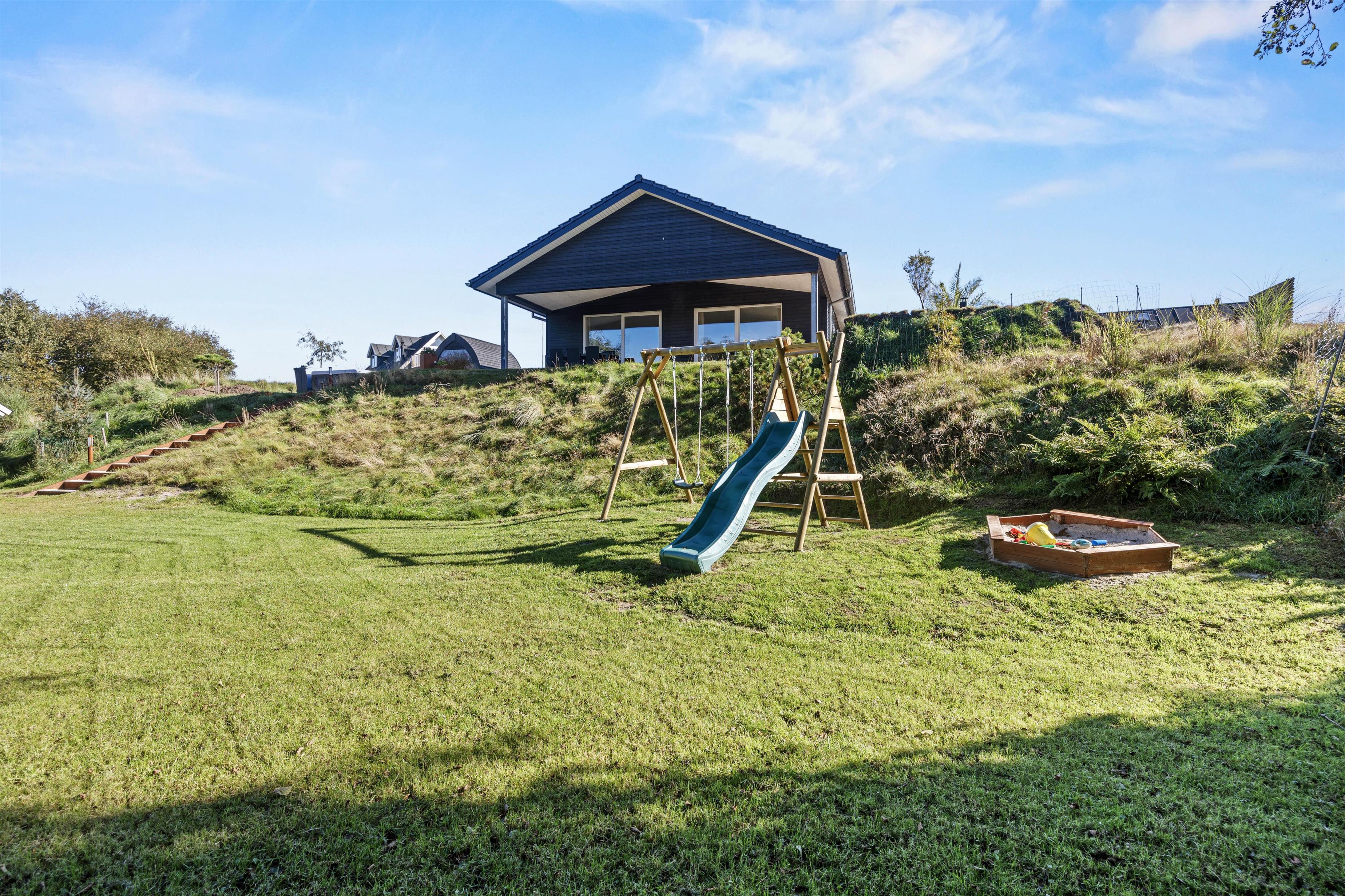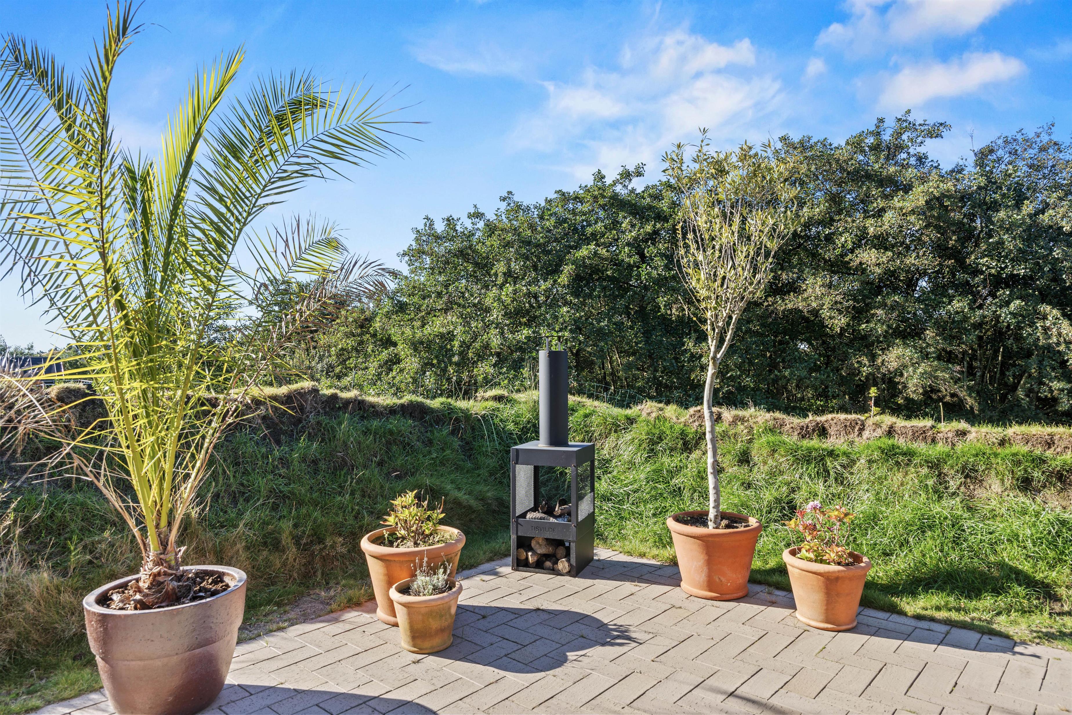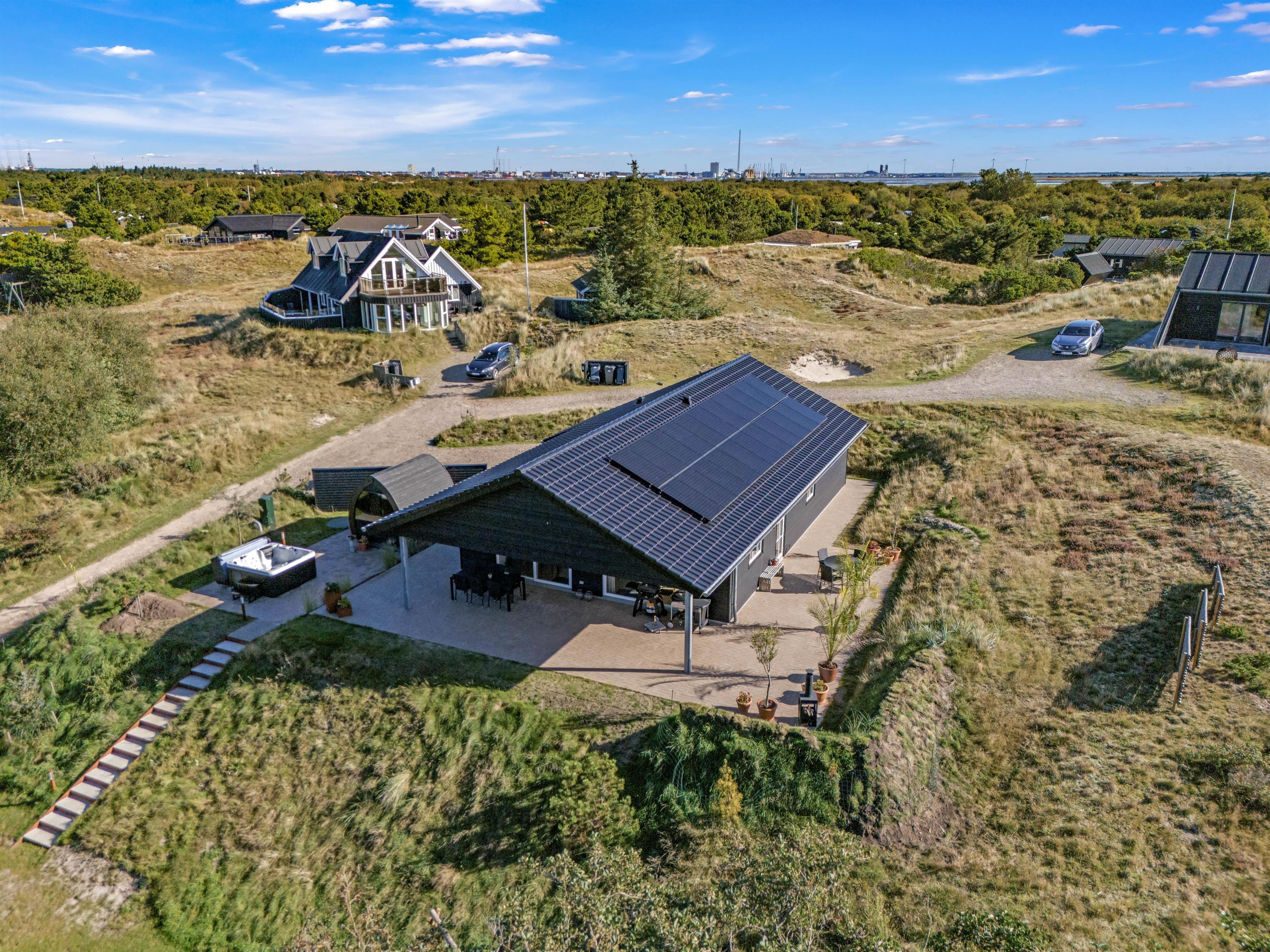 Udeområdet byder på en skøn terrasse rundt om feriehuset, hvor der både er et åbent og et overdækket afsnit. Den skønne naturgrund ligger på en bakketop med skøn udsigt til store vidder med lyngklædt hede og bølgende klitlandskab. Her kan I dase i havemøbler og solvogne og grille, mens solen går ned, og naturligvis nyde livet i den varme udespa til 6 personer.