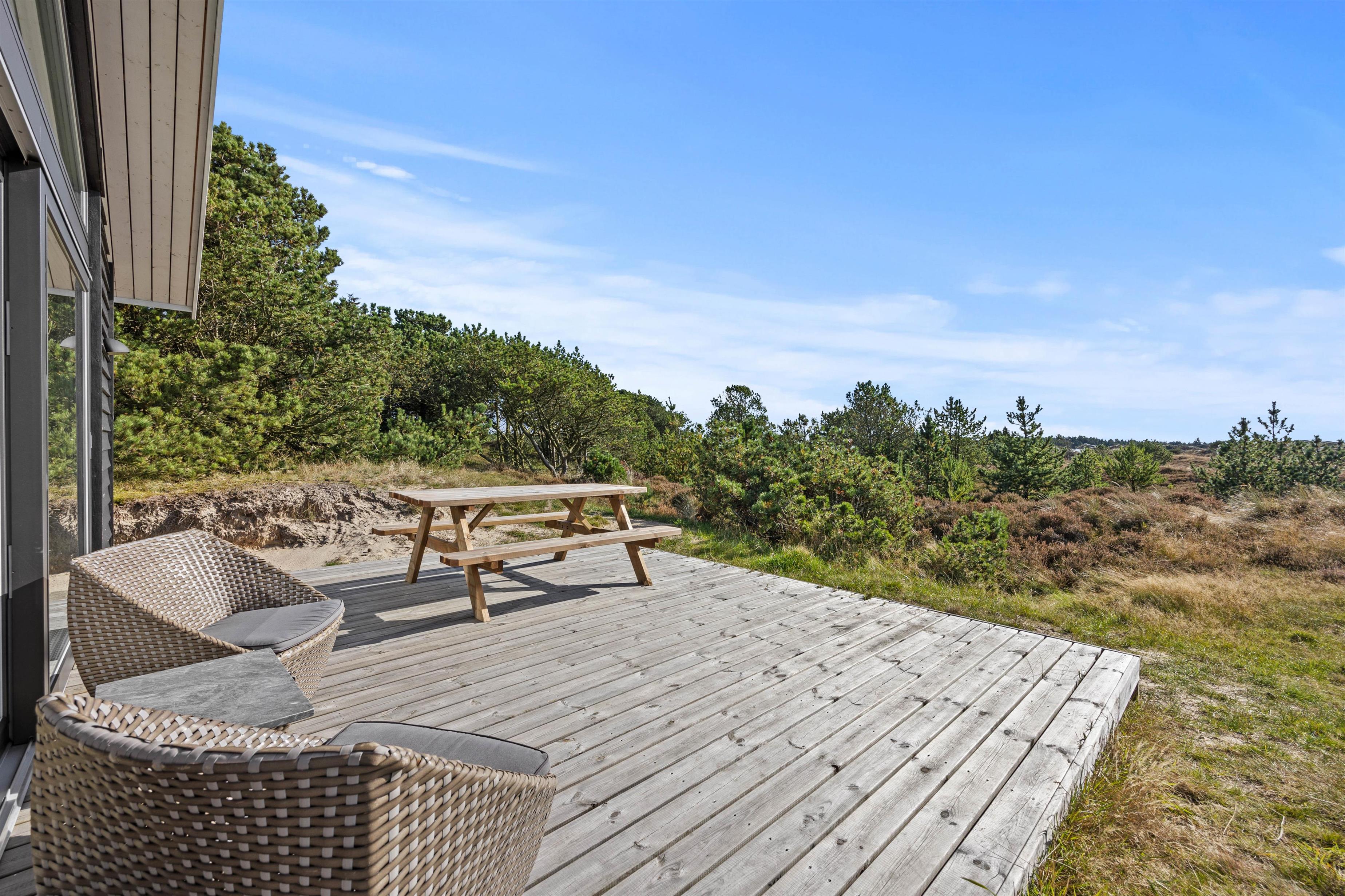 Med en grund på godt 7.650 kvadratmeter og en åben terrasse, udstyret med havemøbler, grill og masser af plads, er der rig mulighed for at nyde udendørslivet. Tag solbad i de komfortable liggestole, eller træk jer tilbage i havemøblerne med en kølig drink eller en kop kaffe, imens børnene går på opdagelse på naturgrunden, som inviterer til afslapning og leg for både børn og hund.