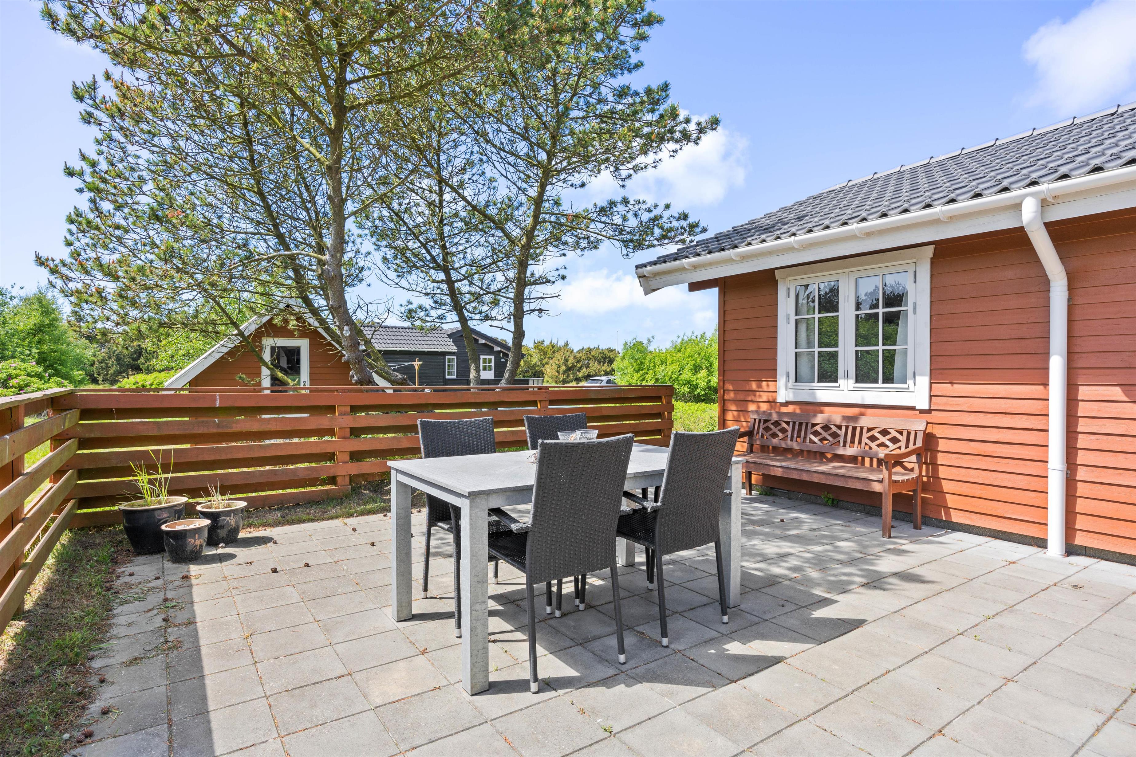 Fra stuen er der direkte adgang til sommerhusets delvist afskærmede terrasse, som indbyder til afslappende stunder i den friske havluft. Her kan I nyde morgenkaffen, slappe af i havemøblerne eller samle familien til fælles måltider under åben himmel. Til de lune sommeraftener står grillen klar – perfekt til hyggelige grillaftener med venner og familie.